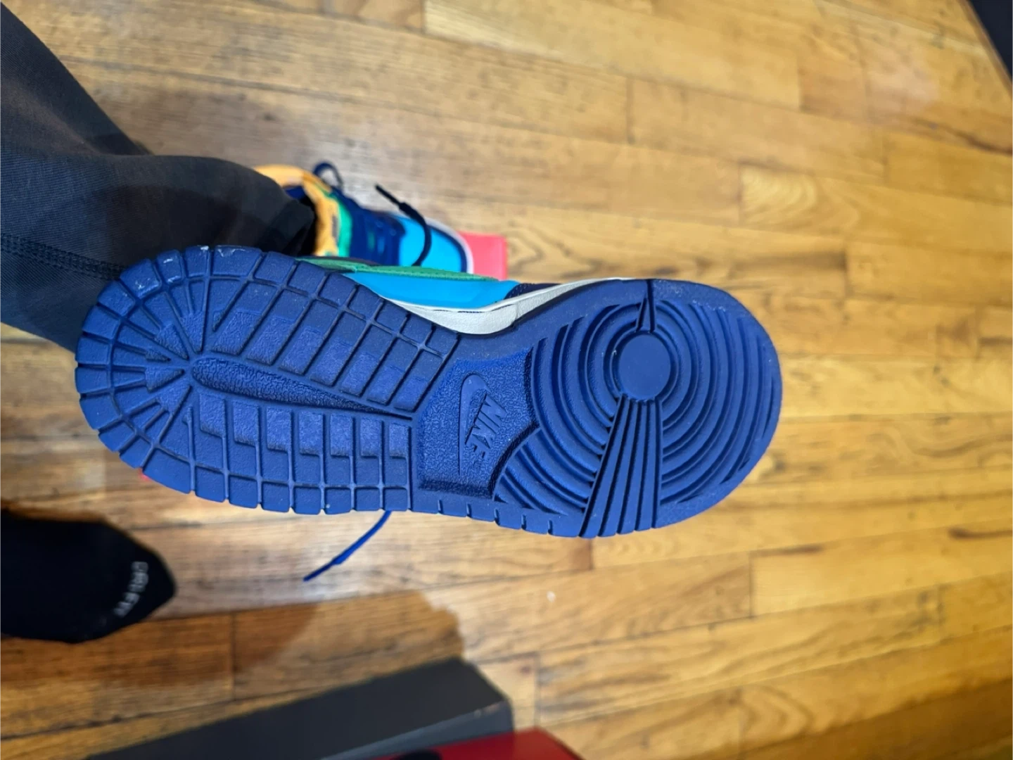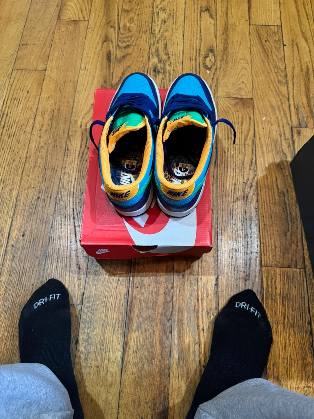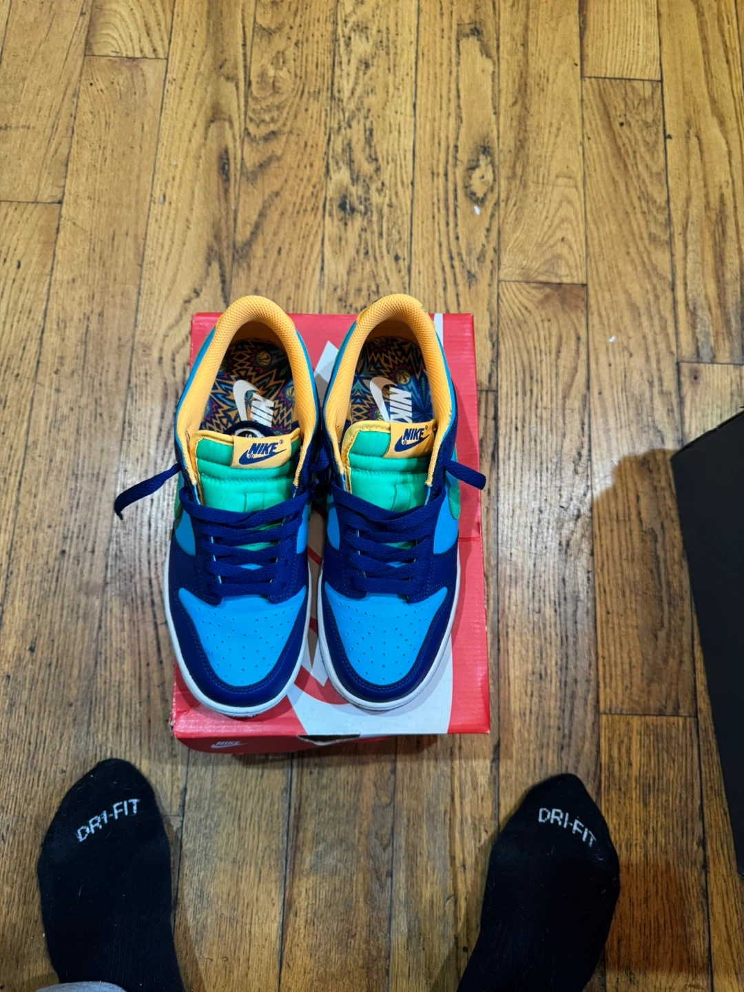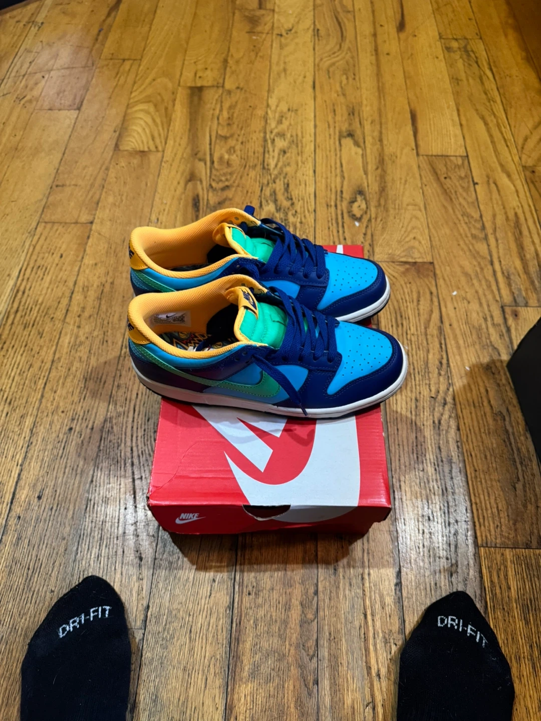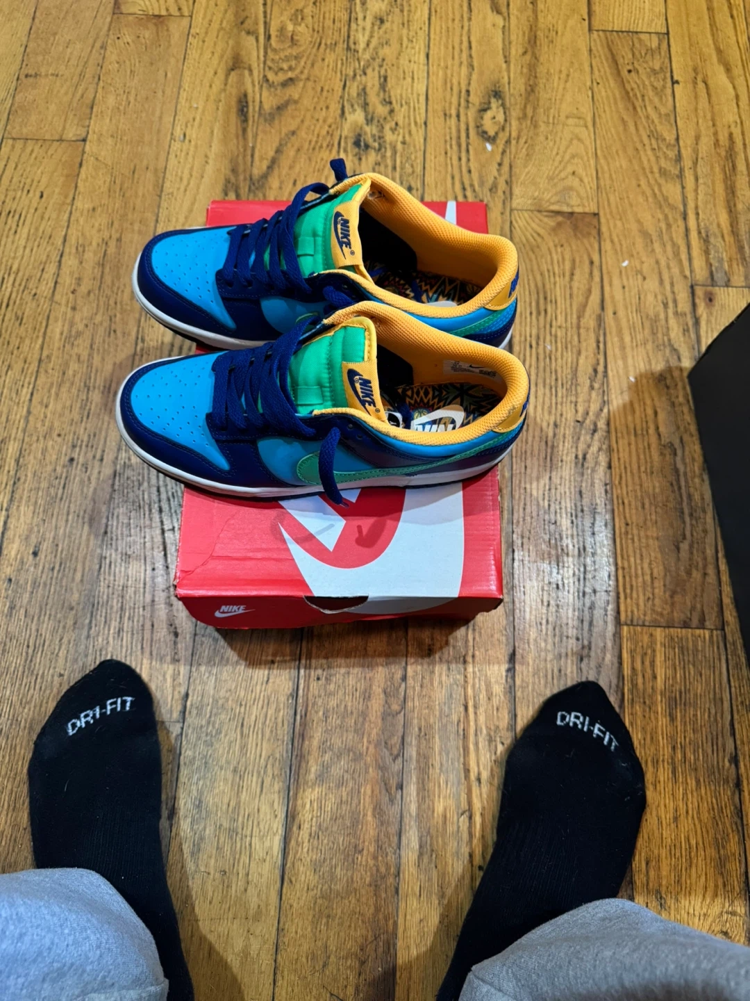 15Selling a pair of Nike Dunk Low (GS) in a cool blue and electric algae colorway! These are a size 6Y for boys. They come with the original box. Perfect for a stylish kid! Just tried on.