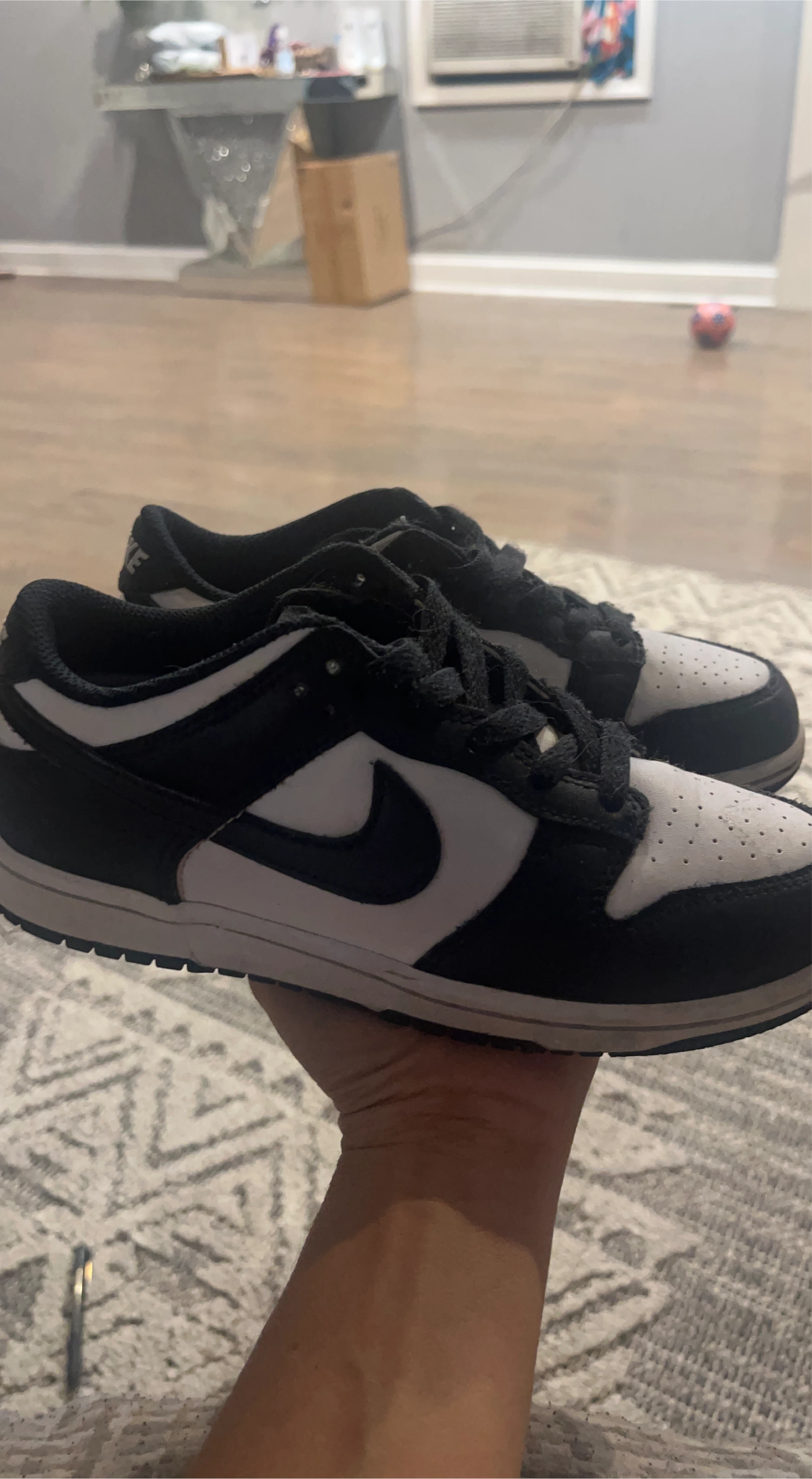 Selling a pair of Nike Dunk Lows in the classic Panda colorway! They are a size US 2.5. They show some signs of wear but are still in good condition!