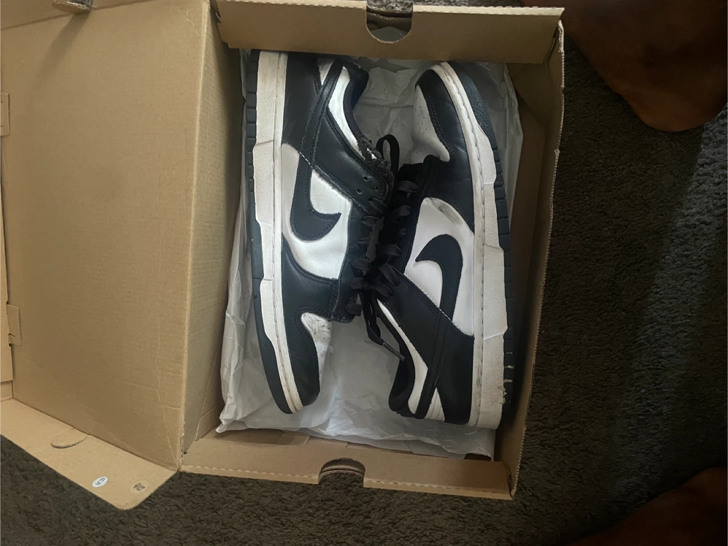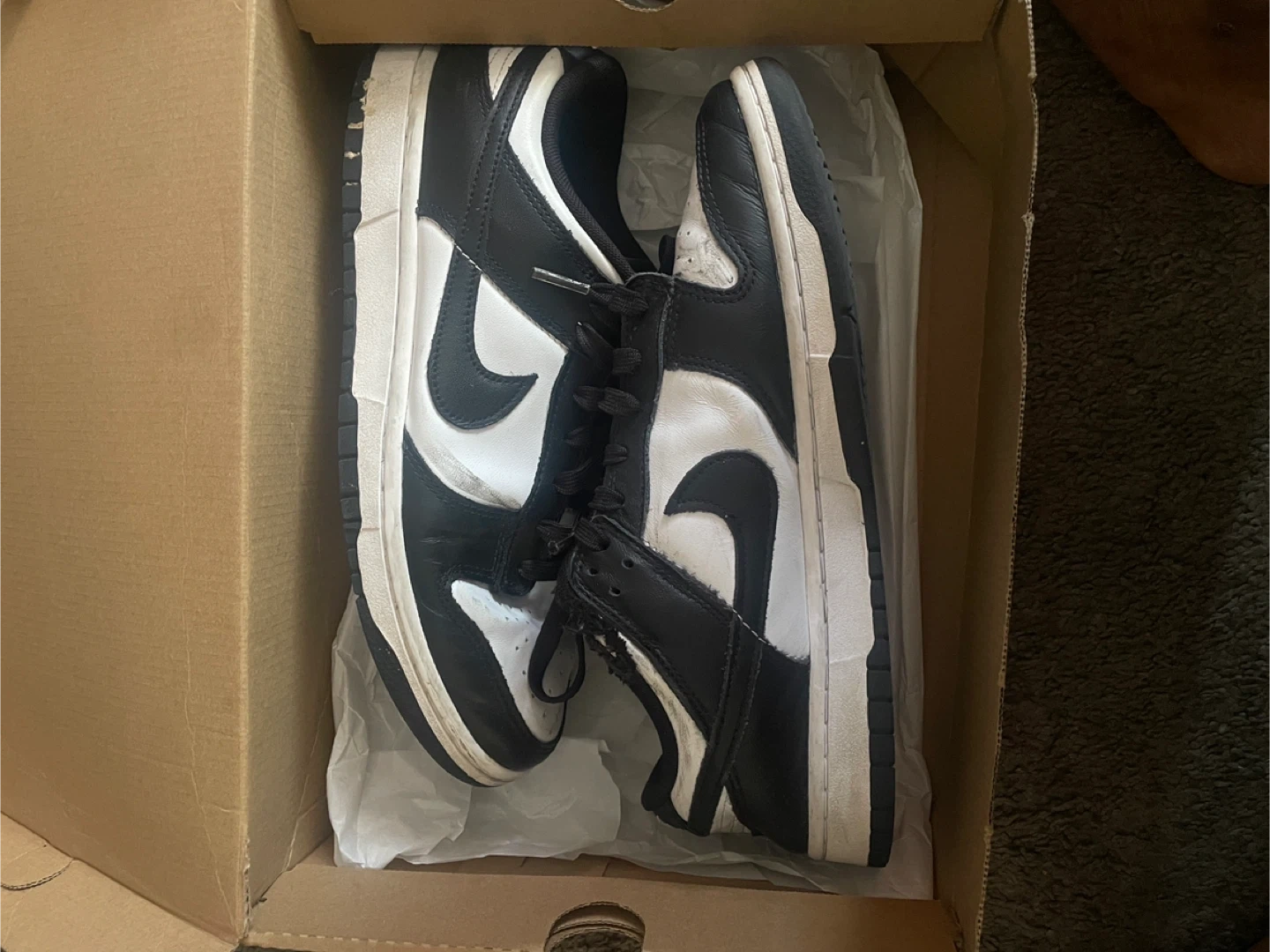 Selling a pair of Nike Dunk Lows in the classic panda colorway! They are in used condition and come with the original box