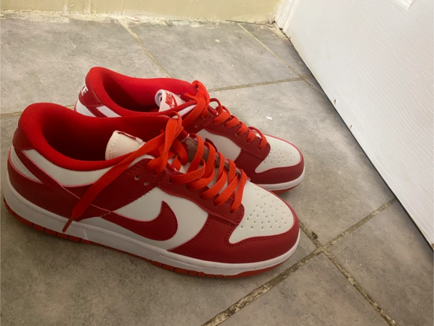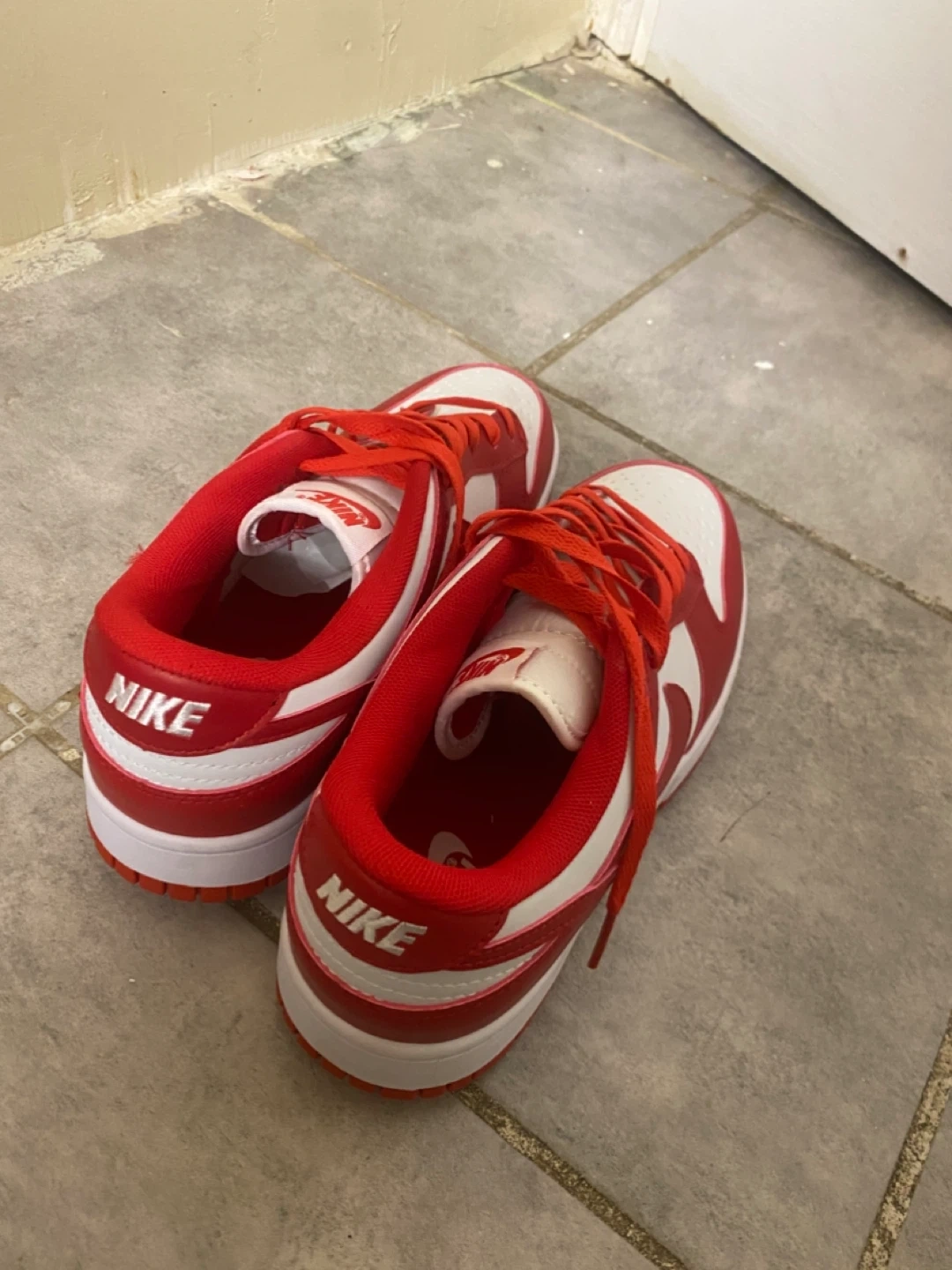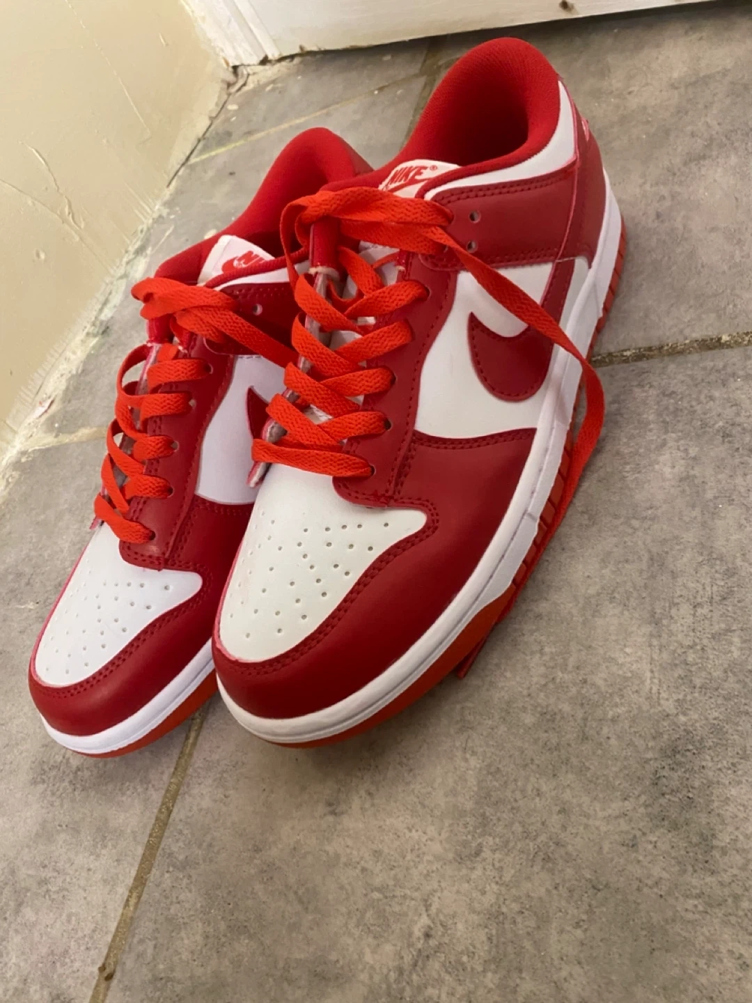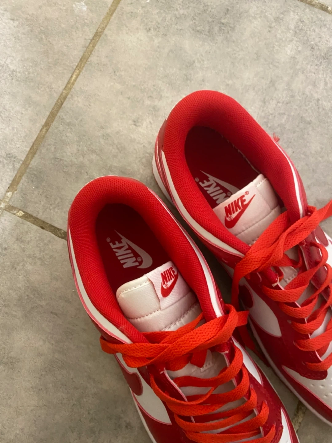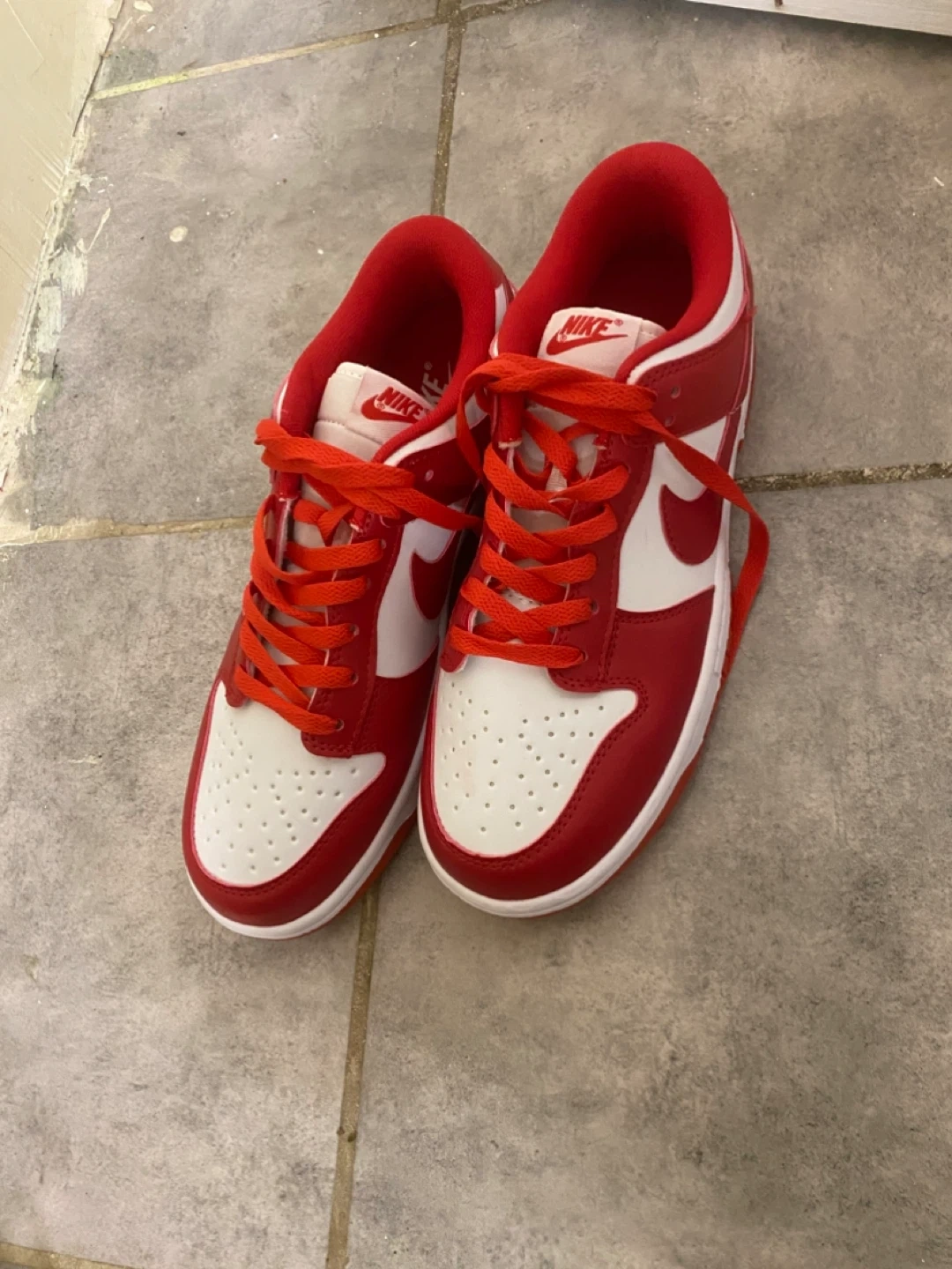 Selling a pair of Nike Dunk Low sneakers in a red and white colorway. They're in great condition and ready for a new home!