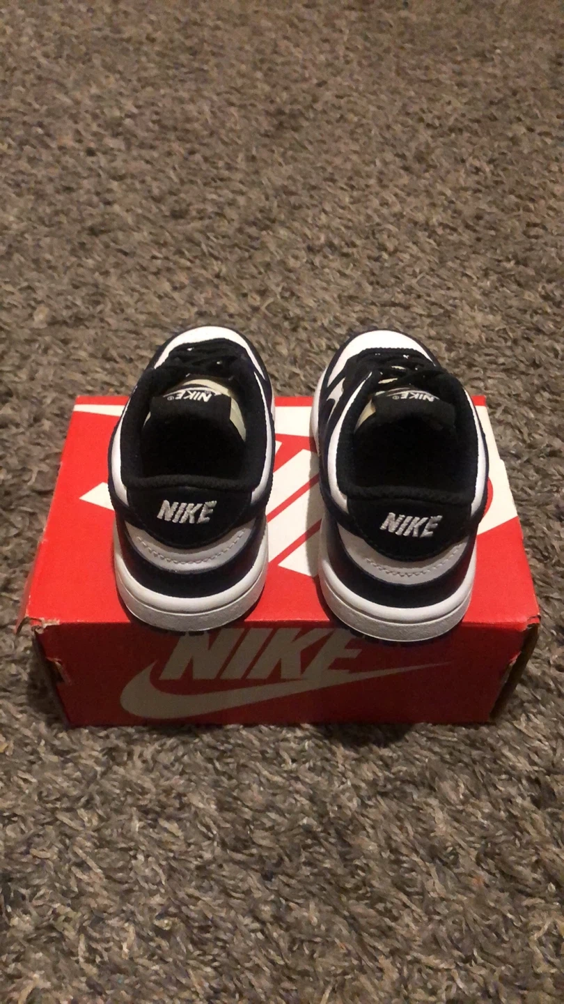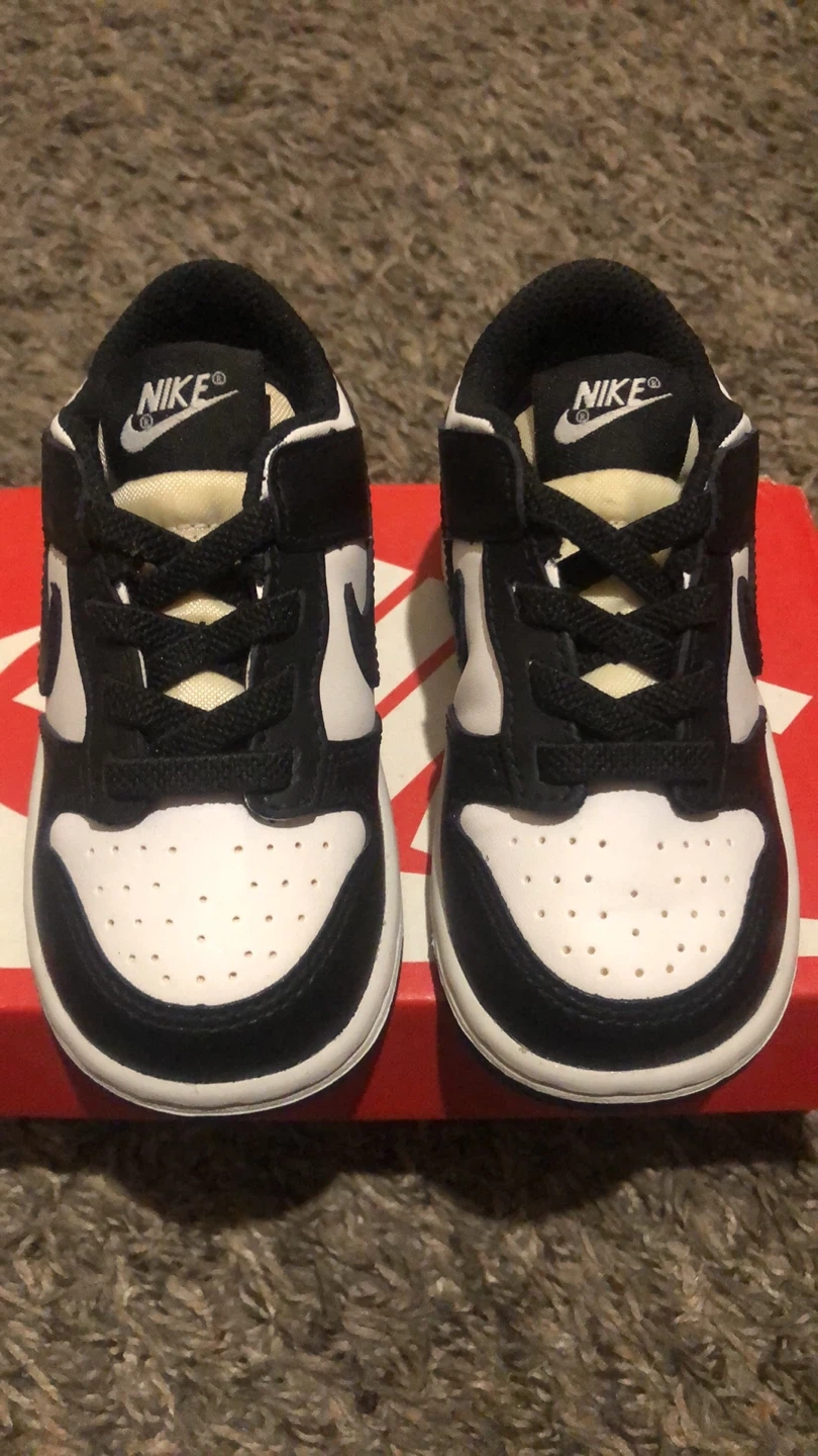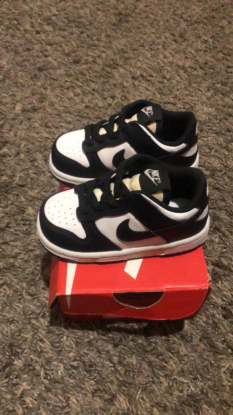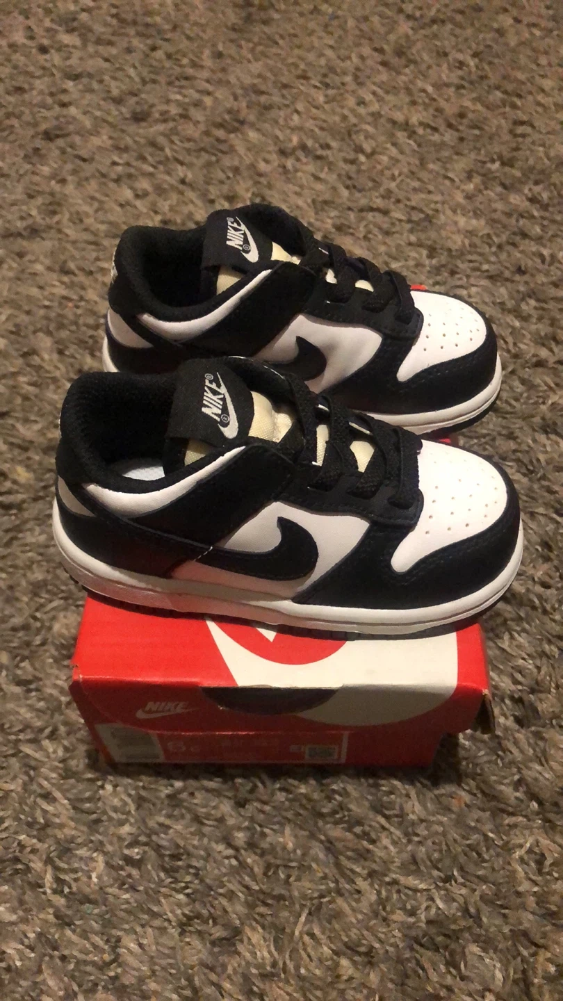 Selling a pair of 6c Nike Dunk Low toddler shoes in black and white. They come with the original box!