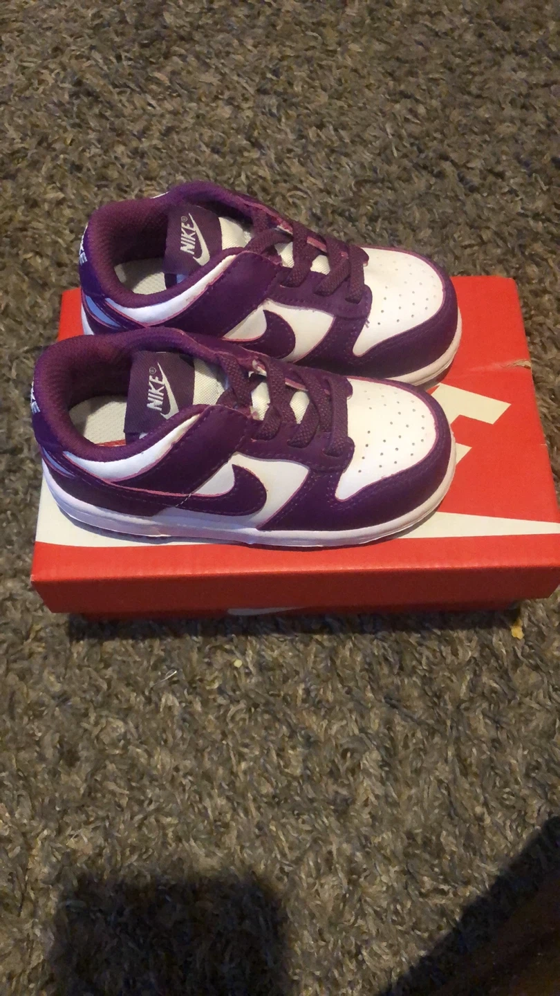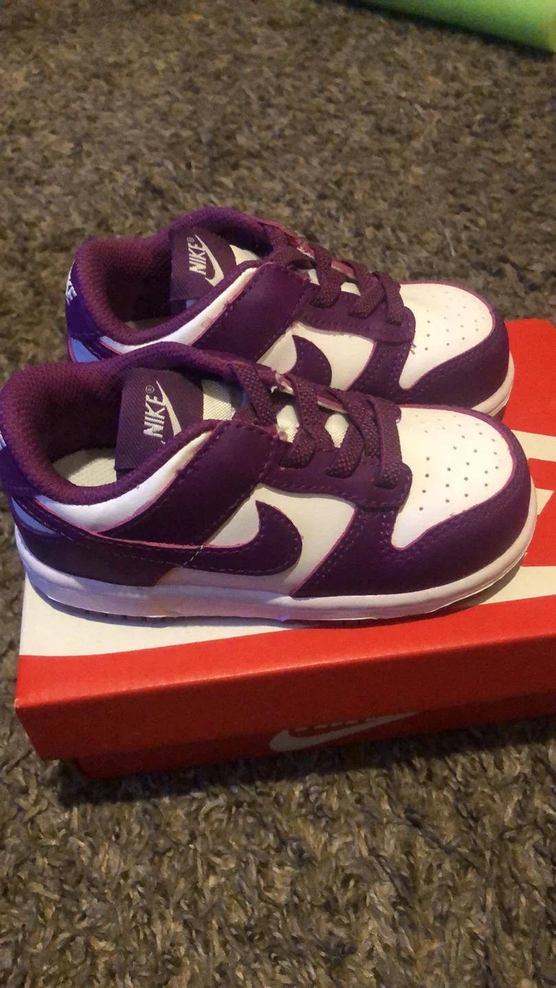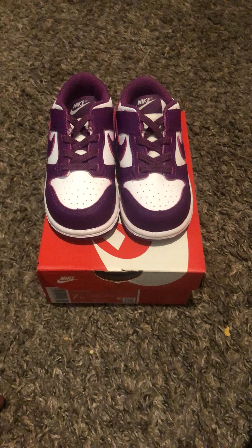 These adorable Nike Dunk Low toddler shoes(Size 7c) are in great condition and ready for a new home! They feature a stylish purple and white colorway that's sure to turn heads. The shoes come with the original box.