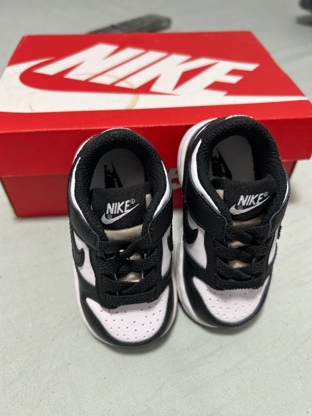 These adorable Nike Dunk Low toddler shoes are in excellent condition and come with the original box! They are a stylish black and white colorway and are a size 4C.