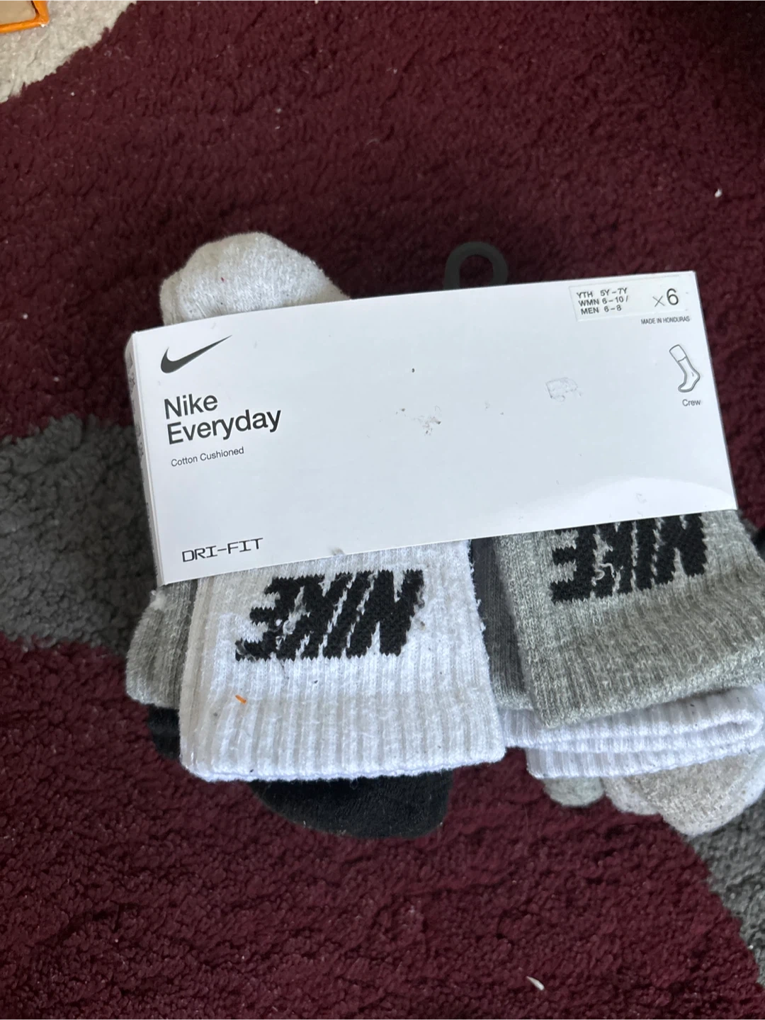 Nike Everyday cotton cushioned socks, brand new in the package! - Youth size 5Y-7Y - Women's size 6-10 - Men's size 6-8 - Includes 6 pairs of crew socks - Dri-FIT