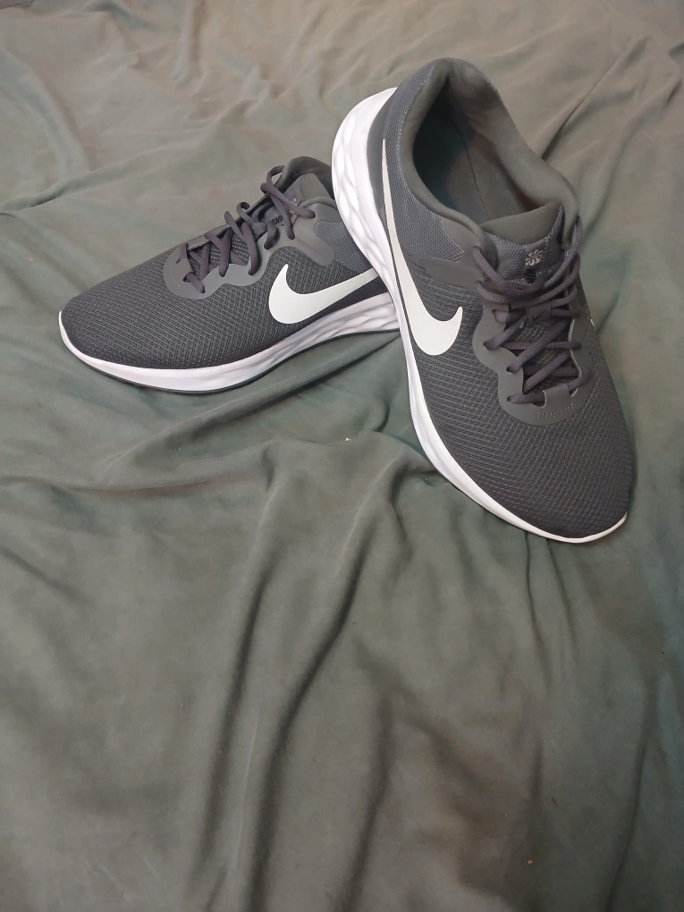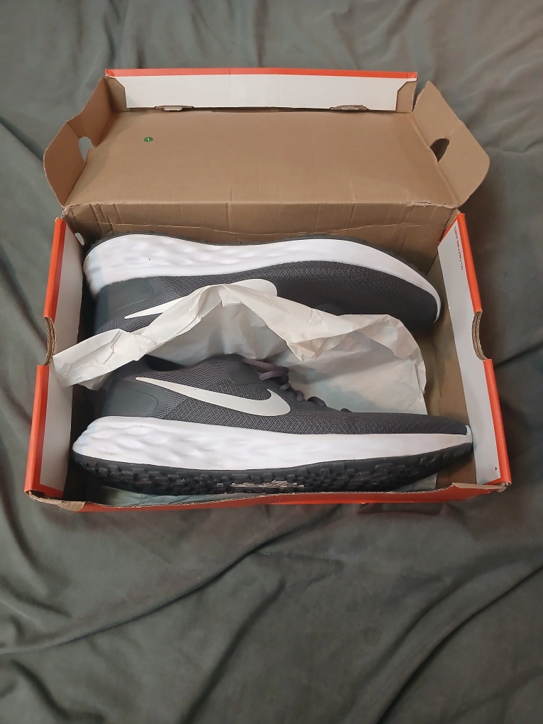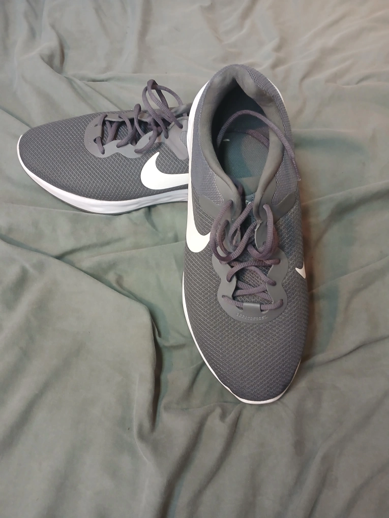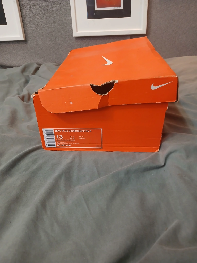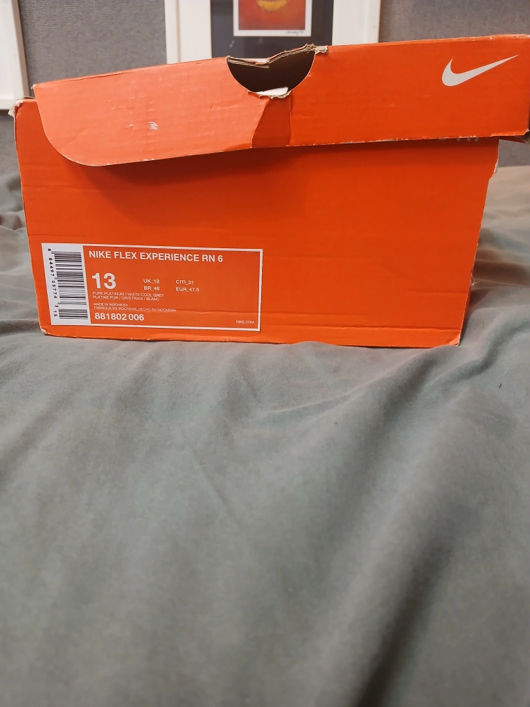 Selling a pair of Nike Flex Experience RN 6 running shoes in gray. They are a men's size 13 and come with the original box USED ONCE.