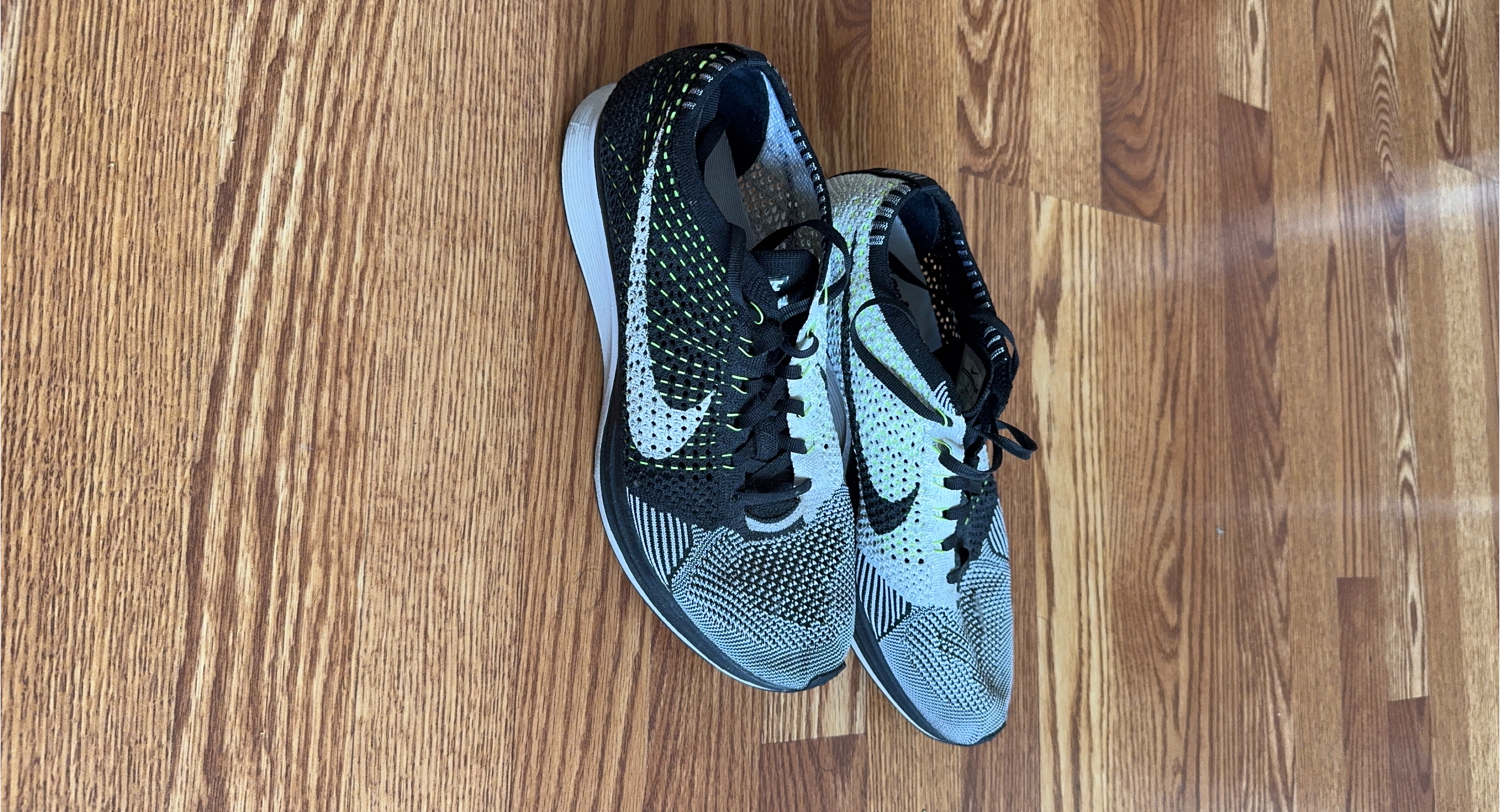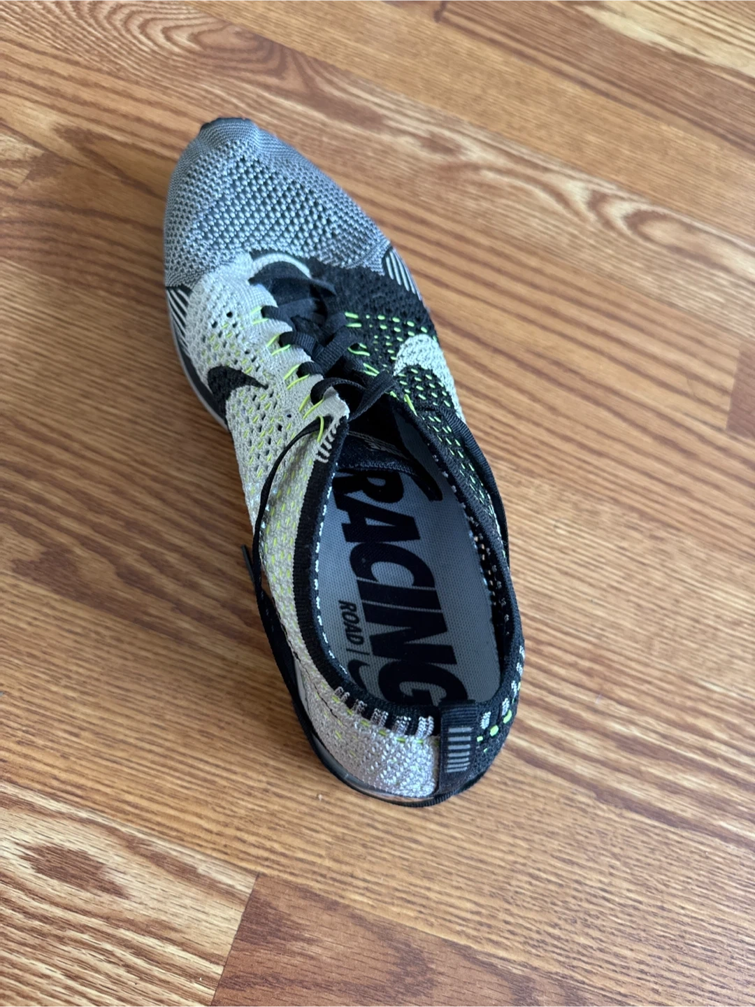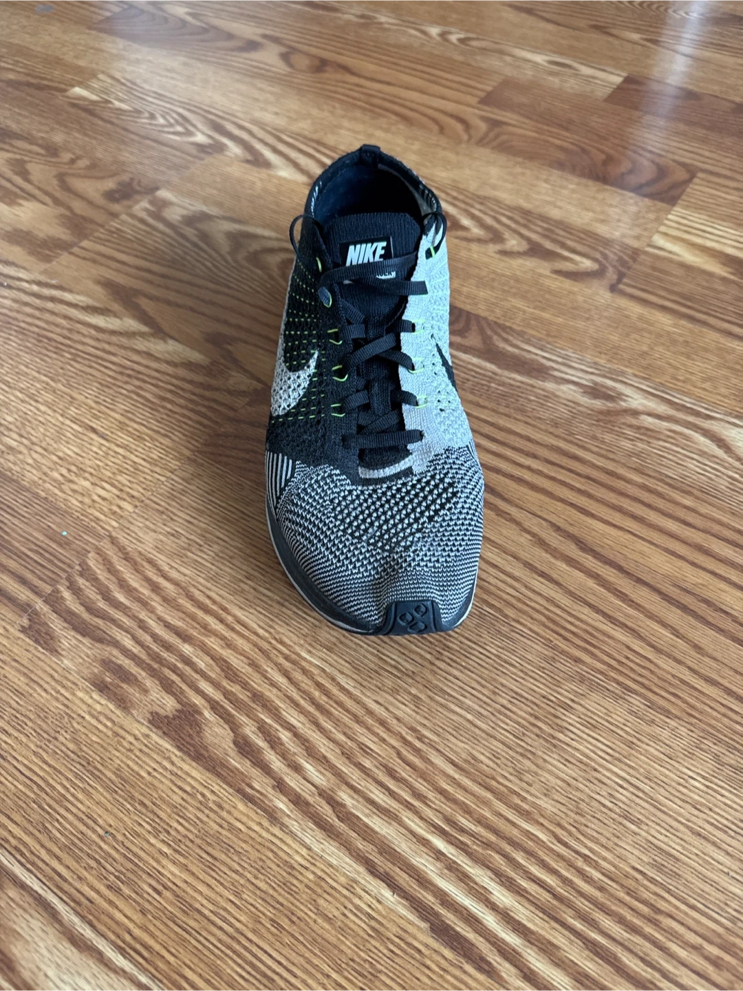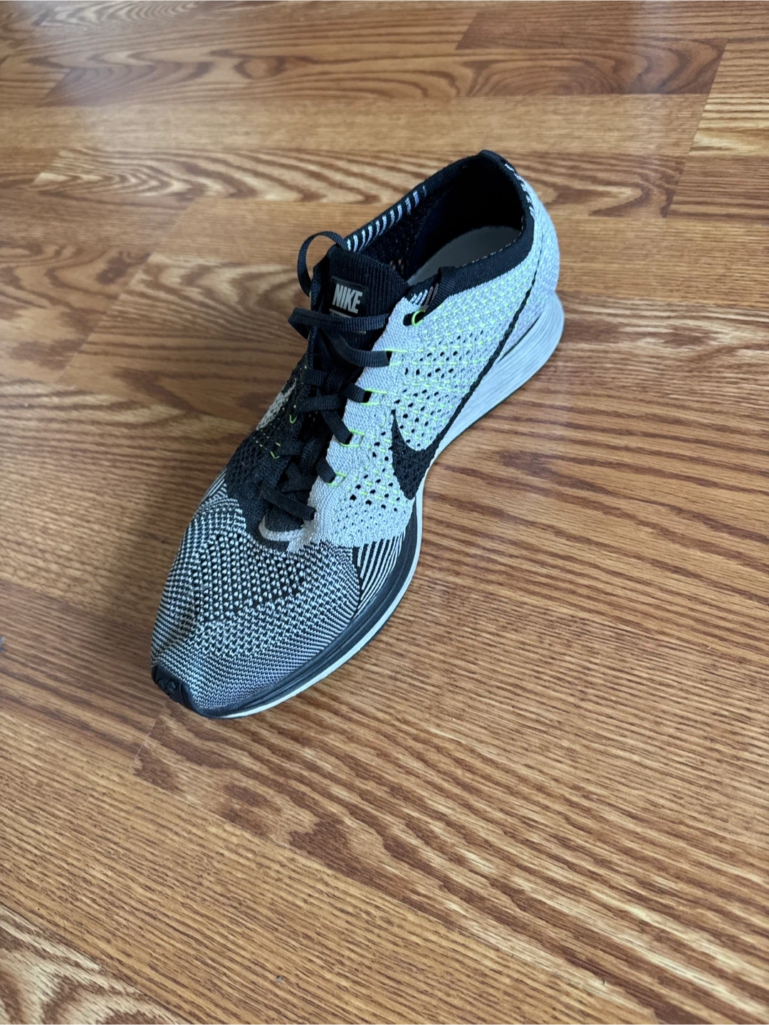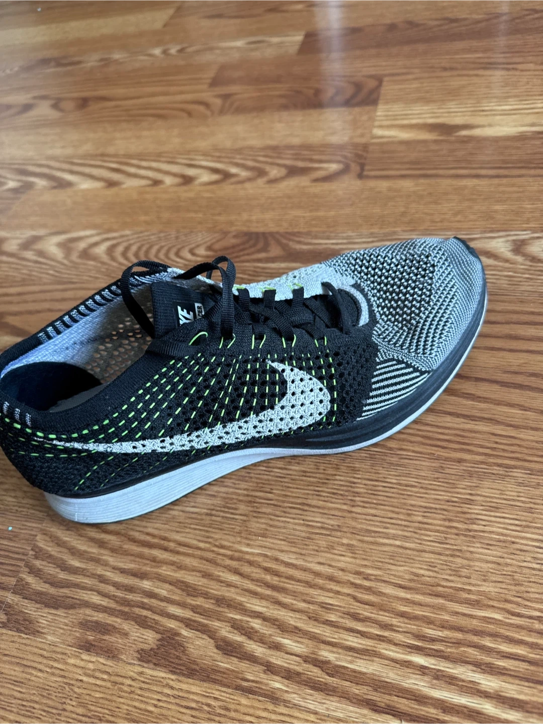 Selling a pair of Nike Flyknit Racer running shoes. They feature a lightweight and breathable Flyknit upper, providing a snug and comfortable fit. The shoes are designed for speed and performance, making them great for running or casual wear. The black and white colorway with neon green accents gives them a stylish look!
