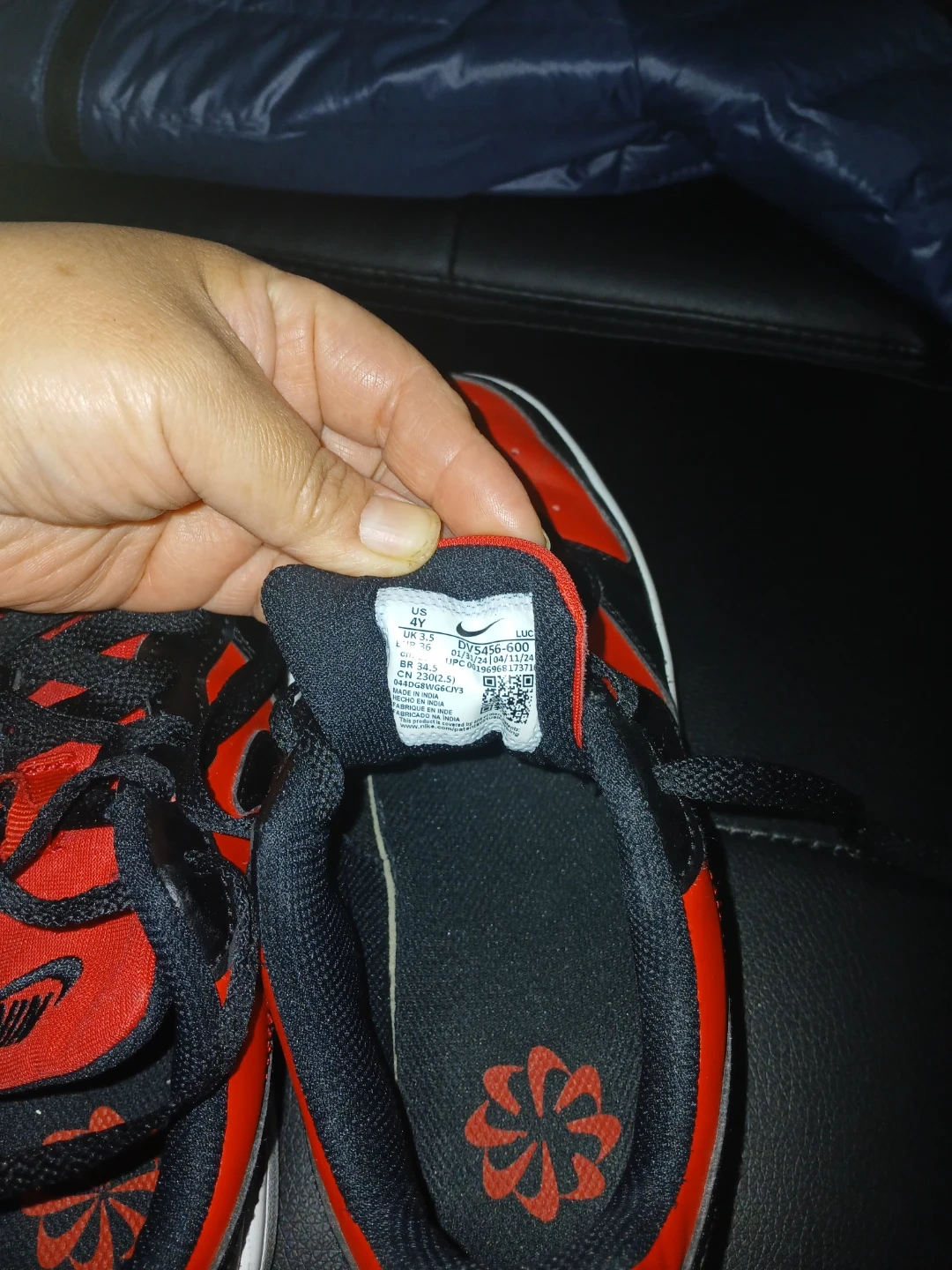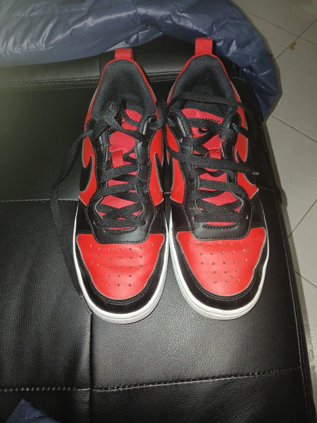 10Selling a pair of Nike Force 1 LV8 sneakers in size 4Y. The shoes are red and black. They have the Nike logo on the side and a unique design on the sole. Great for kids!