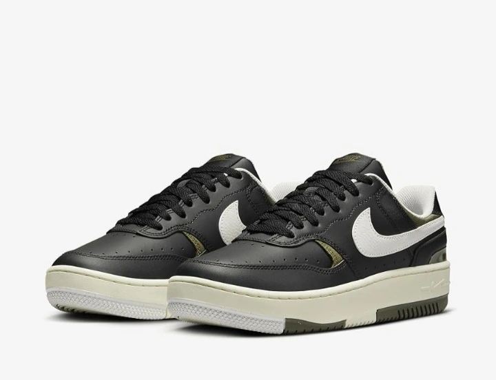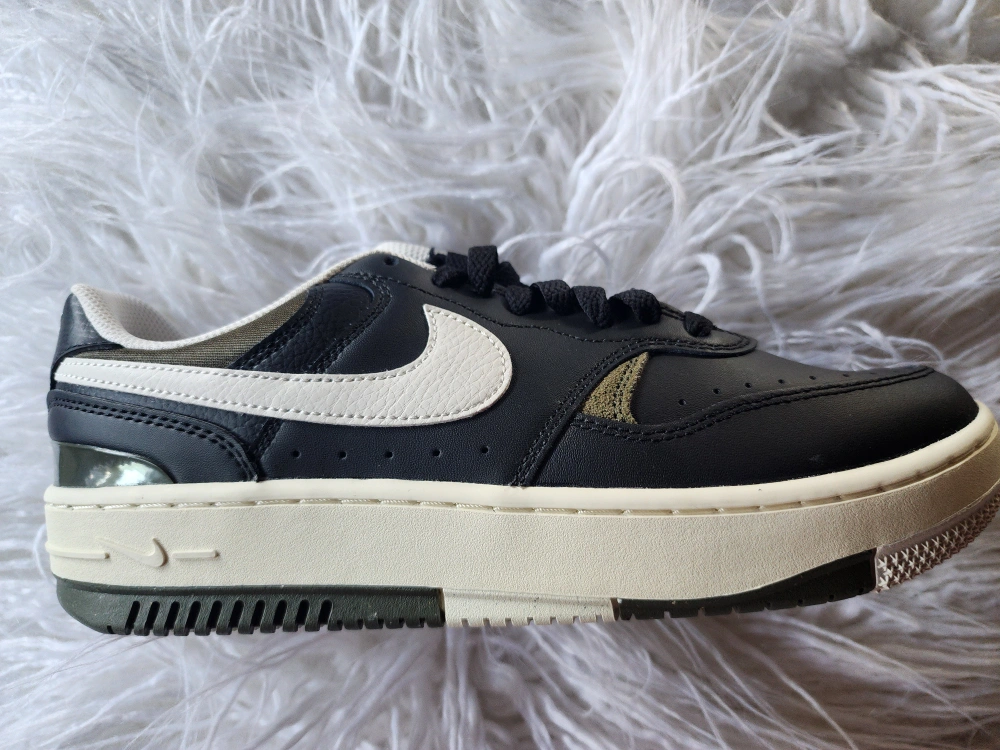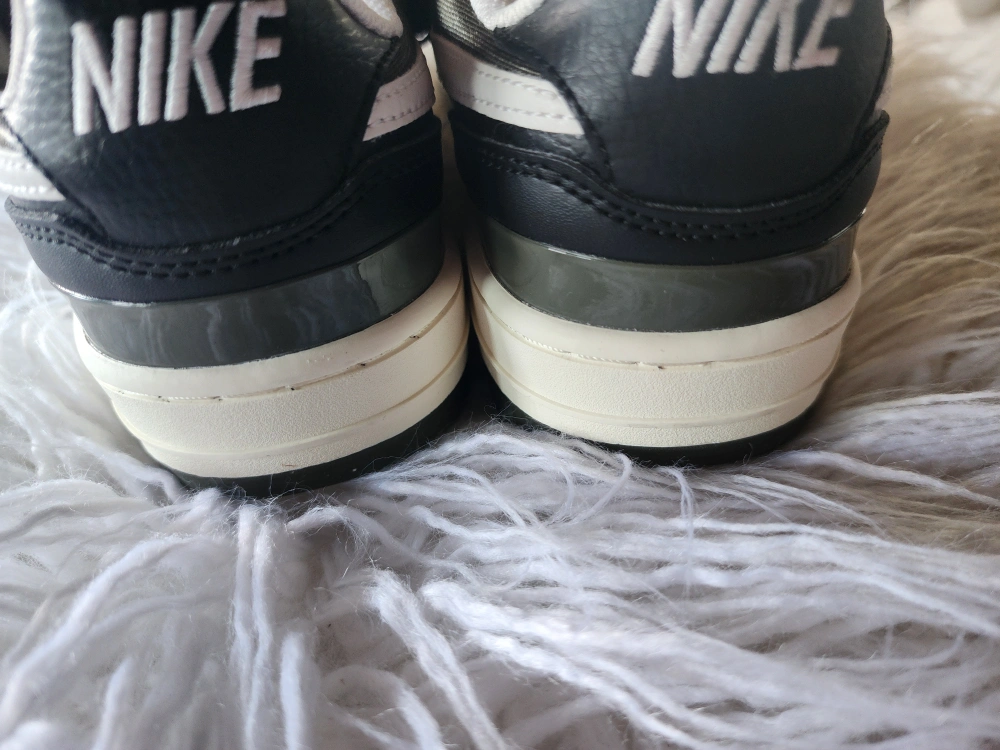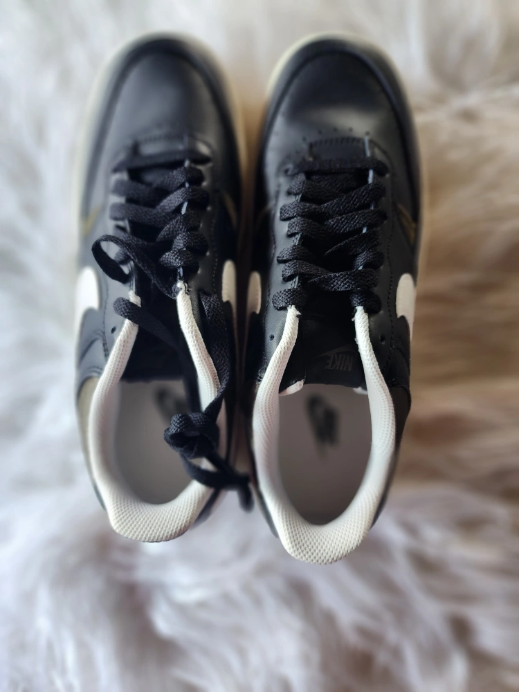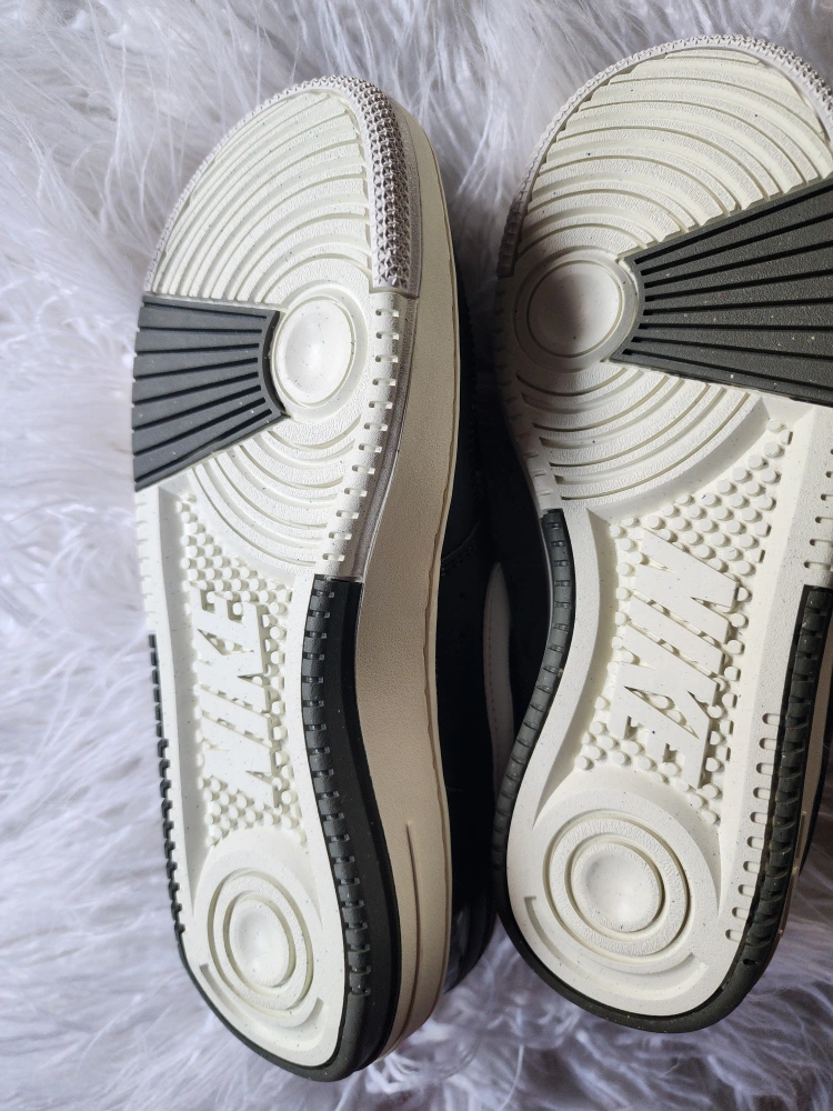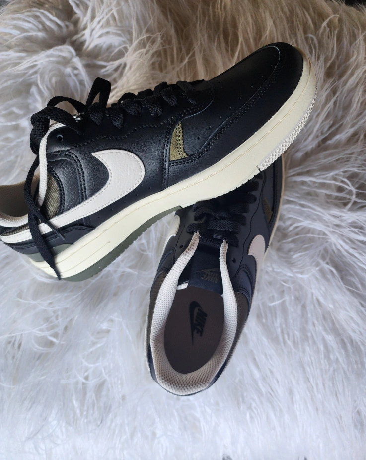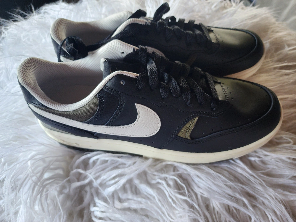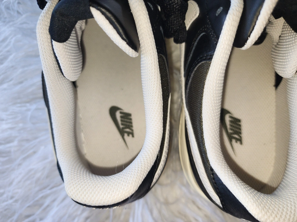 These sneakers are mostly black, with a white swoosh. They also have a beige sole. These would be perfect for a casual stroll. Brand new. Never used or worn. Send me an offer.