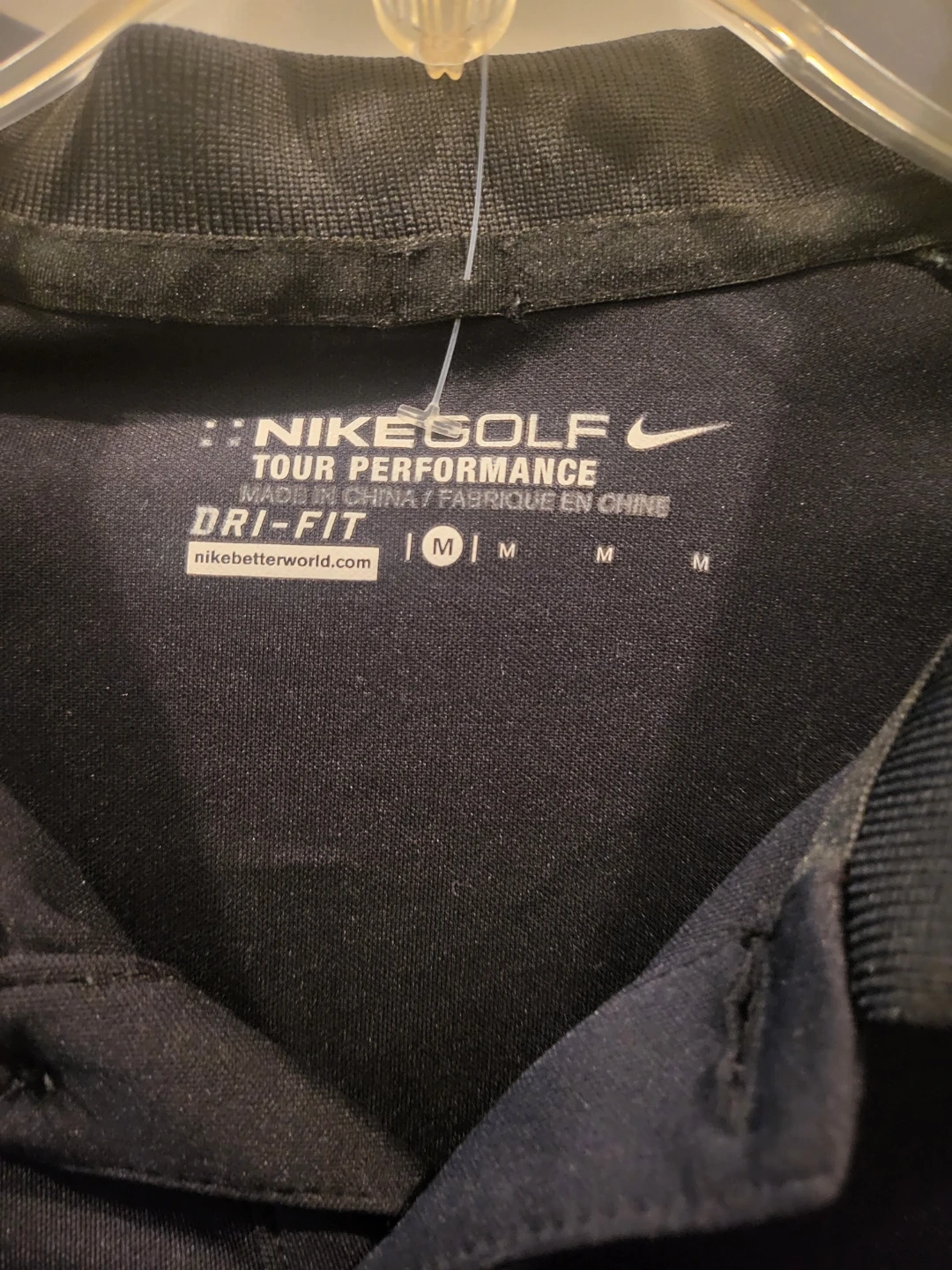 76Selling a Nike Golf Tour Performance Dri-Fit polo shirt in men's size medium. It's a sleek, black color and made with Dri-Fit technology, so it's lightweight and breathable. Perfect for a day on the golf course or just casual wear!