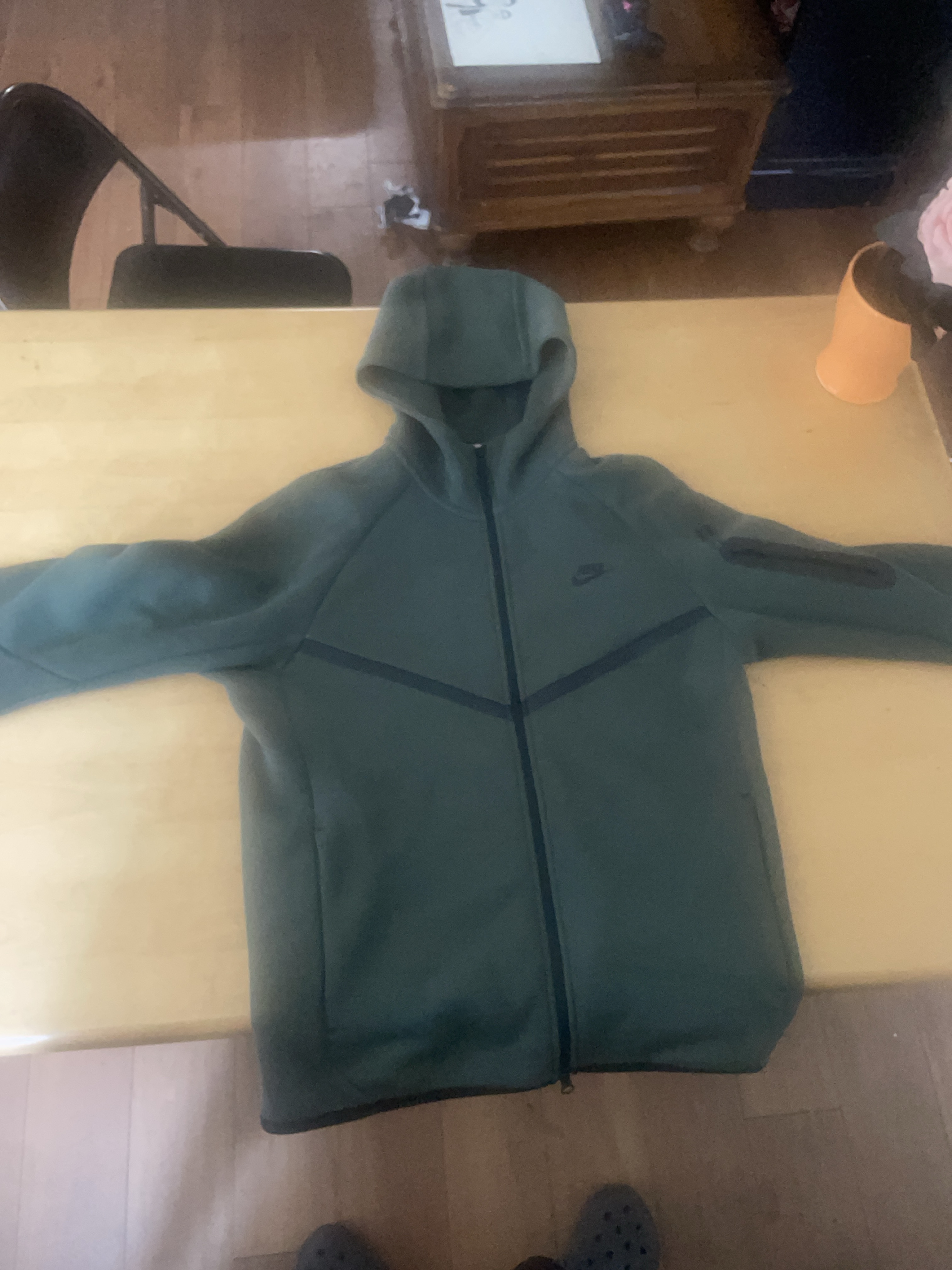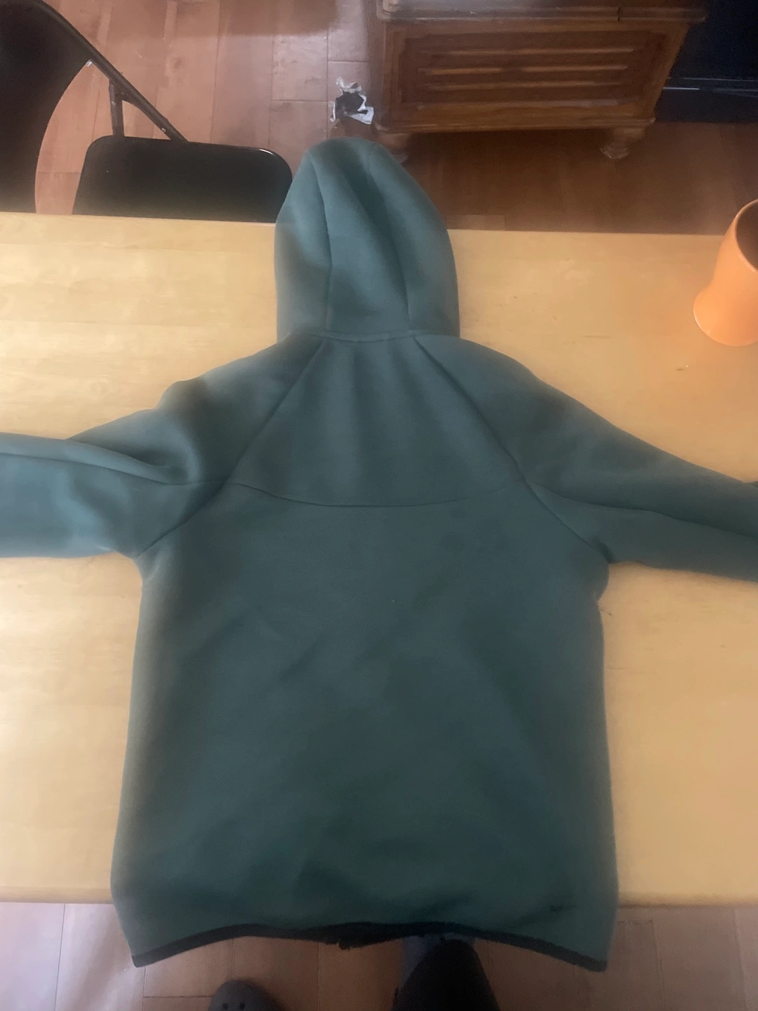 Dark green hoodie. Full zip-up. Features a hood and pockets. A great thing to wear on a nice, cool day to feel relaxed. Zero holes