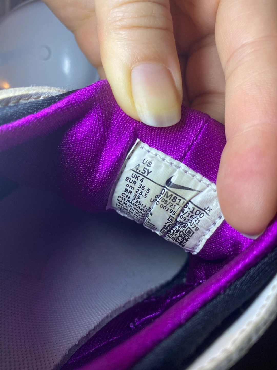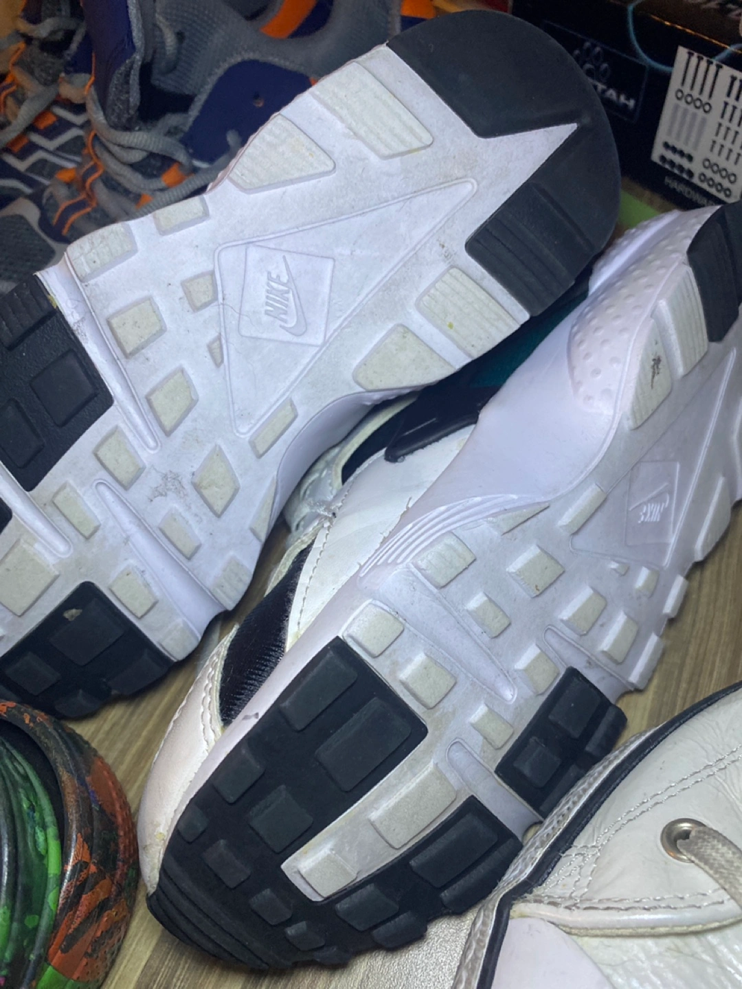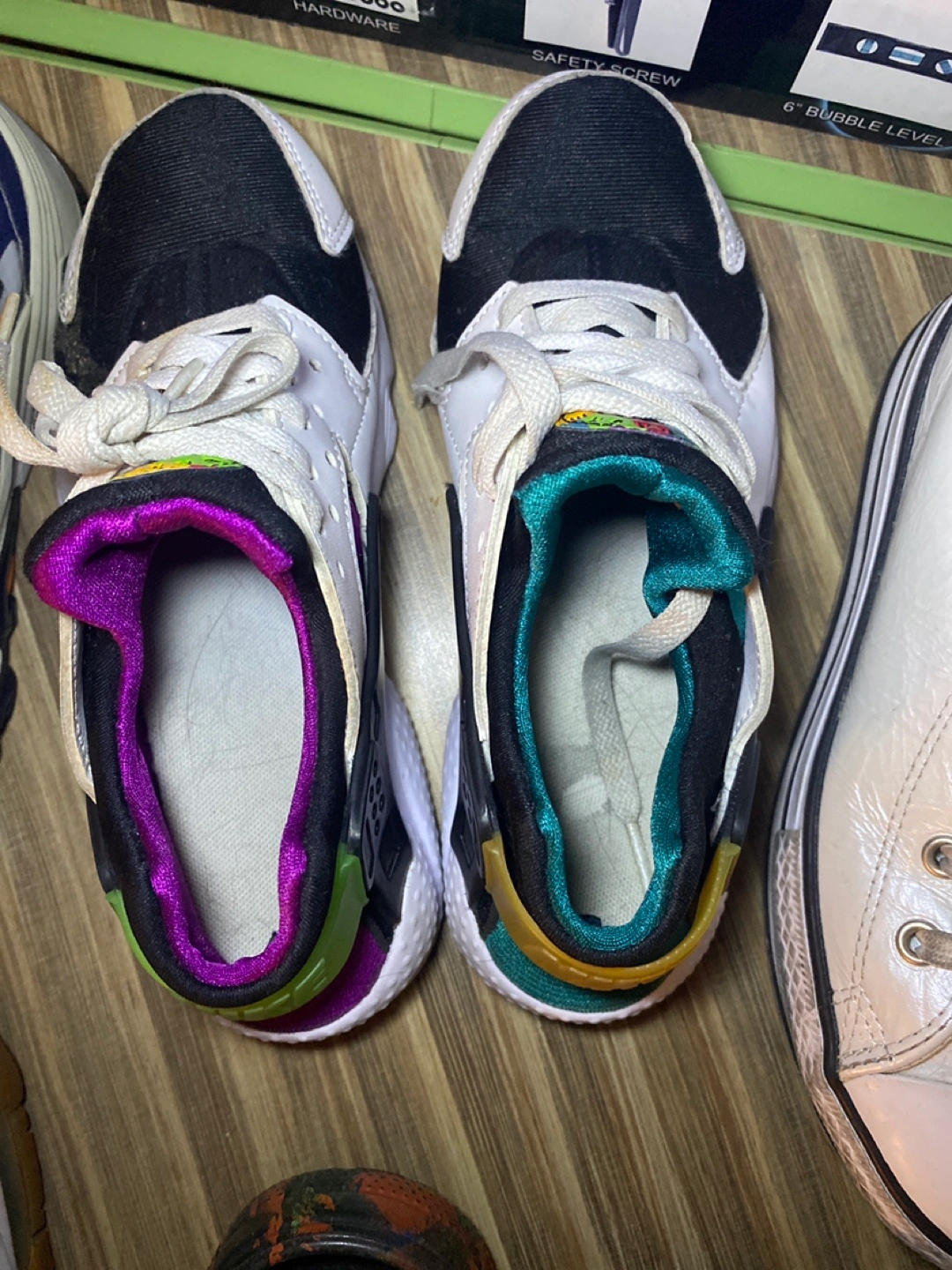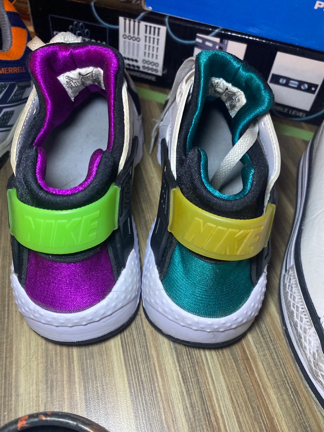 Selling a pair of Nike Huarache Run sneakers in youth size 4.5Y. Need some cleaning, plenty of life left! The colorway features black, white, and vibrant purple and green accents
