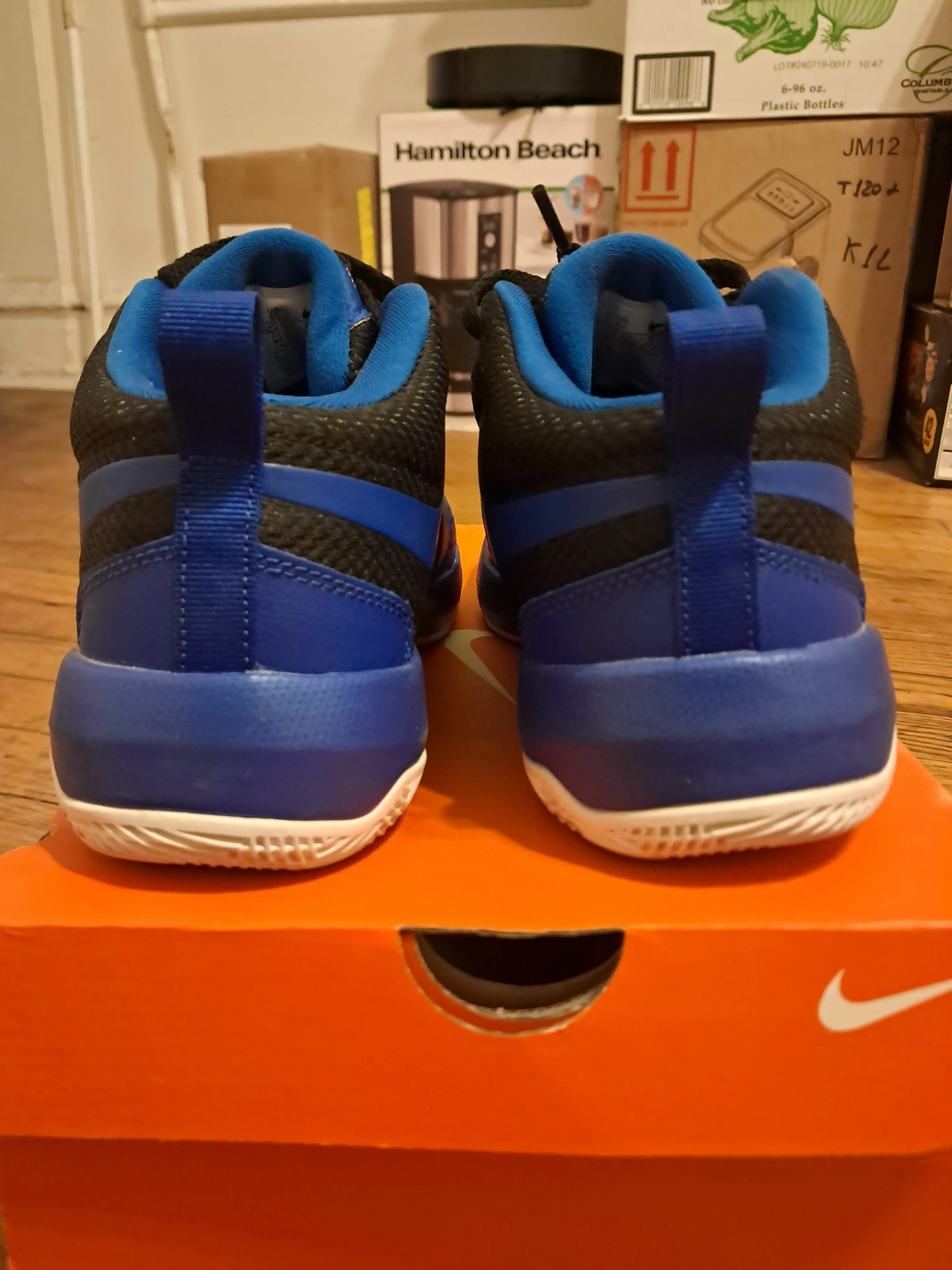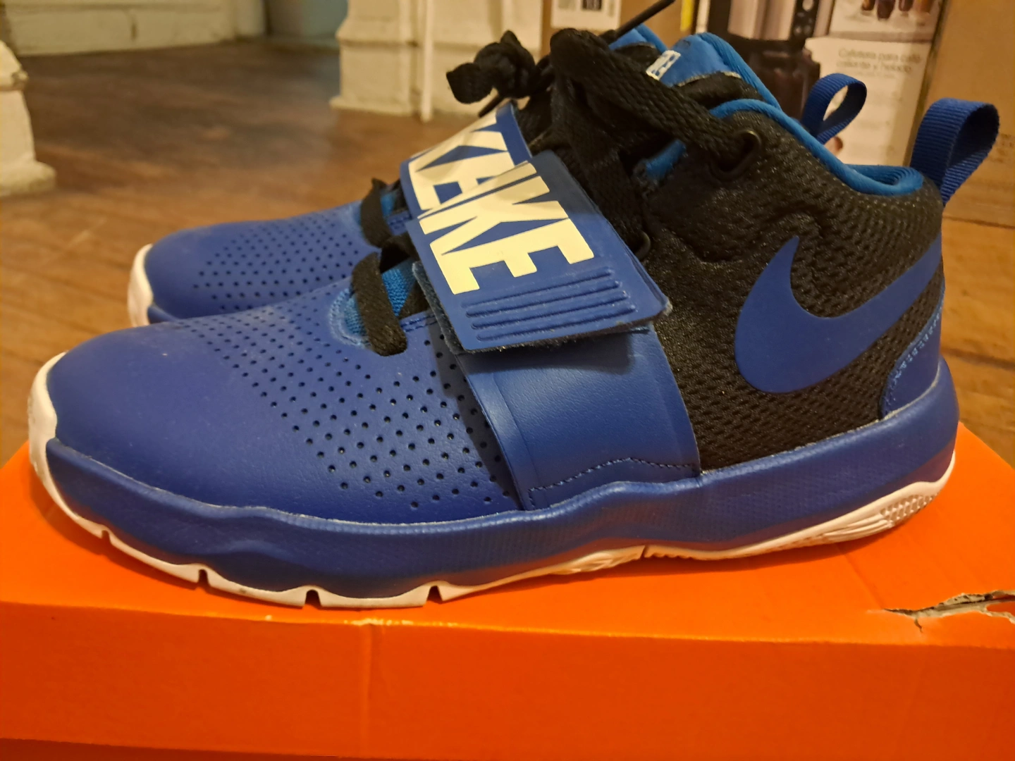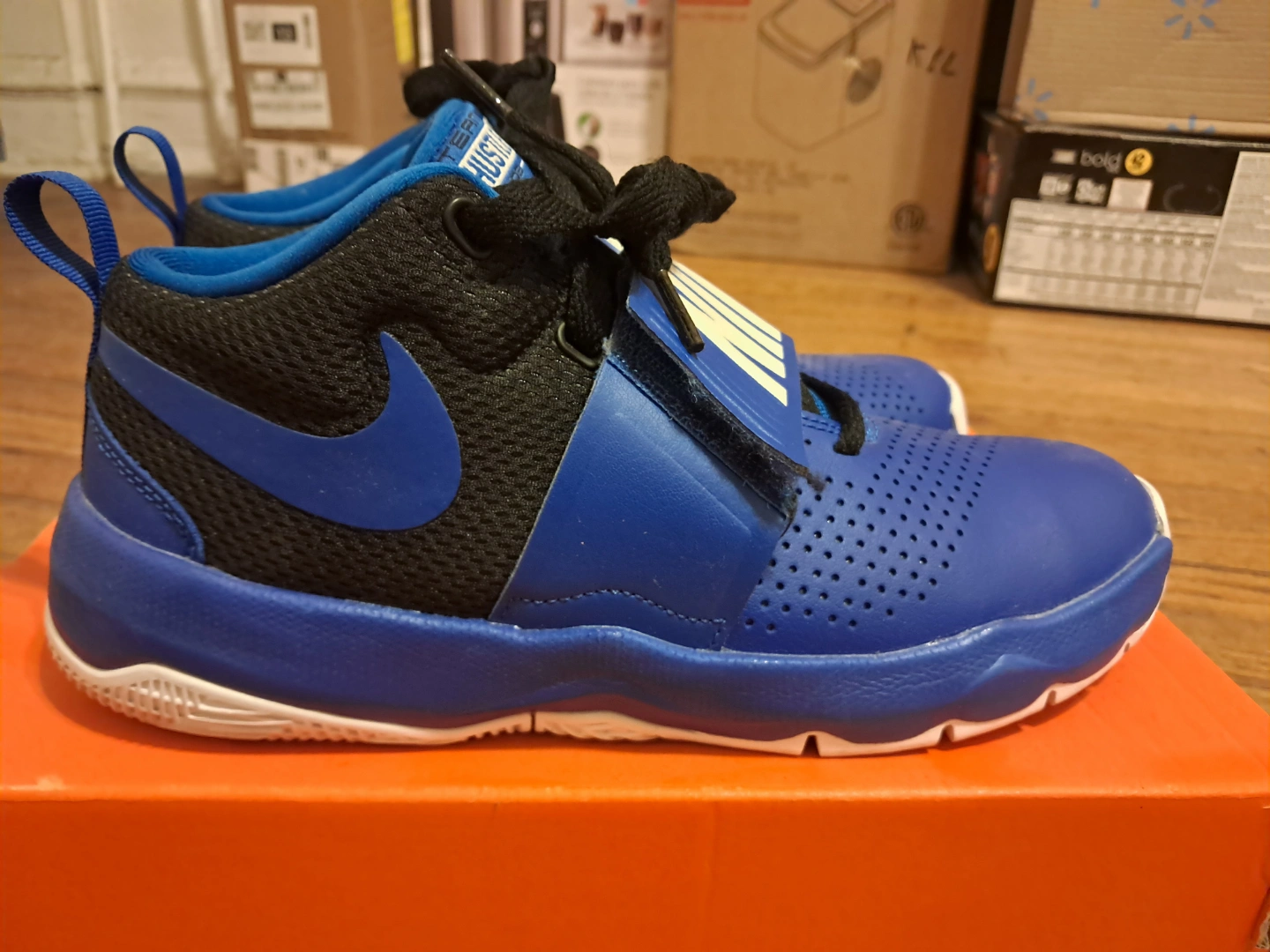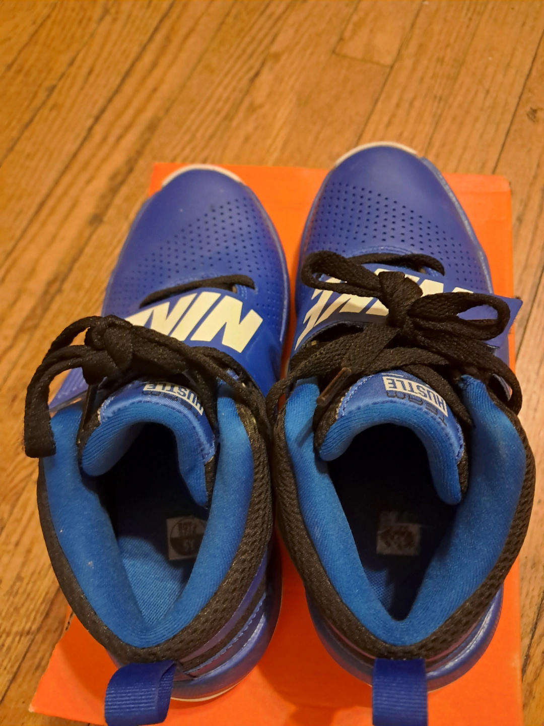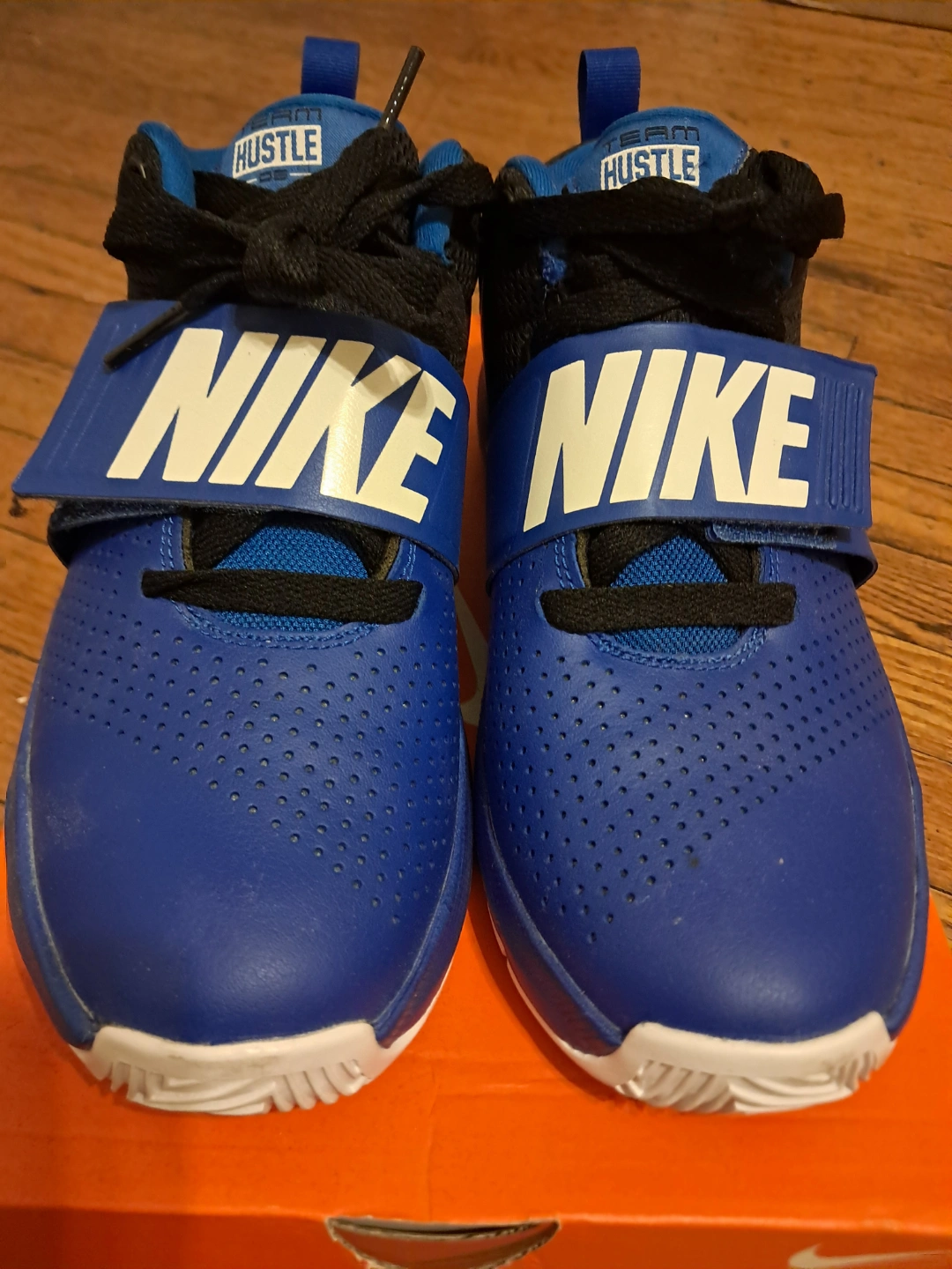 65Boys' Nike Hustle D9 basketball shoes. Blue and black colorway. Velcro strap closure. Great for the court.