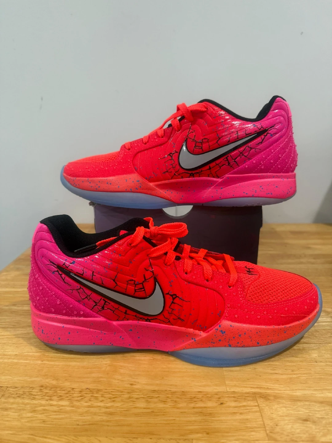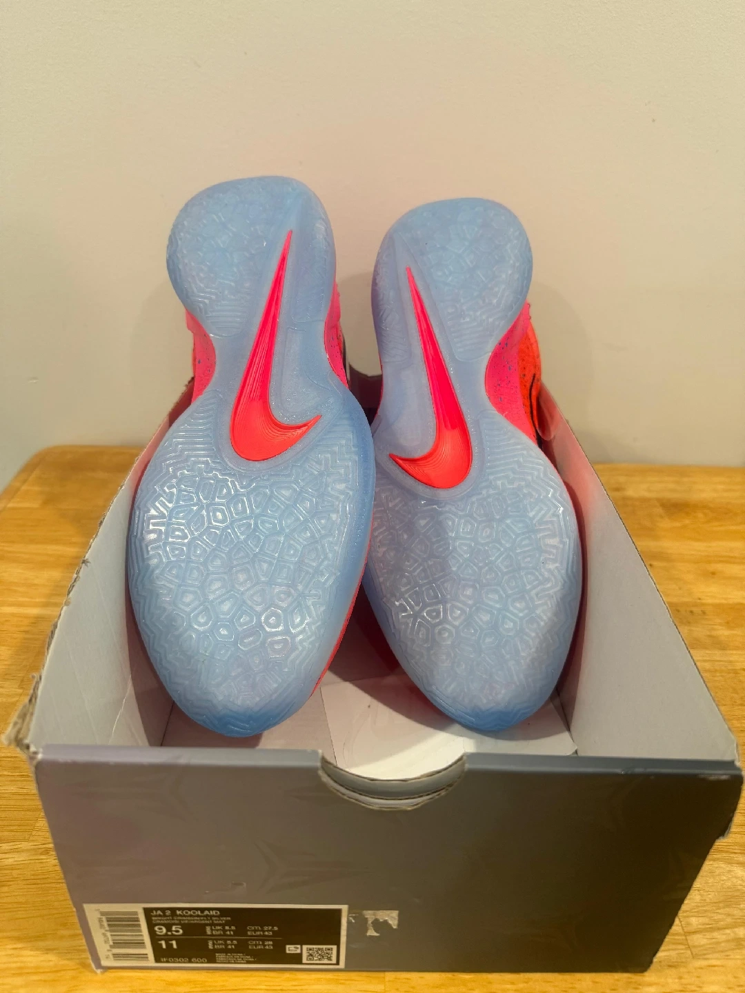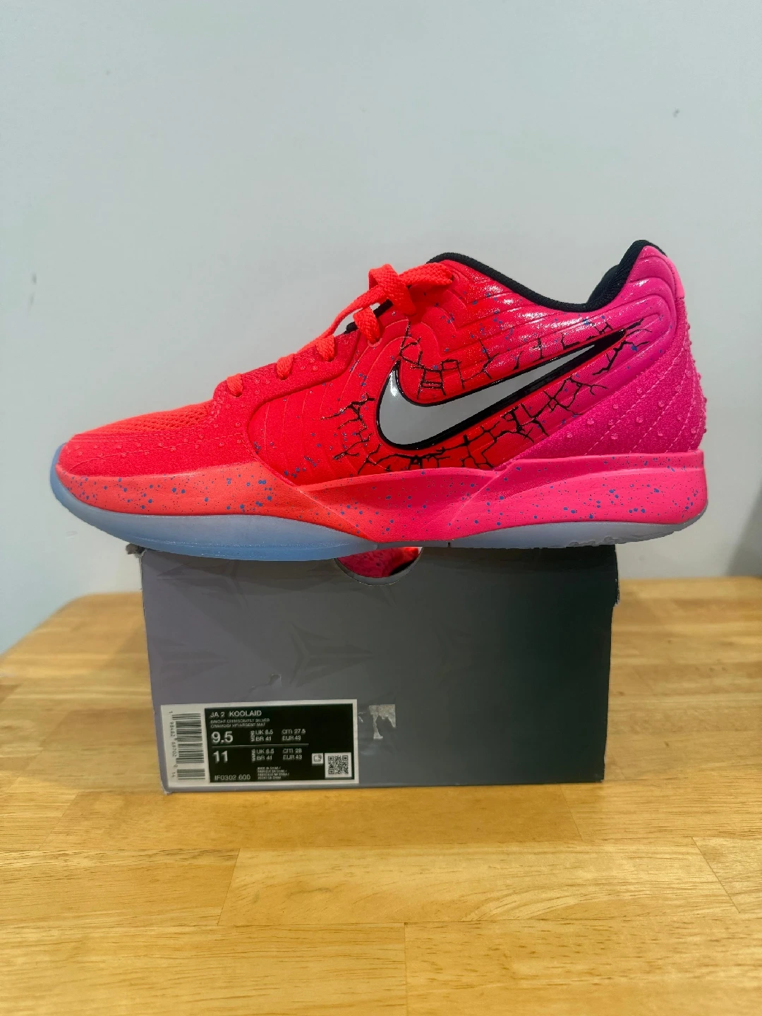 60THE BOX DOES NOT HAVE THE LID THE SHOE IS BRAND NEW. Selling a pair of Nike JA 1 x Kool-Aid sneakers in size 9.5. These shoes feature a vibrant red and pink color scheme with Kool-Aid graphics. They are in great condition and ready for a new home!