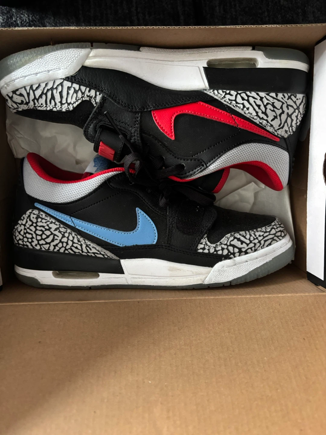 65Selling a pair of Nike Jordan Legacy 312 Low sneakers. They feature a black, red, and light blue color scheme with the classic elephant print detailing. Comes with the original box!