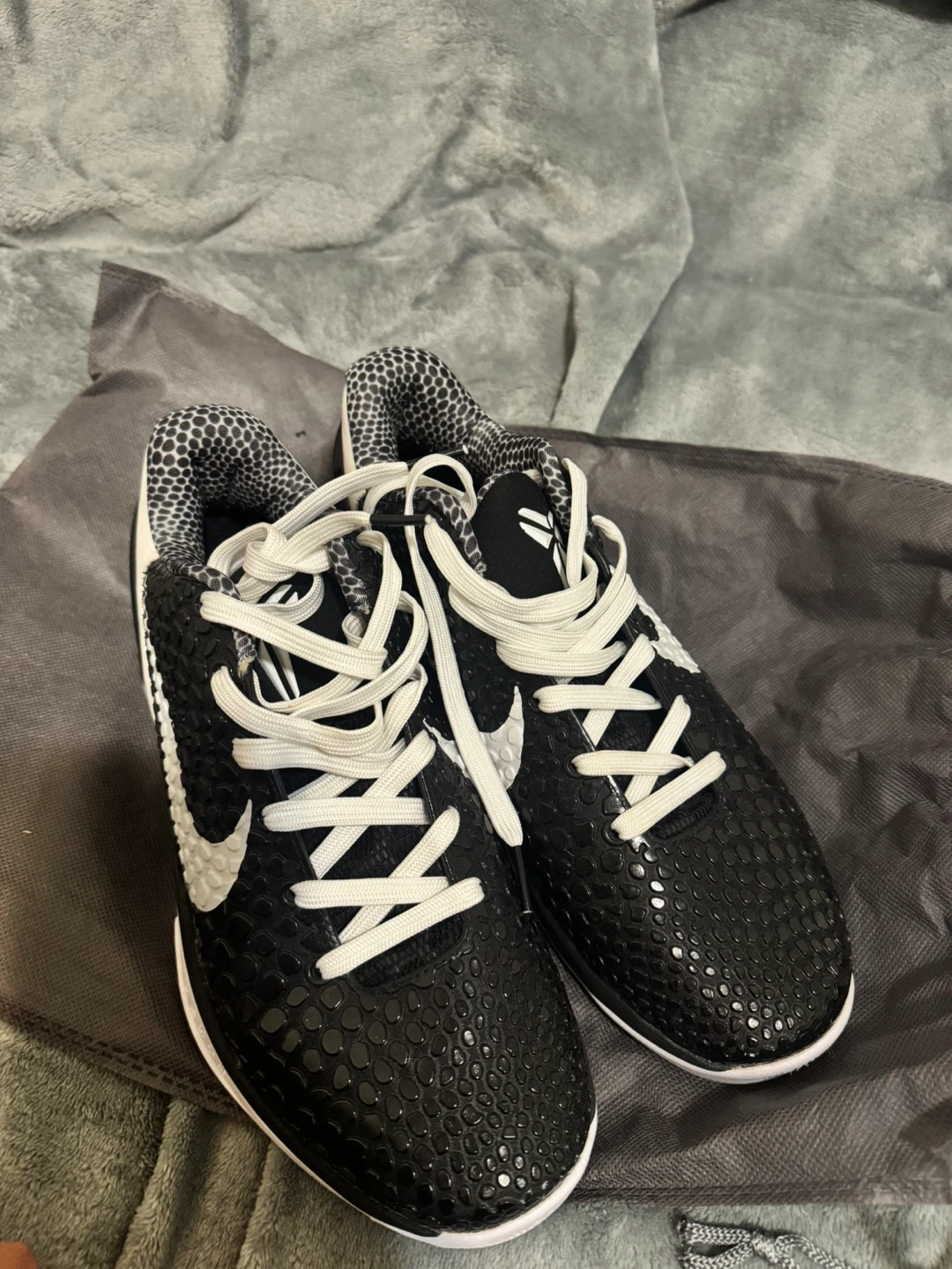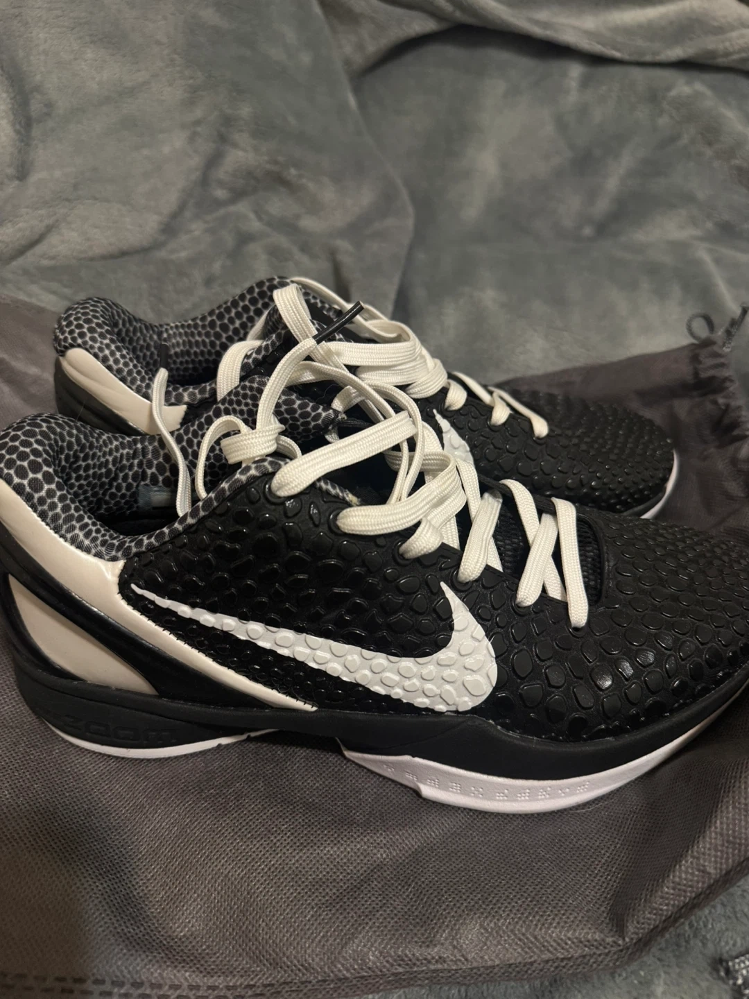 65Selling a pair of Nike Kobe 6 Protro shoes in Black Del Sol color. These shoes feature a unique black mamba-inspired upper with a white Nike swoosh. Great for basketball or casual wear!