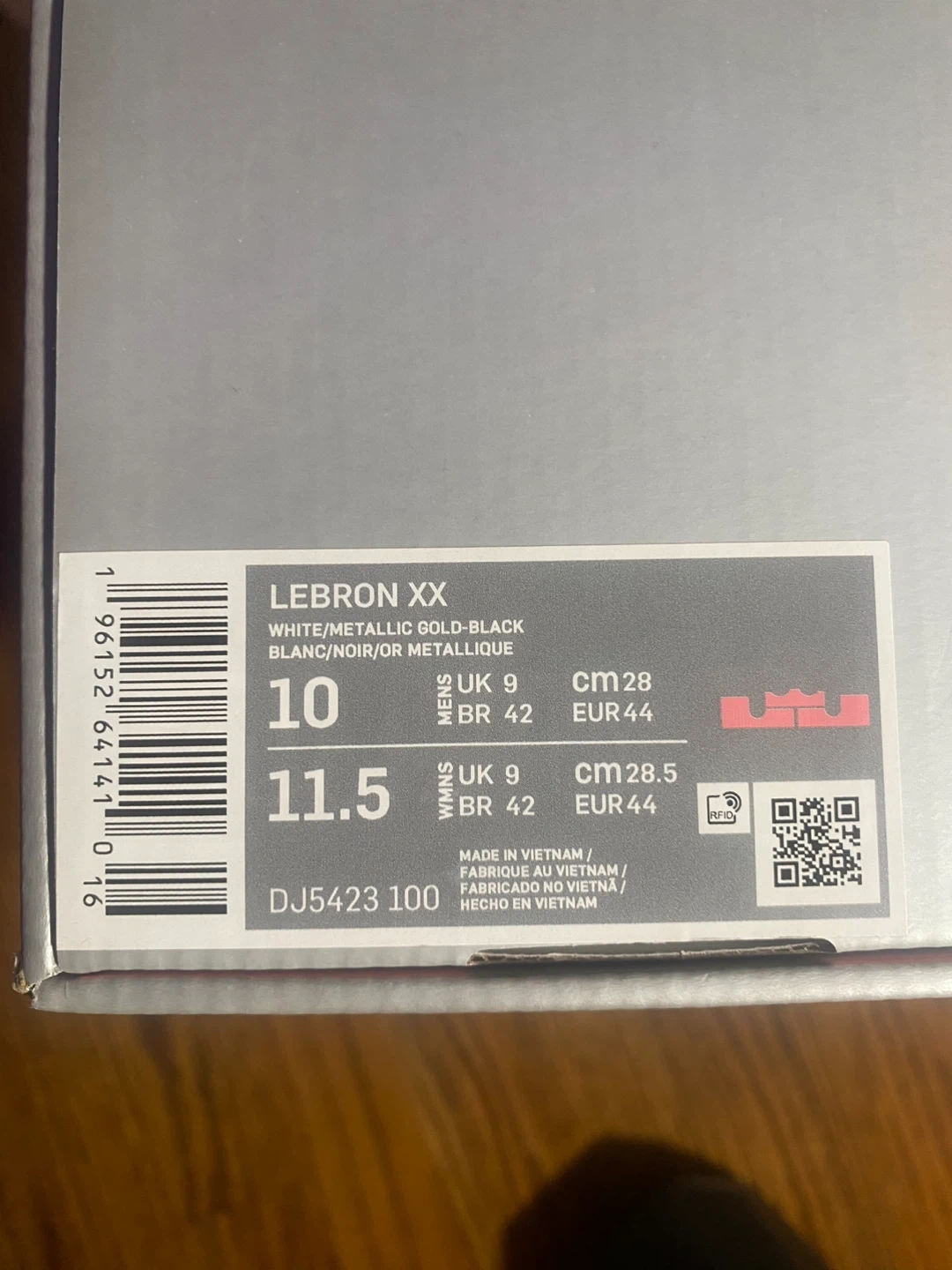 Selling a pair of new Nike LeBron XX basketball shoes in size 10. The colorway is White/Metallic Gold-Black. They come with the box