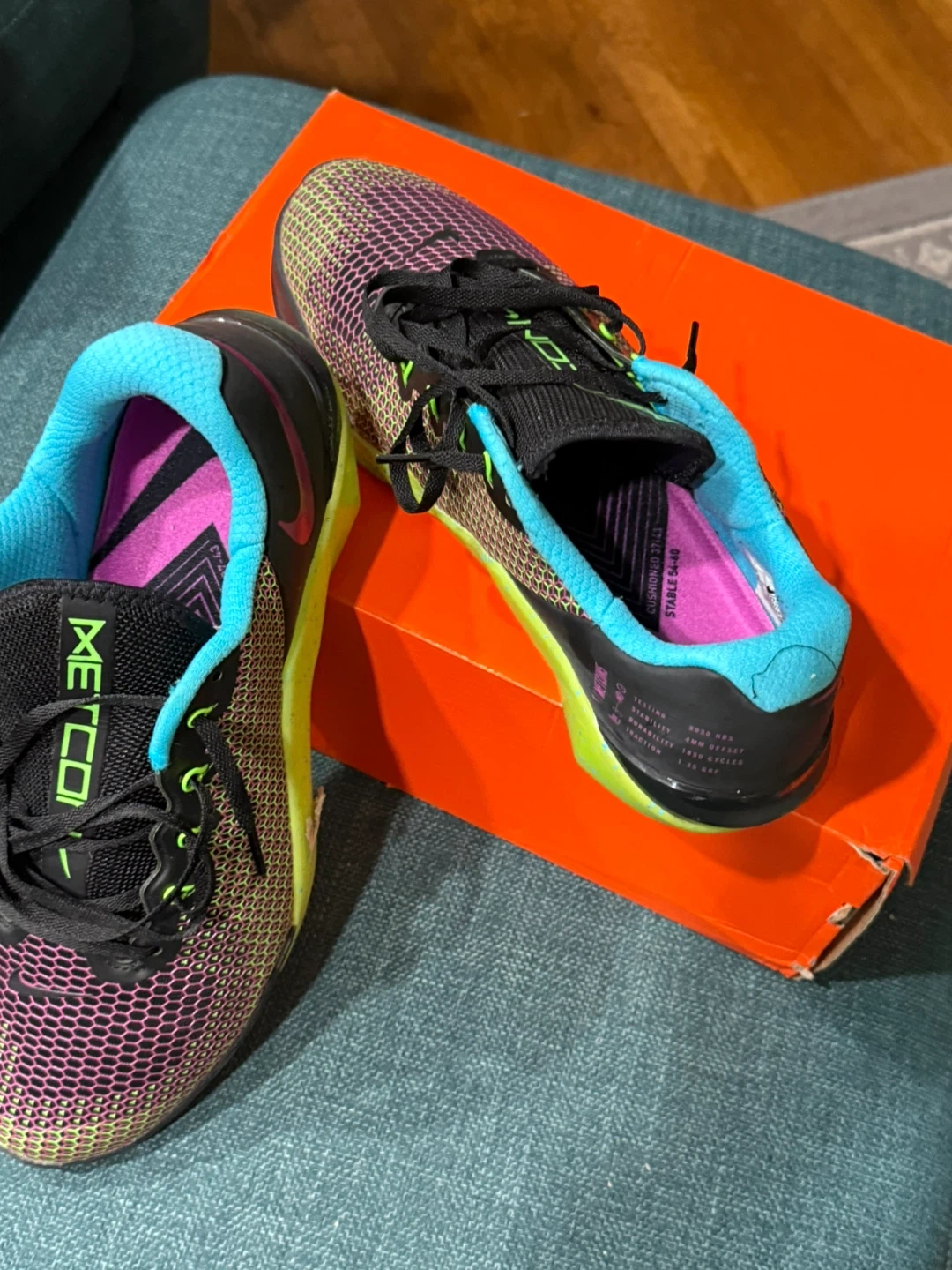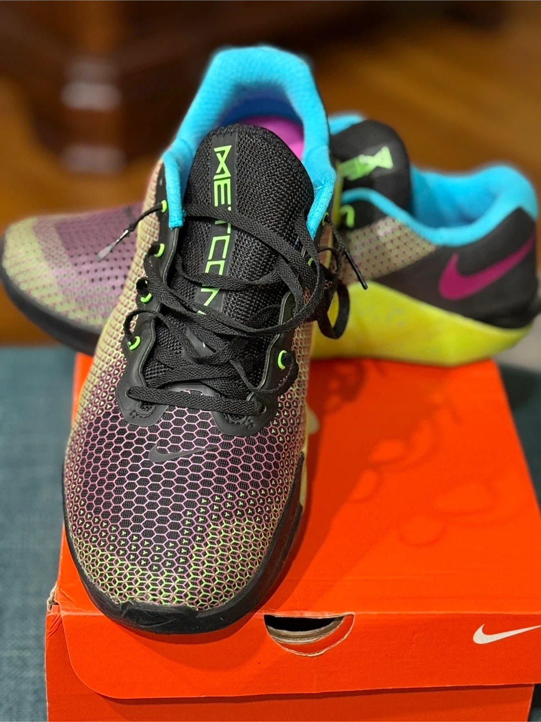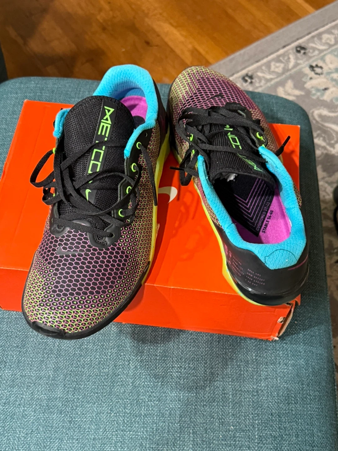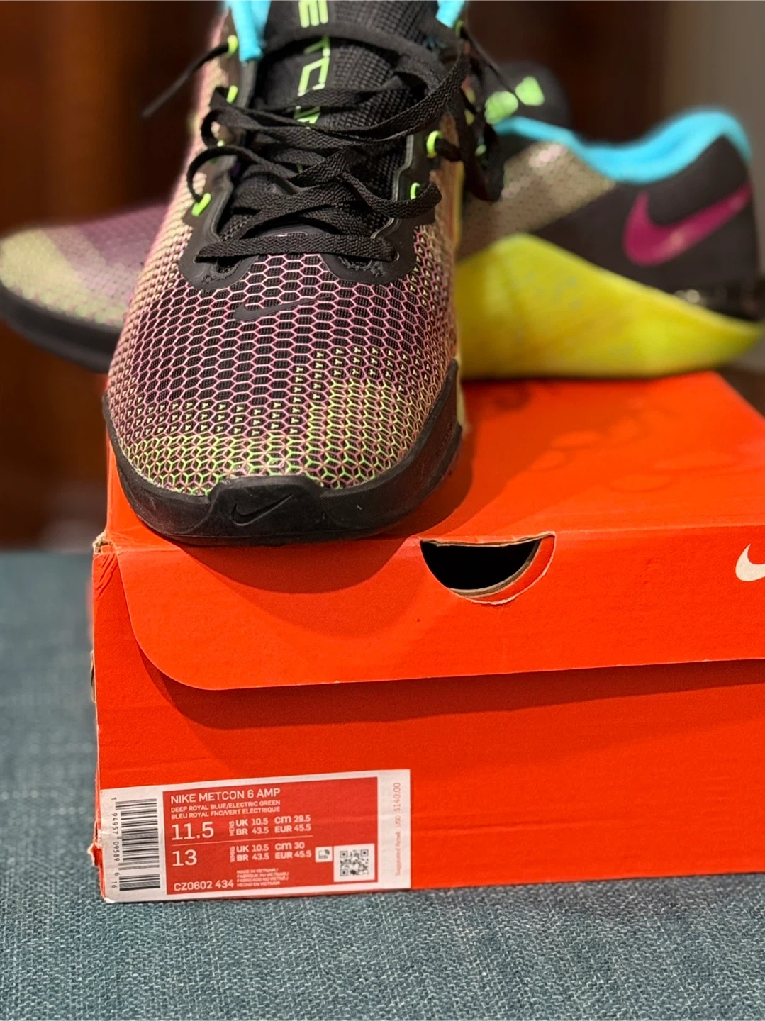 Selling a pair of Nike Metcon 6 AMP men's training shoes in size 11.5 US. They come with the original box. The shoes feature a unique colorway with black laces and a vibrant design. Great for workouts and training!