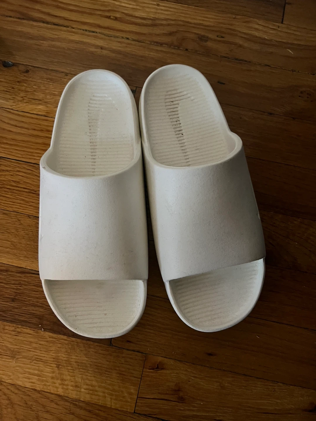 Selling a pair of Nike Offcourt slides in white. They are in good condition and ready for a new owner. Perfect for lounging or wearing around town!