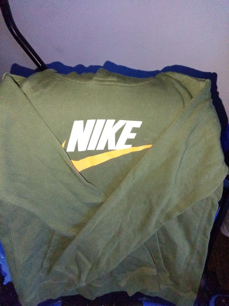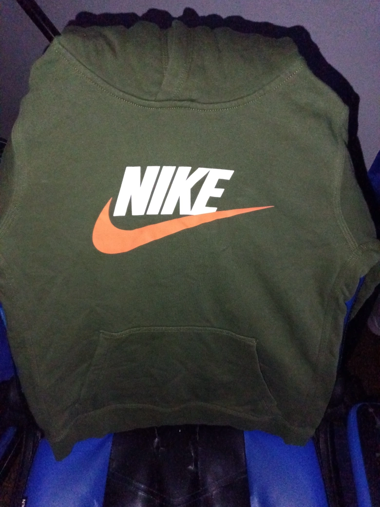 10Selling a Nike hoodie in a nice olive green color. It's a size XL and has the classic Nike logo on the front. Perfect for staying cozy! kids sz