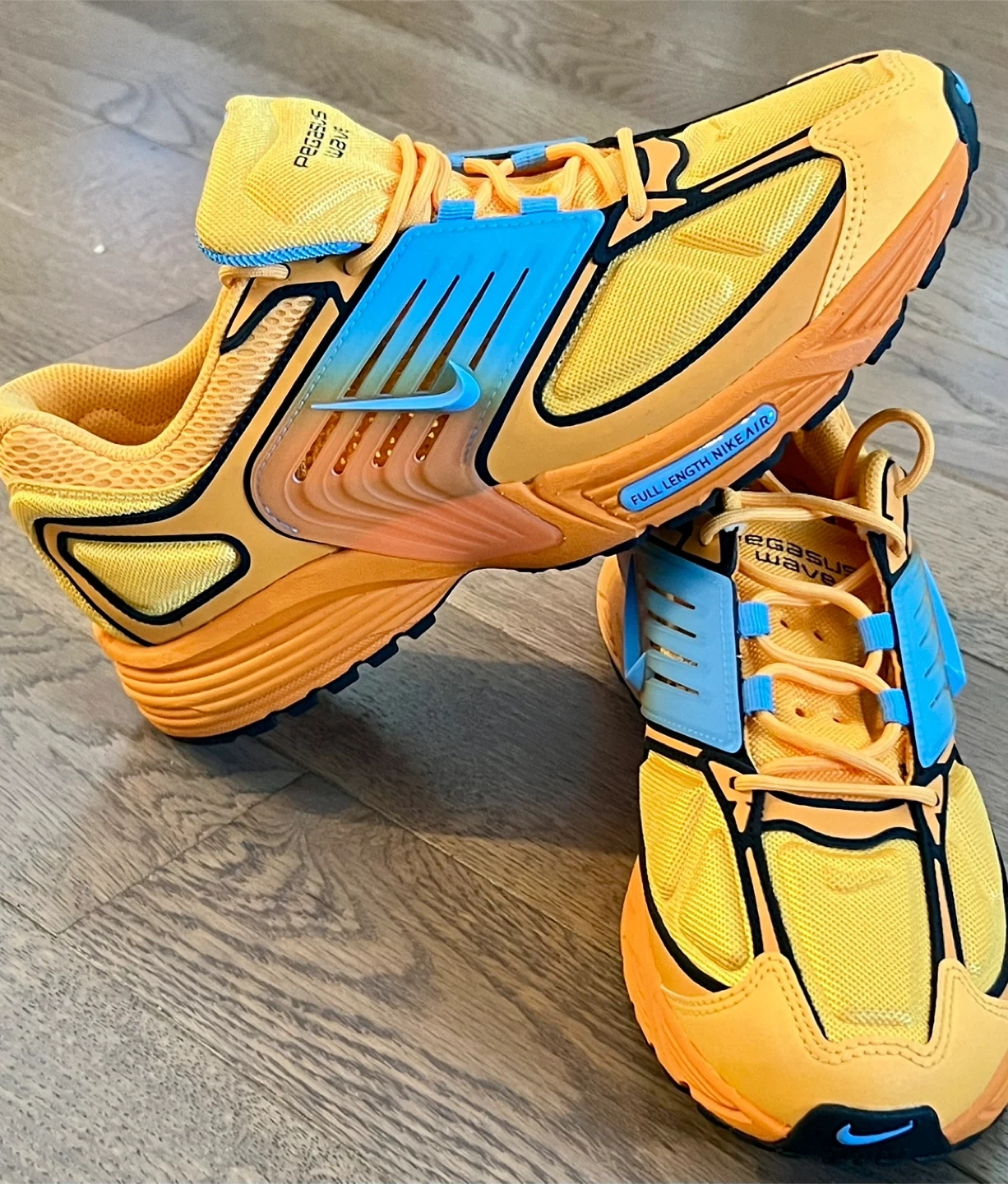 94Nike Pegasus Wave sneakers! They feature a vibrant yellow and orange colorway with blue accents. The shoes are a US size 10.5
