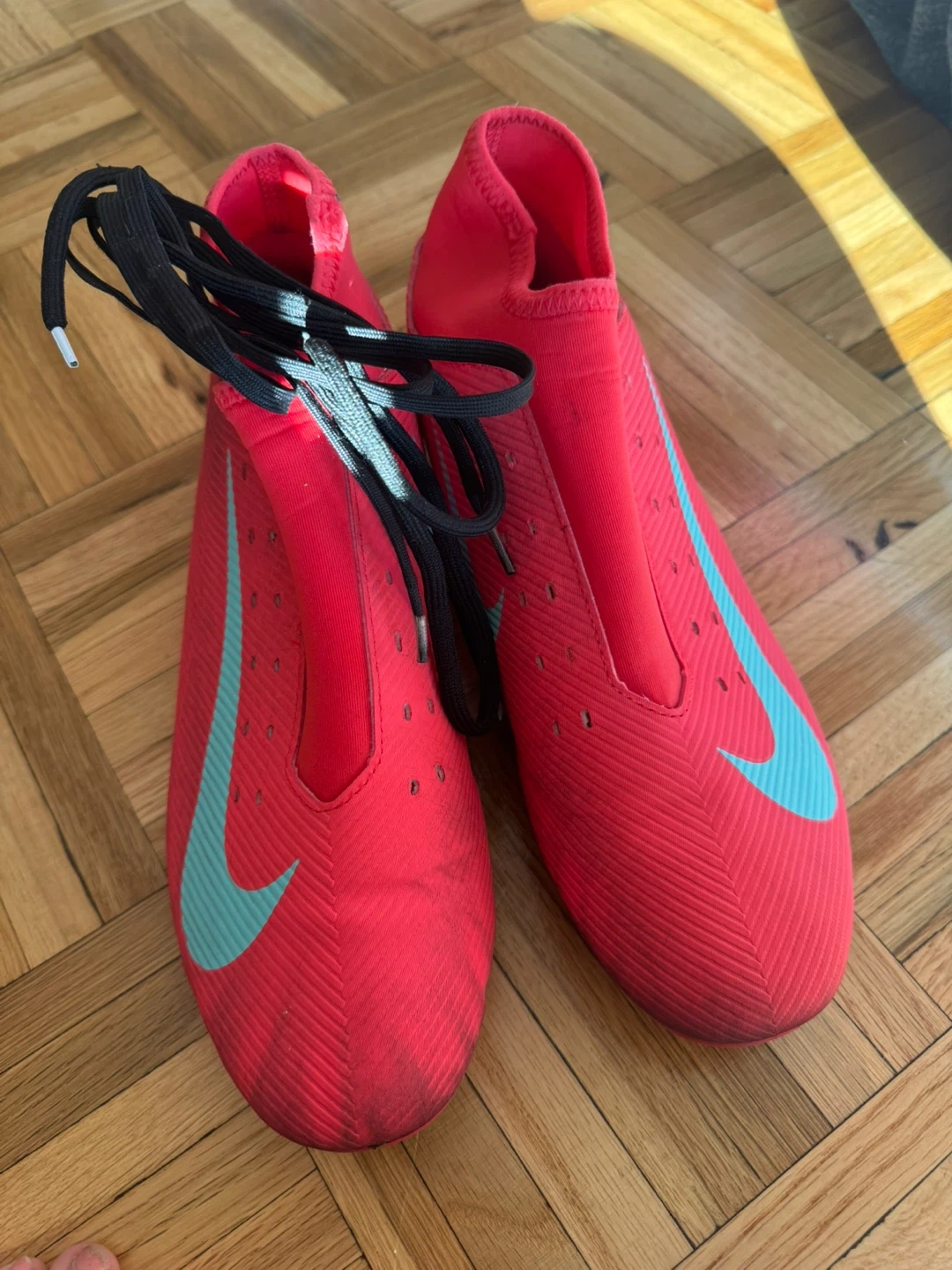 88Selling a pair of Nike Phantom GX soccer cleats in pink with a blue Nike swoosh. They show some signs of wear, but still have plenty of life left for the field!