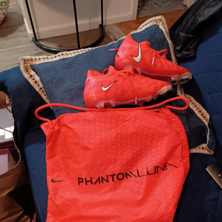 Selling a pair of Nike Phantom Luna soccer cleats in size 7. These bright red cleats come with a matching Nike bag. Perfect for the soccer field!
