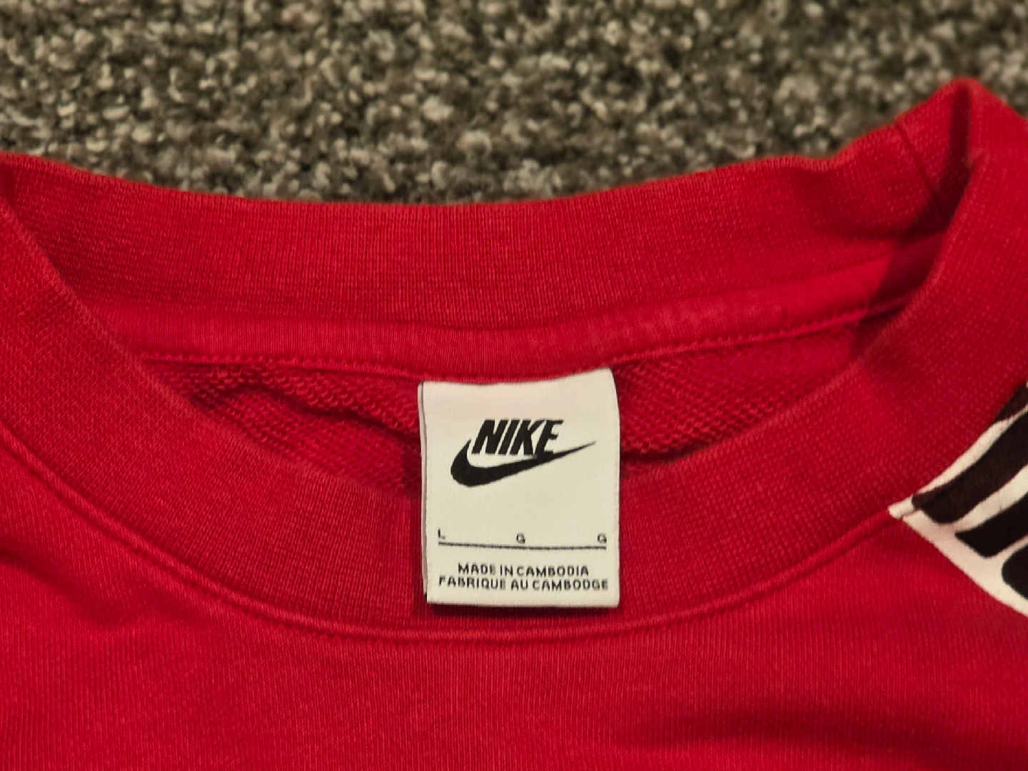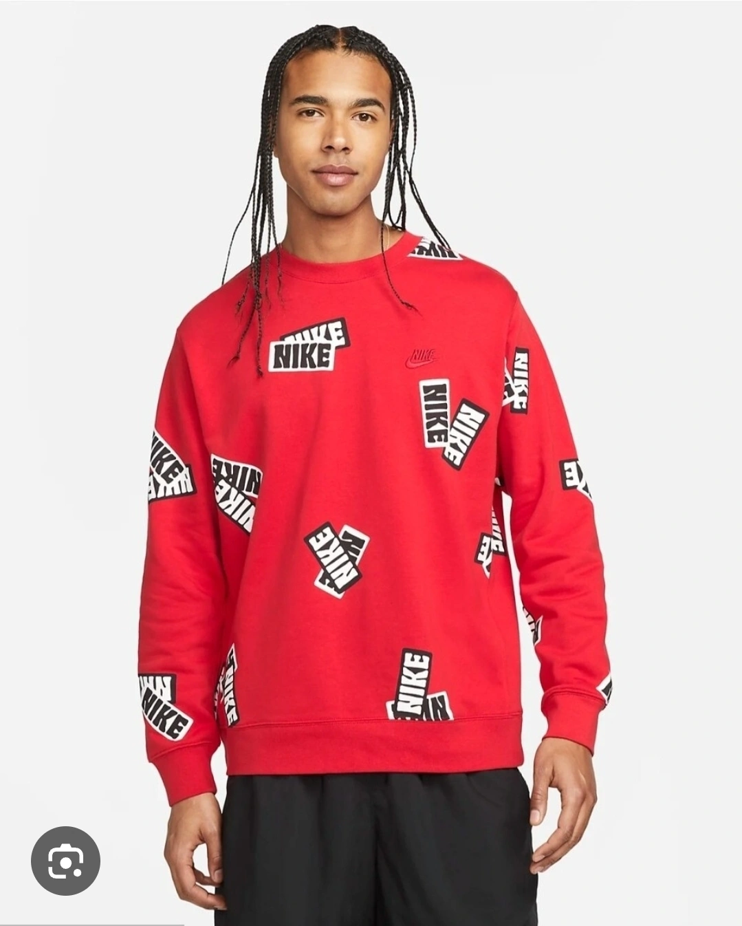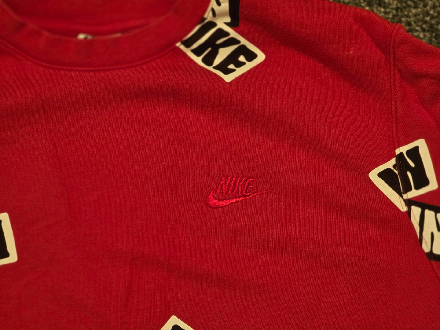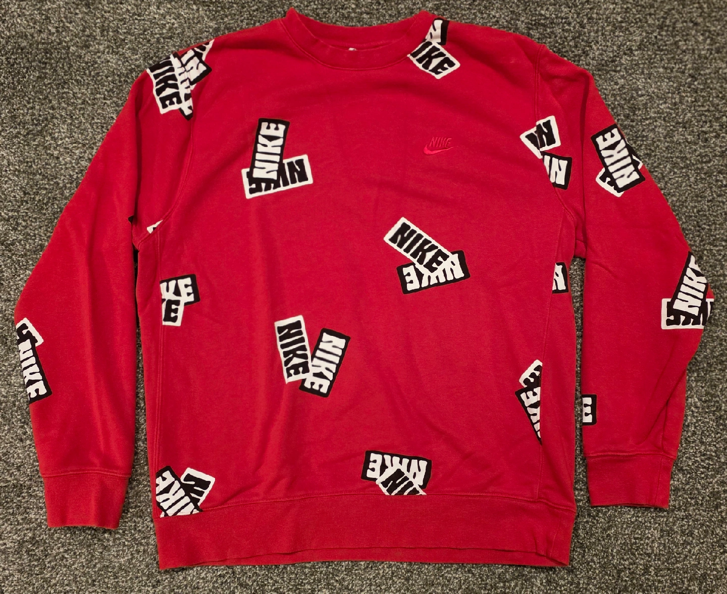 Selling a red Nike crewneck sweatshirt in size large. It features a cool all-over print with the Nike logo. Great for casual wear! Pick up in Naperville near naper blvd and 87th street or near downtown Naperville off of Chicago and Charles