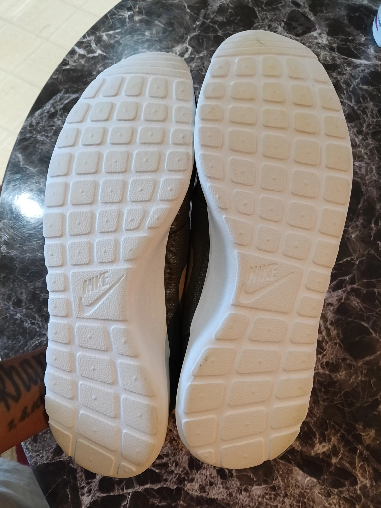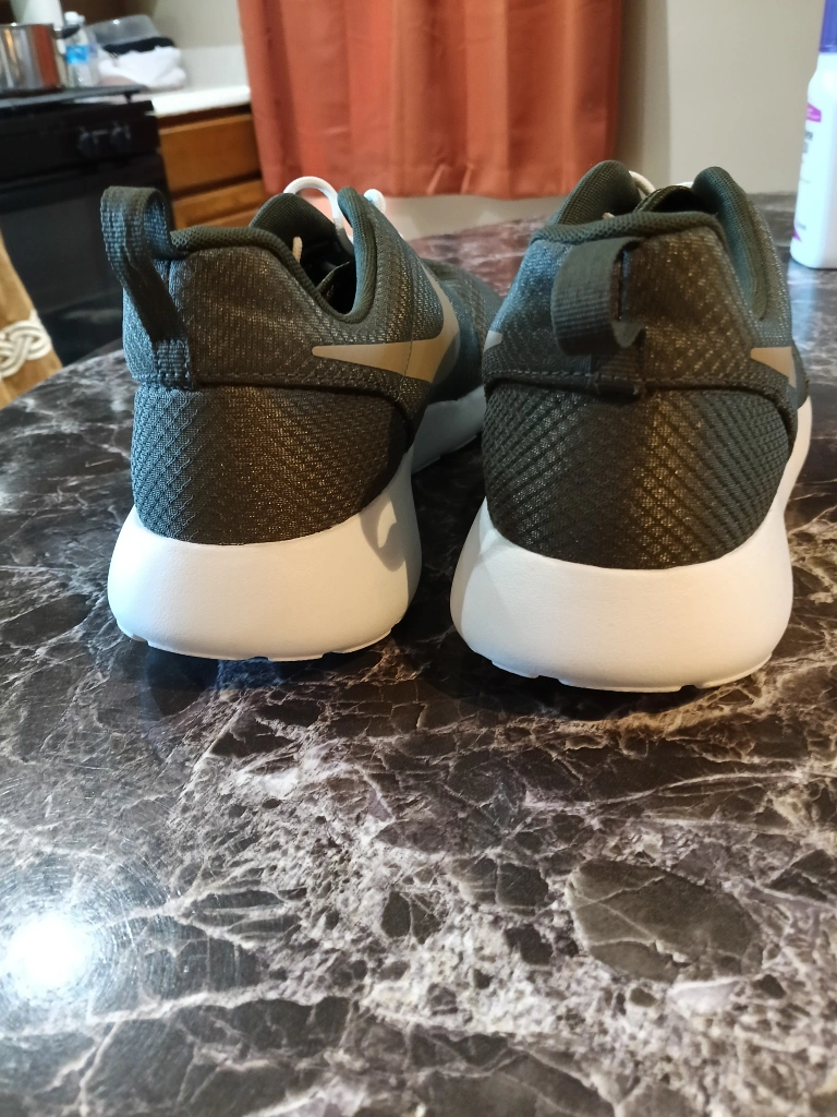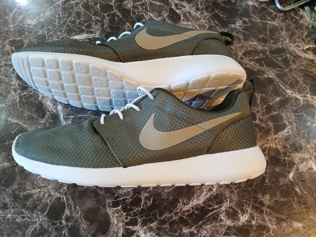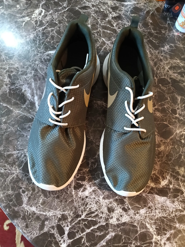 Selling a pair of Nike Roshe sneakers in olive green men's size 12. They have white soles and laces, and the Nike swoosh is visible on the sides, These shoes are brand new firm $20
