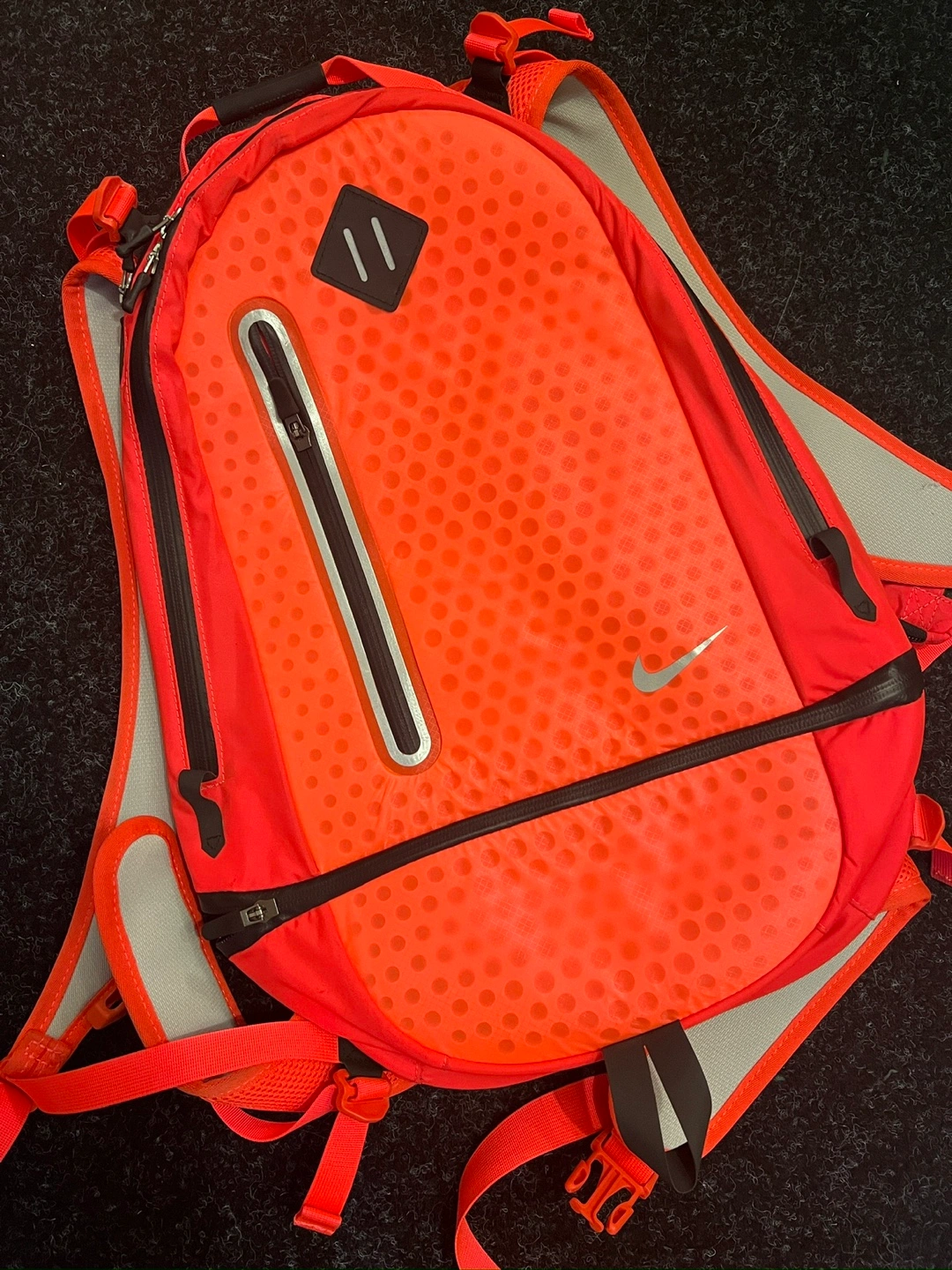 Orange running backpack. Features multiple pockets and adjustable straps. Great for runners. Used once or twice - that’s it !!!