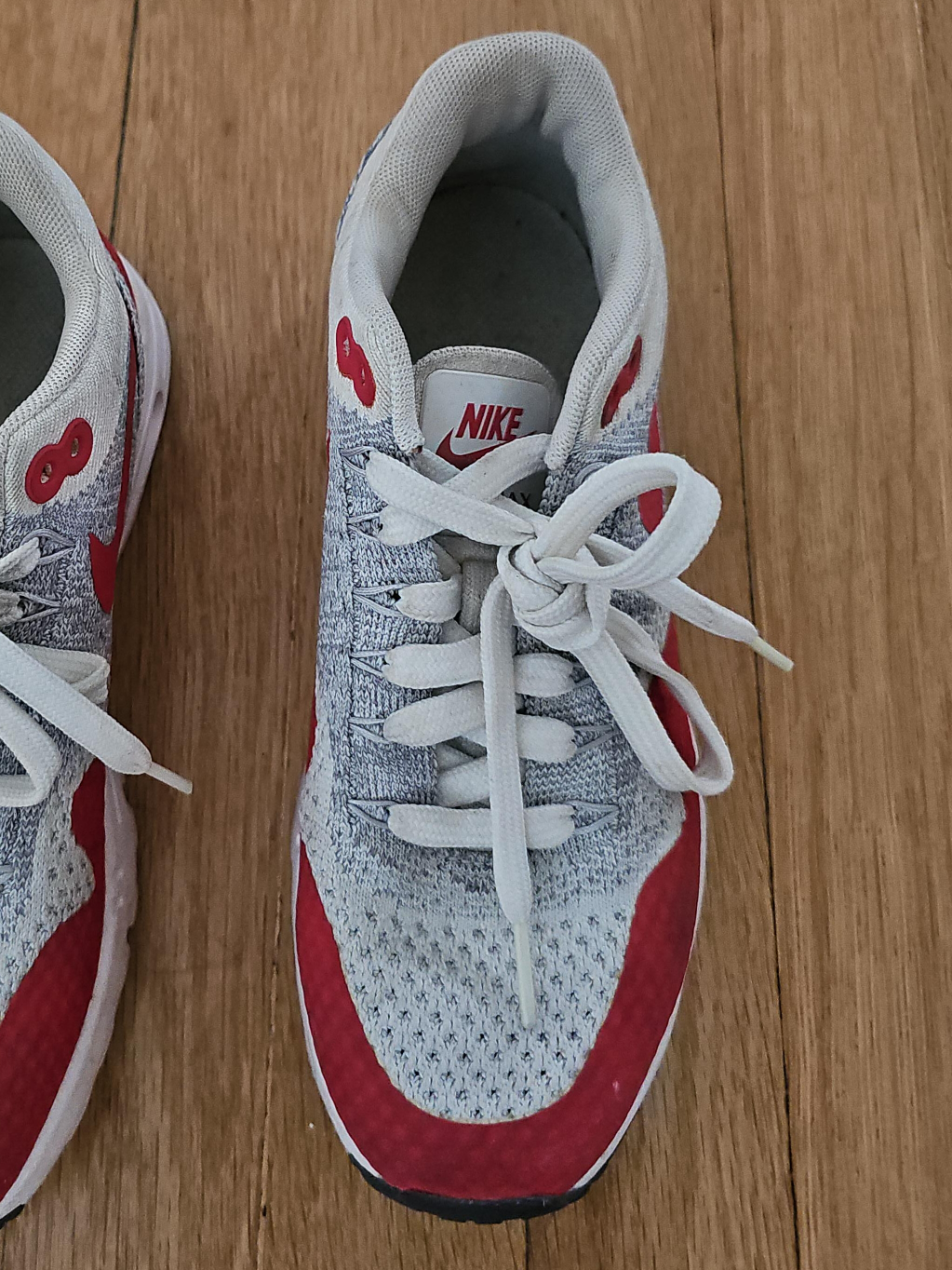Selling a pair of Nike running shoes. They feature a gray and white knit upper with red accents. Great for casual running or everyday wear!