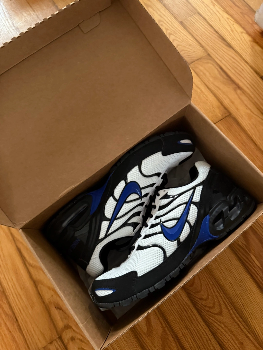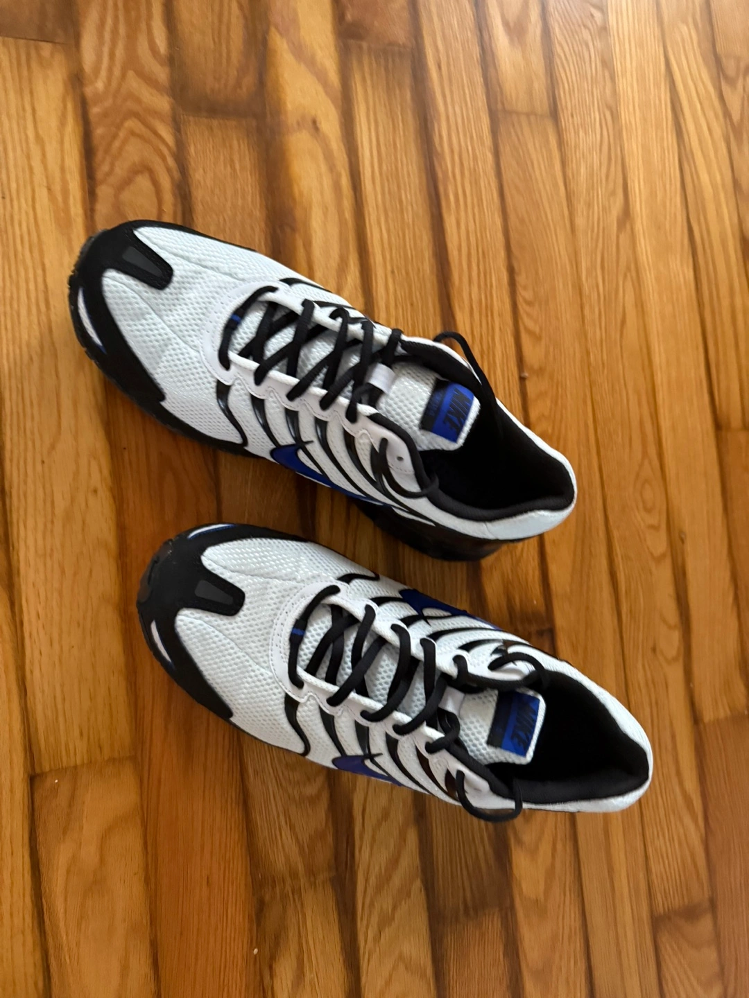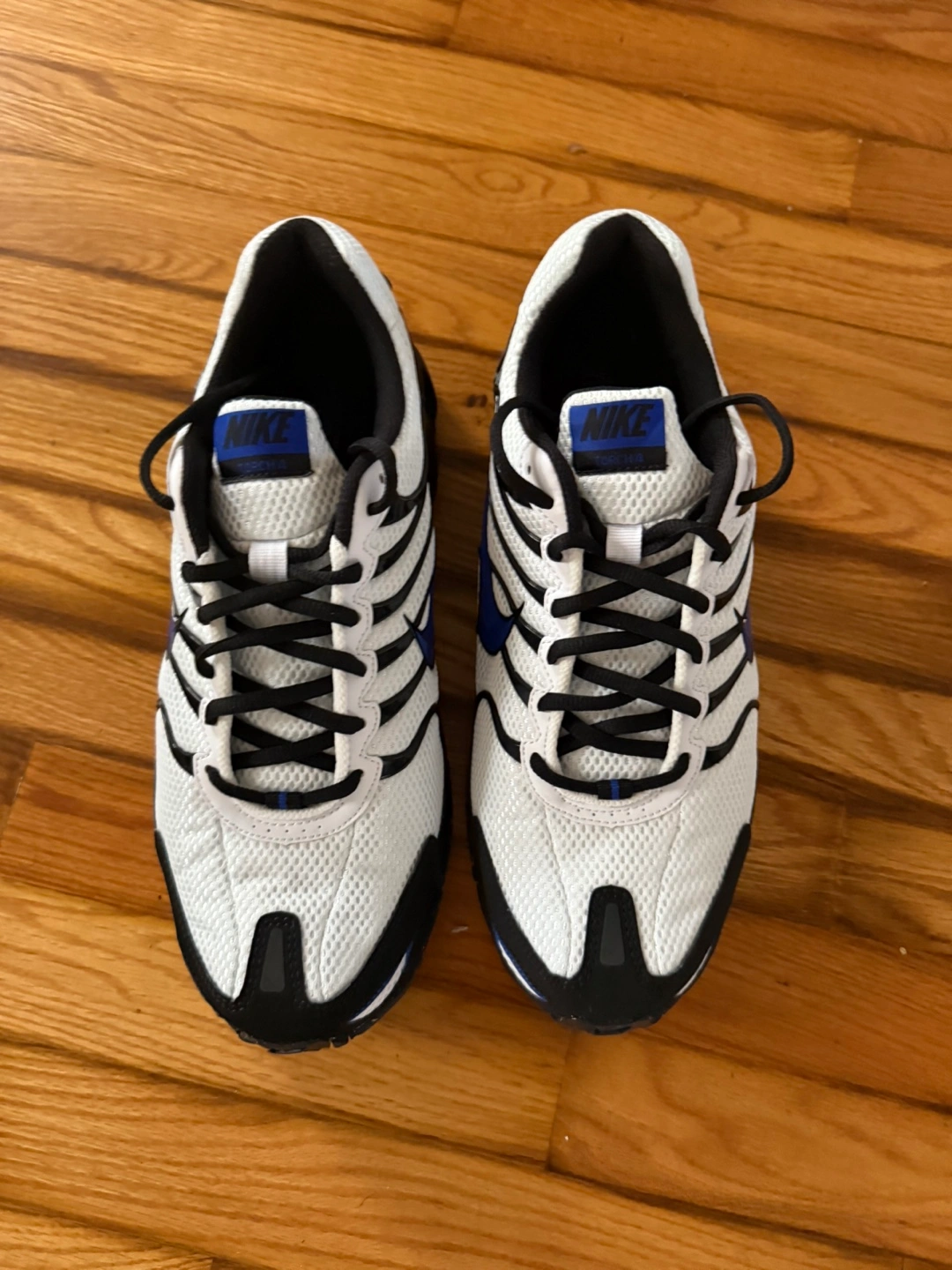 Selling a pair of Nike running shoes in white, black and blue. They come with the original box.