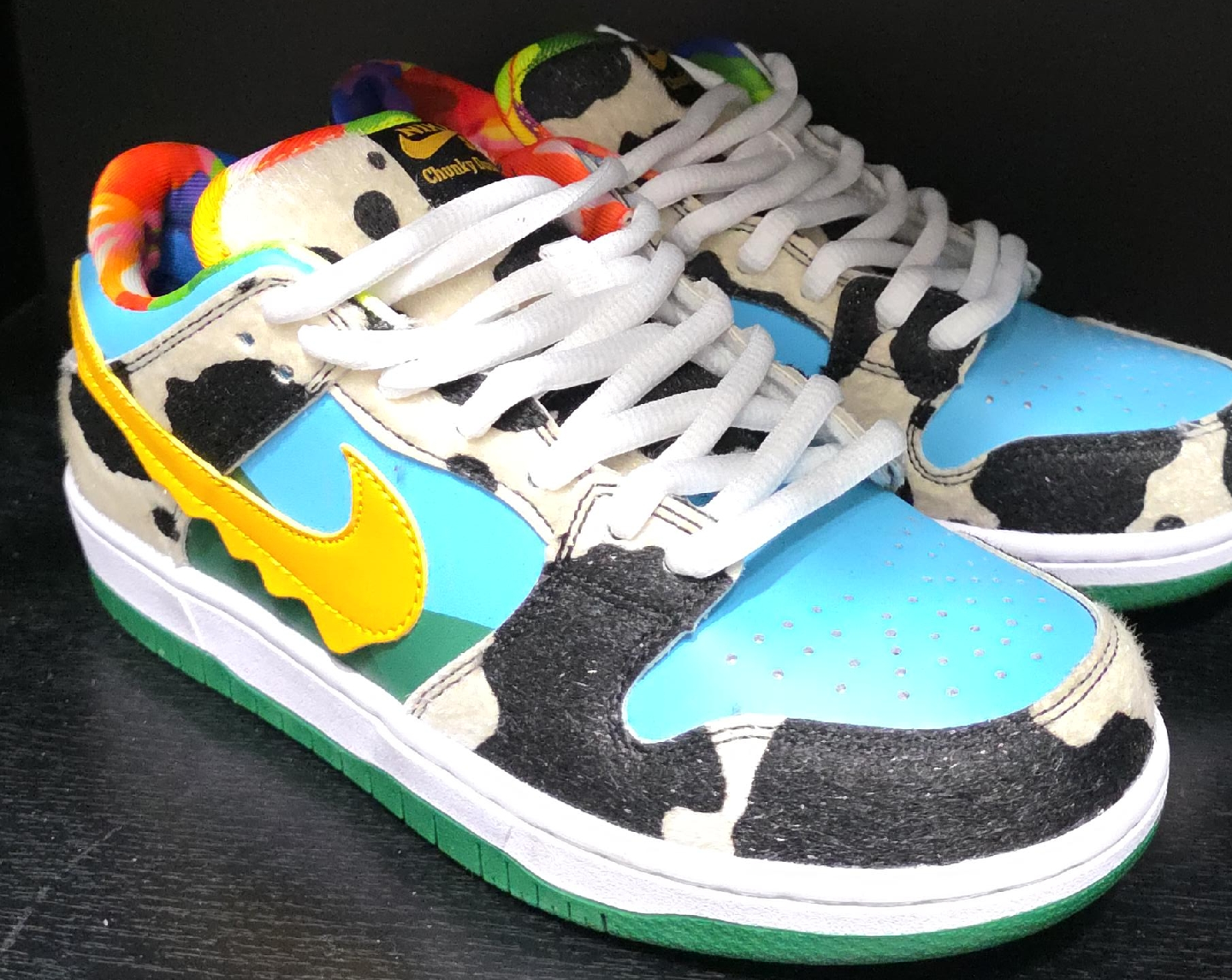 65Selling a pair of Nike SB Dunk Lows in the Ben & Jerry's Chunky Dunky colorway. These are a fun and unique pair of sneakers with the iconic cow print and vibrant colors. They are in good condition and ready for a new home!