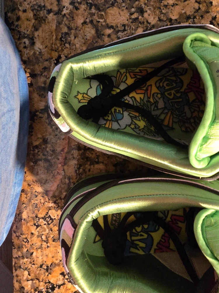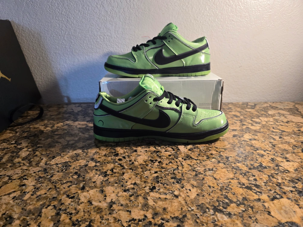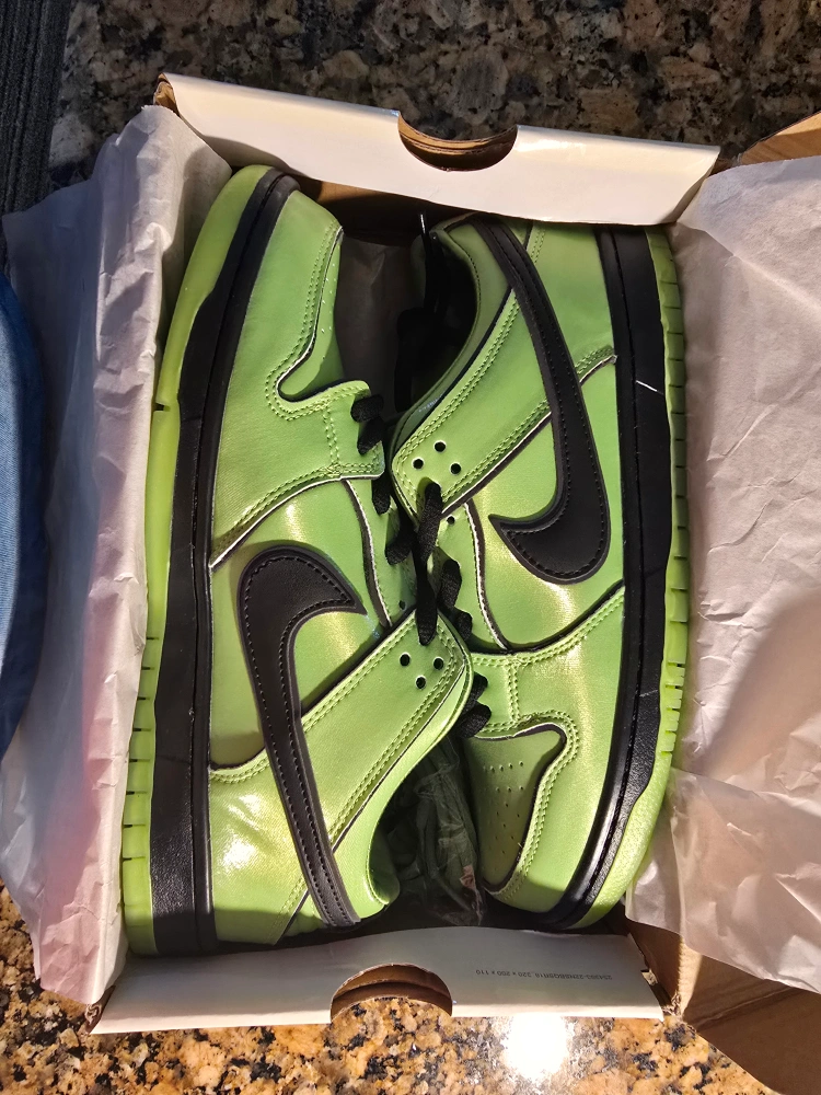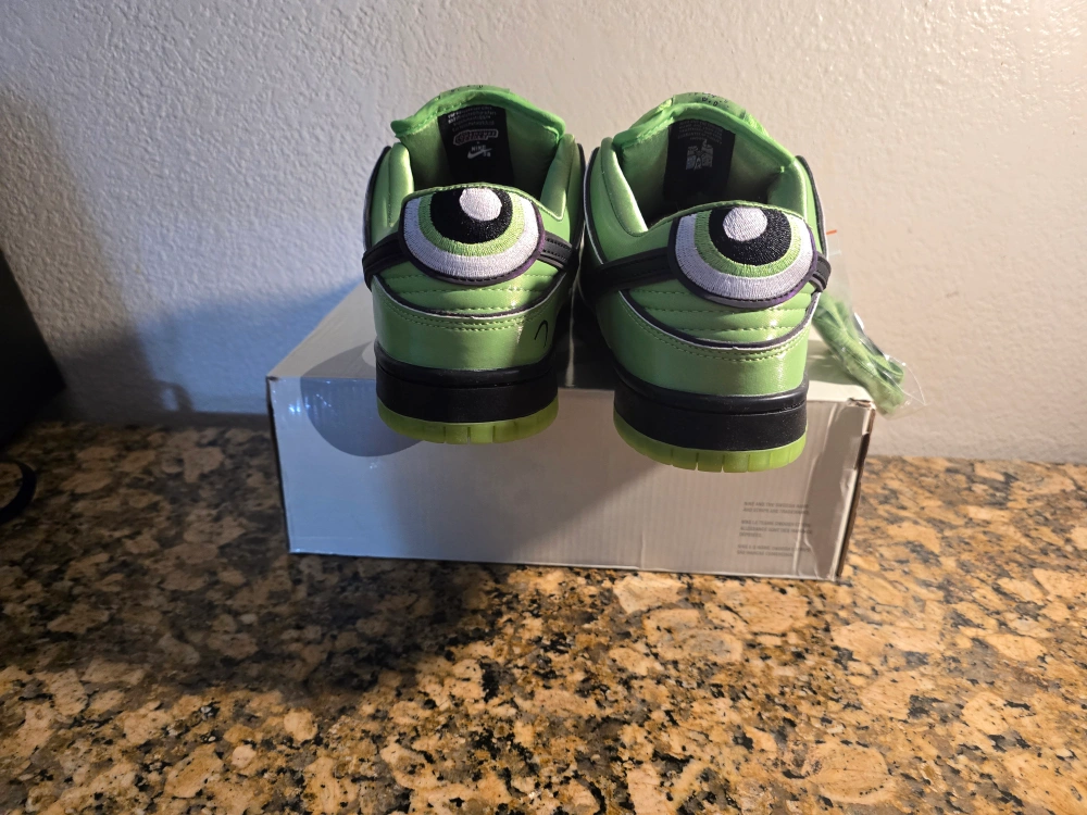 Selling a pair of Nike SB Dunk Low Powerpuff Girls Buttercup shoes! These are a vibrant green with black accents, and they come with the original box. The shoes feature unique details inspired by the Buttercup character. They're in great condition and ready for a new home