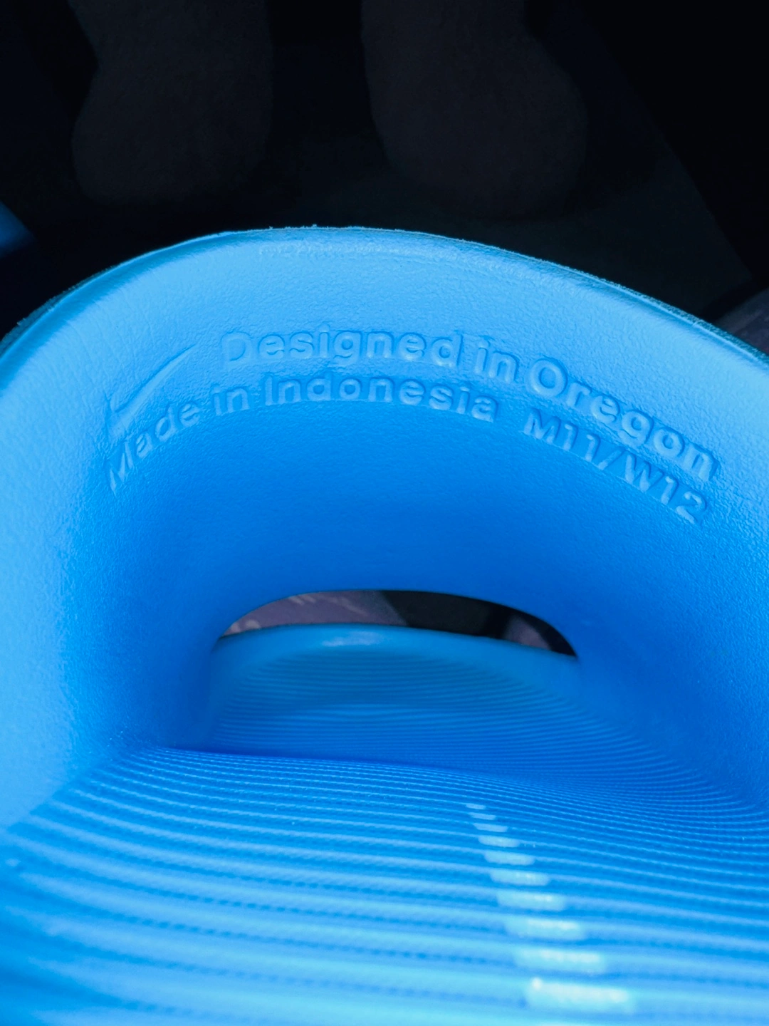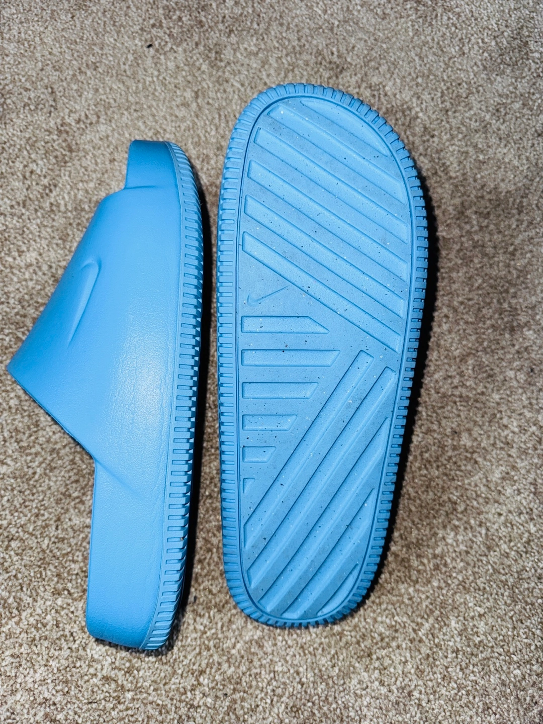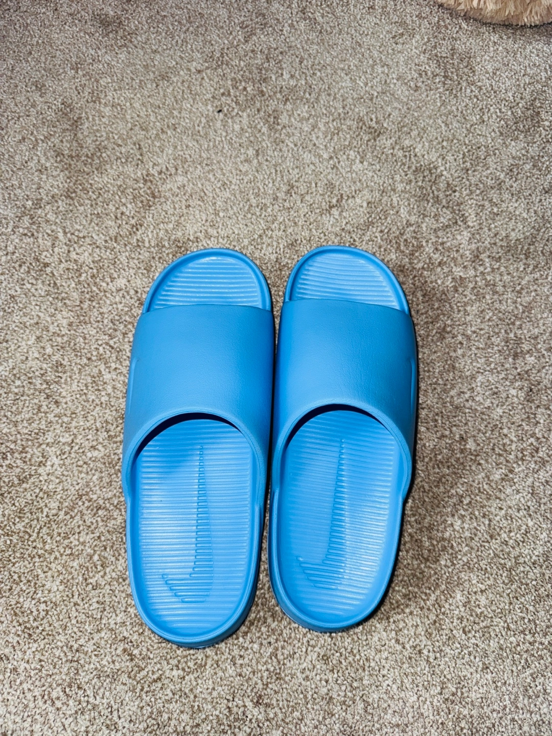 Selling a pair of Nike slides in a nice light blue color. They are a men's size 11, which is also a women's size 12. These slides are perfect for casual wear or around the house Never used