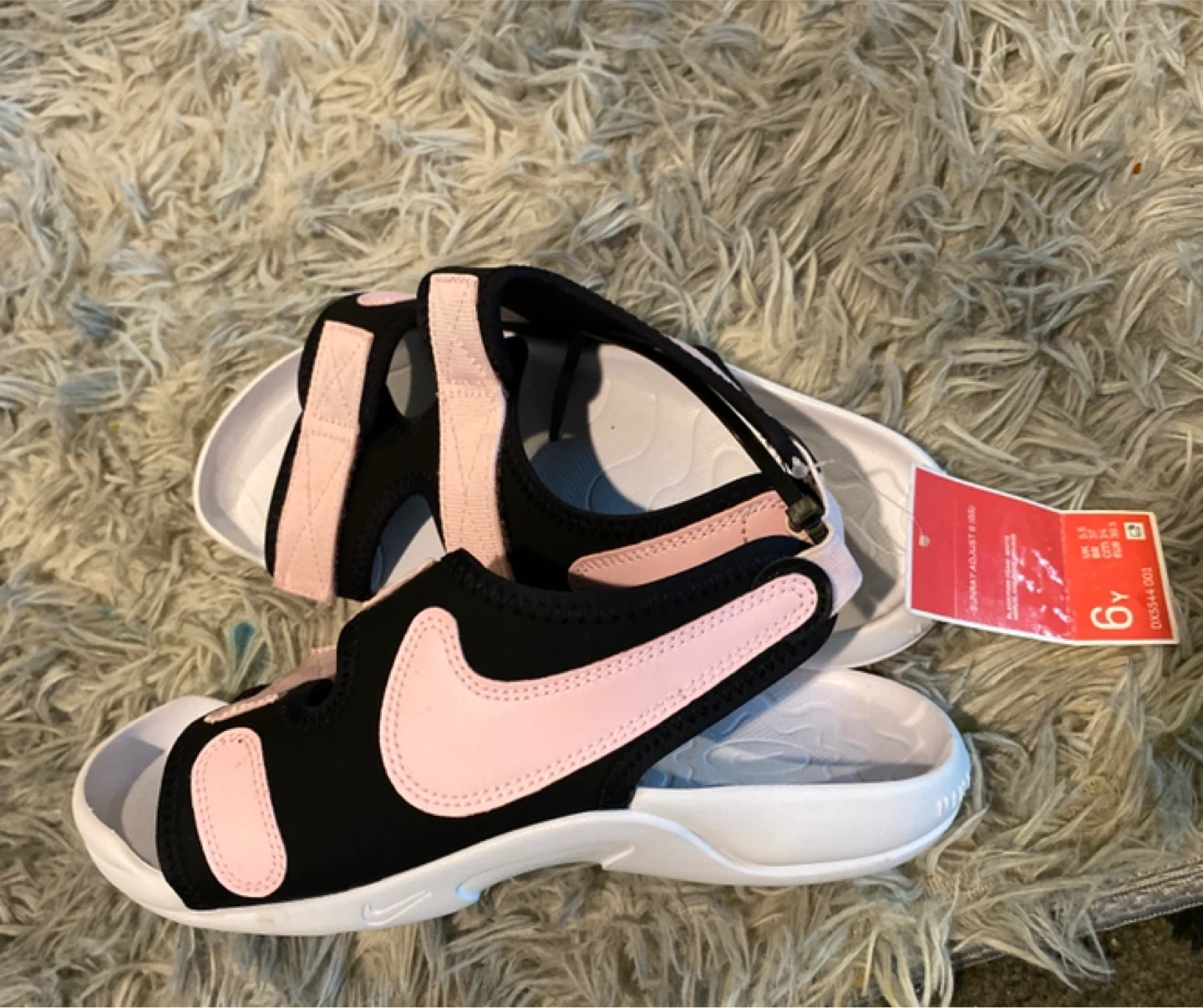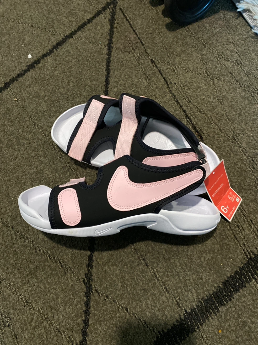 I'm selling a pair of Nike Sunray Adjust 6 sandals in size 6Y! They're black with a pink swoosh and adjustable straps. Perfect for summer!