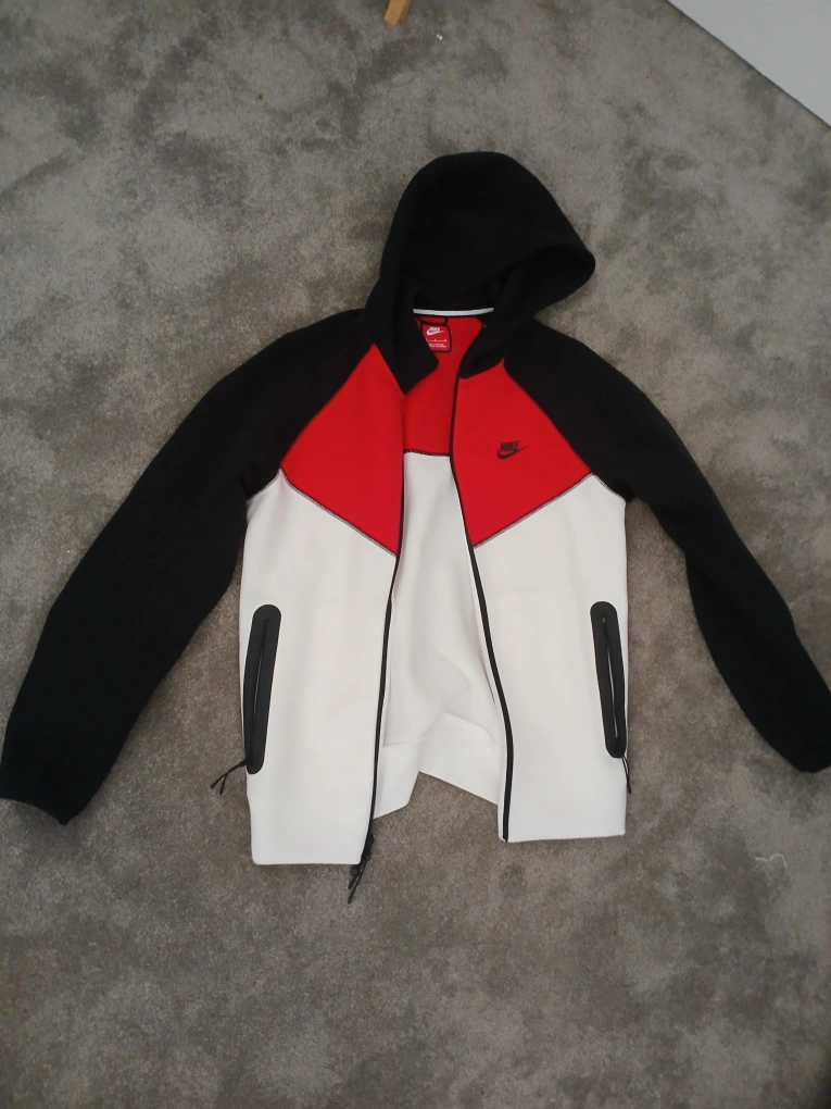 Selling a Nike Tech Fleece hoodie in a cool red, black, and white colorway! It's a size small and in great condition. Perfect for staying comfy and stylish!