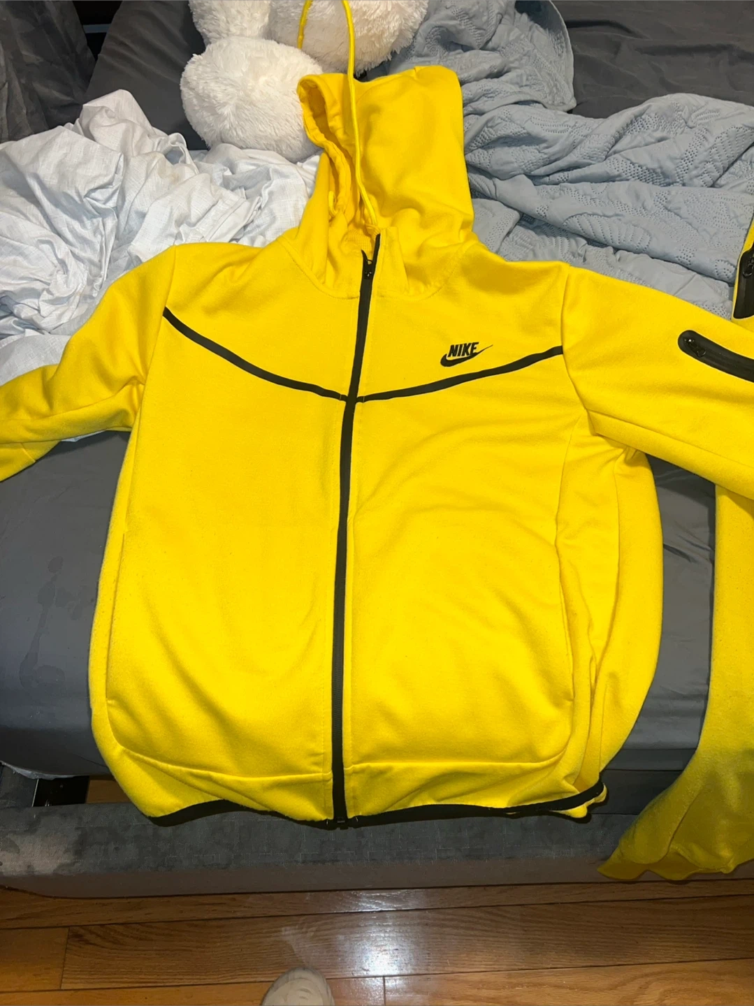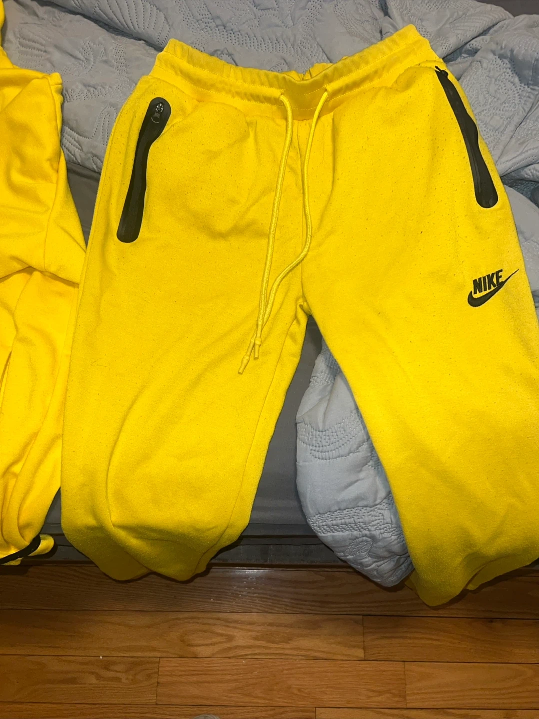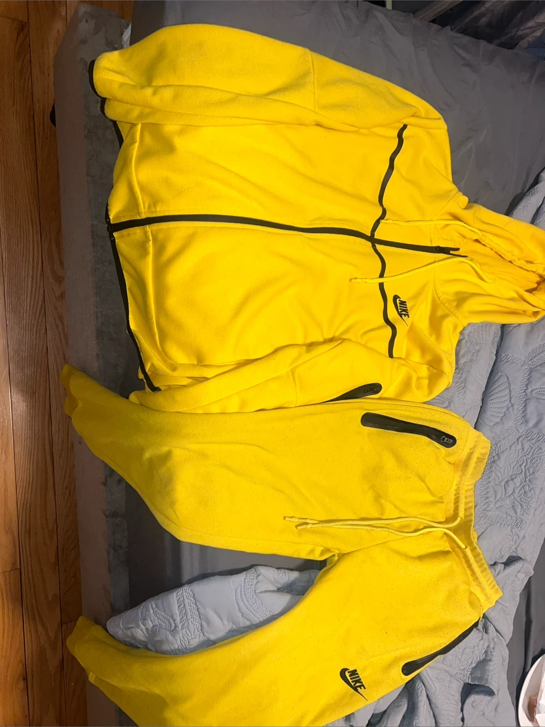 Selling a Nike Tech Fleece set in yellow! It includes both the hoodie and the pants. The set is in used condition and perfect for workouts or just lounging around. Feel free to reach out if you have any questions!