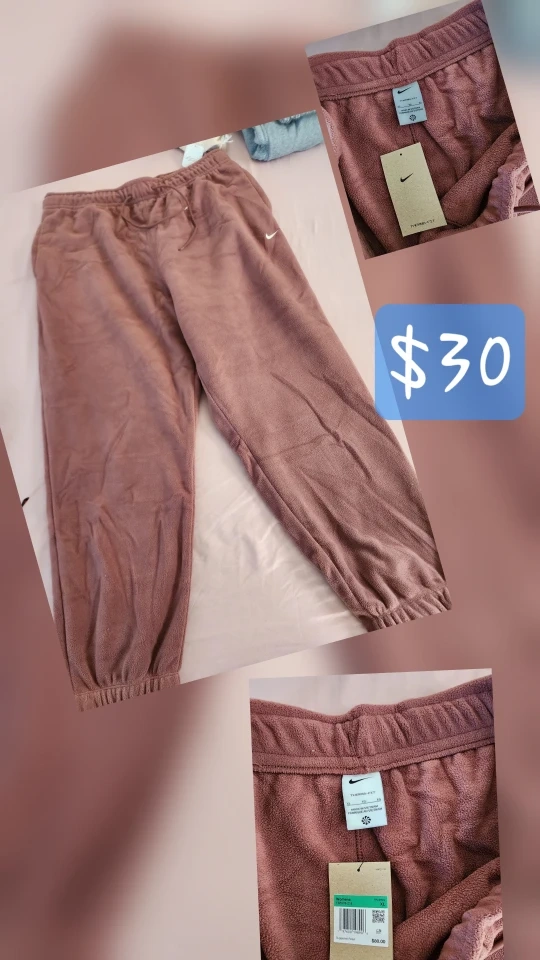60These are a pair of Nike Therma-FIT fleece pants for women. They are a size XL and in a lovely mauve color. The pants are made of a soft fleece material, perfect for staying cozy! They look to be in great condition and ready for a new home