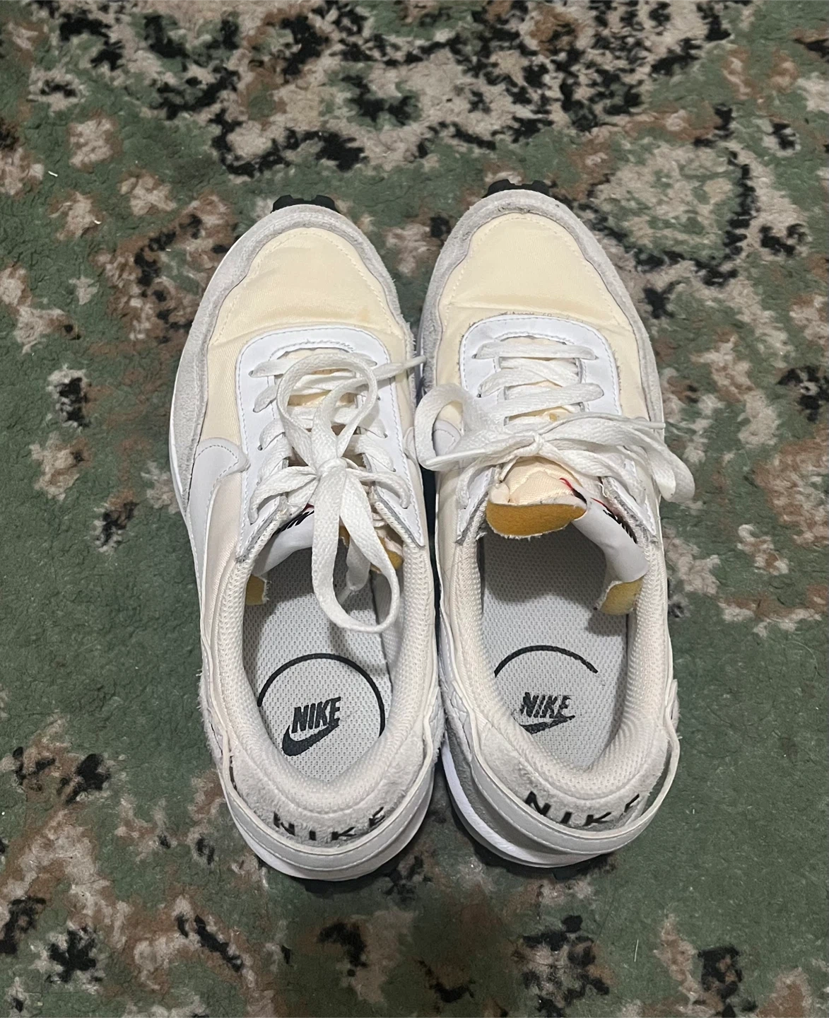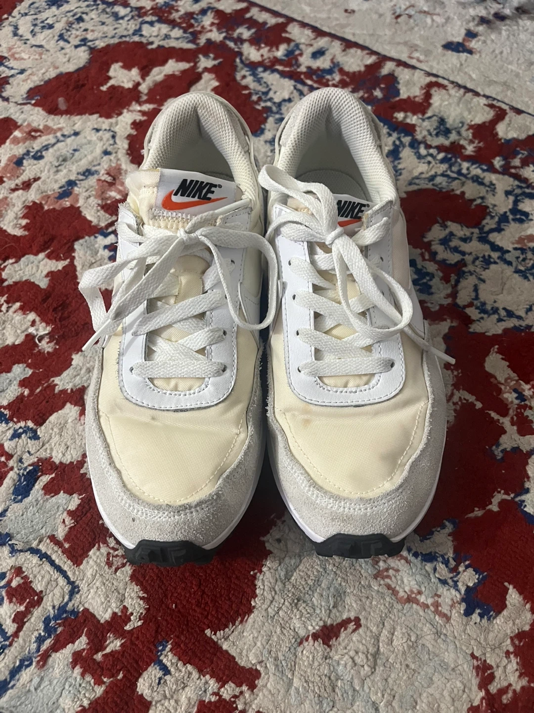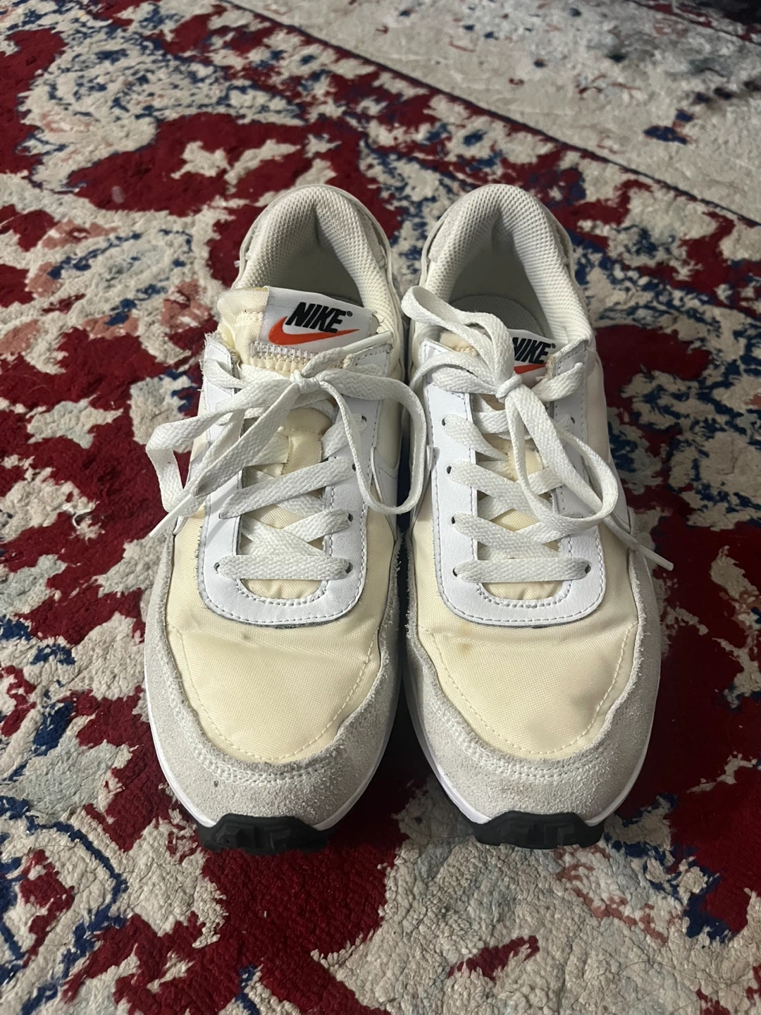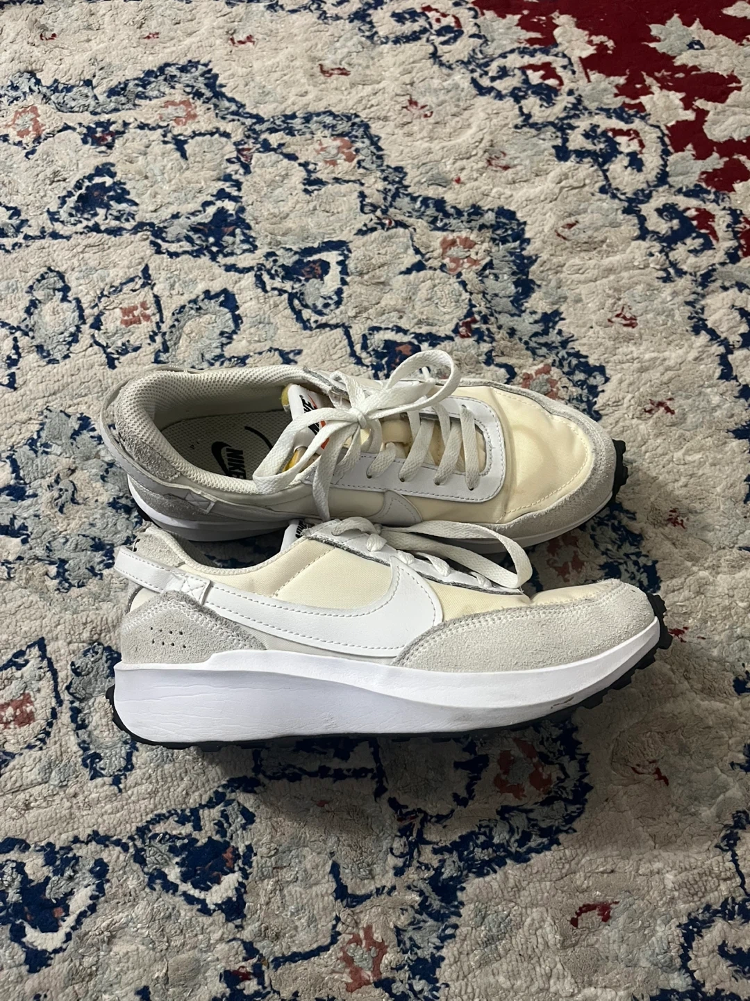Selling a pair of Nike Waffle Debut sneakers in a cream and white colorway. They have some signs of wear, but are still in good condition for everyday use. Please take a close look at the photos to assess the condition before purchasing!