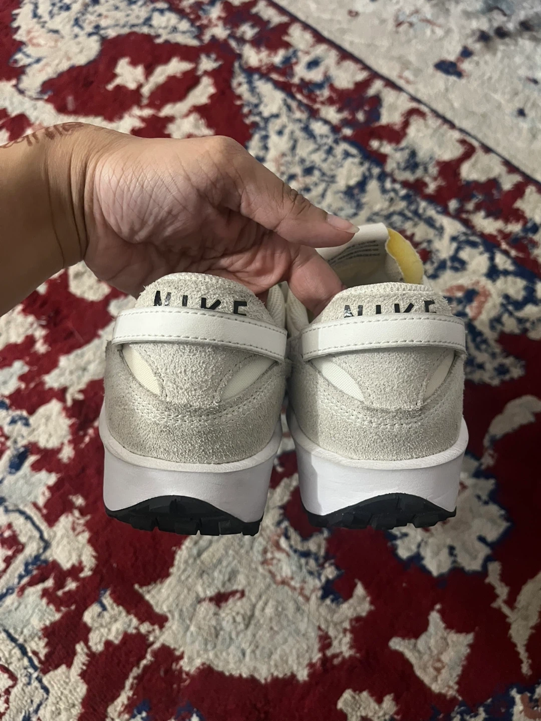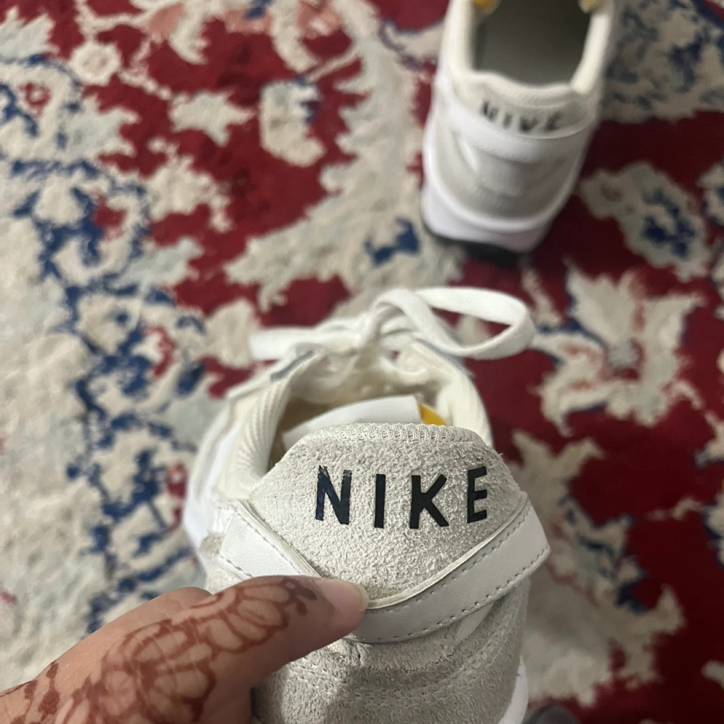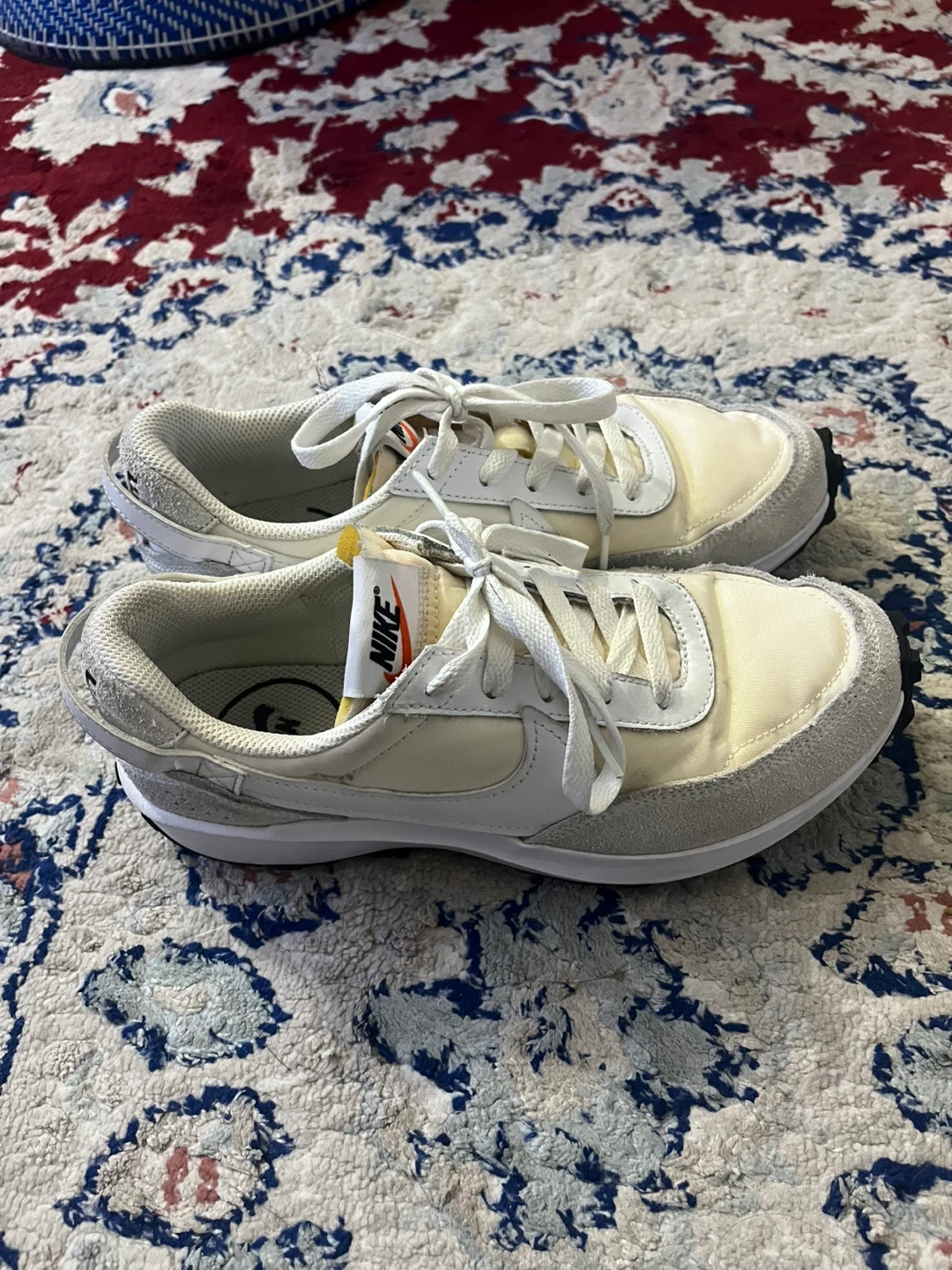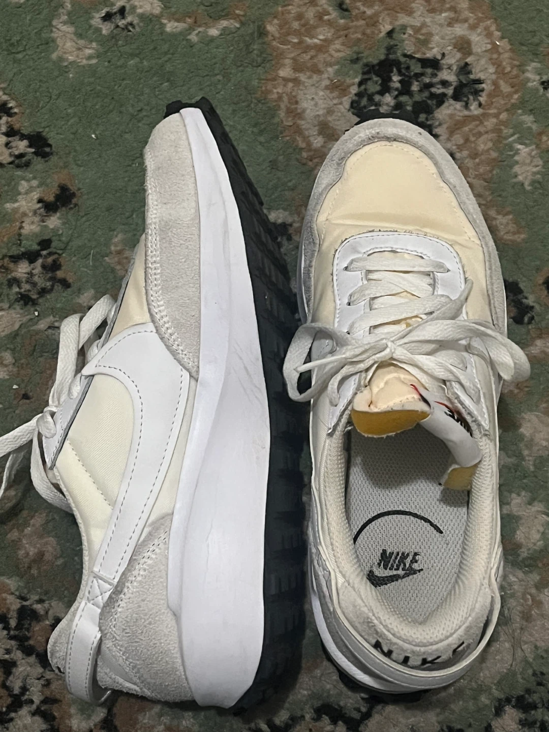 Selling a pair of Nike Waffle Debut sneakers in a cream and white colorway. They have some signs of wear, but are still in good condition for everyday use. Please take a close look at the photos to assess the condition before purchasing!