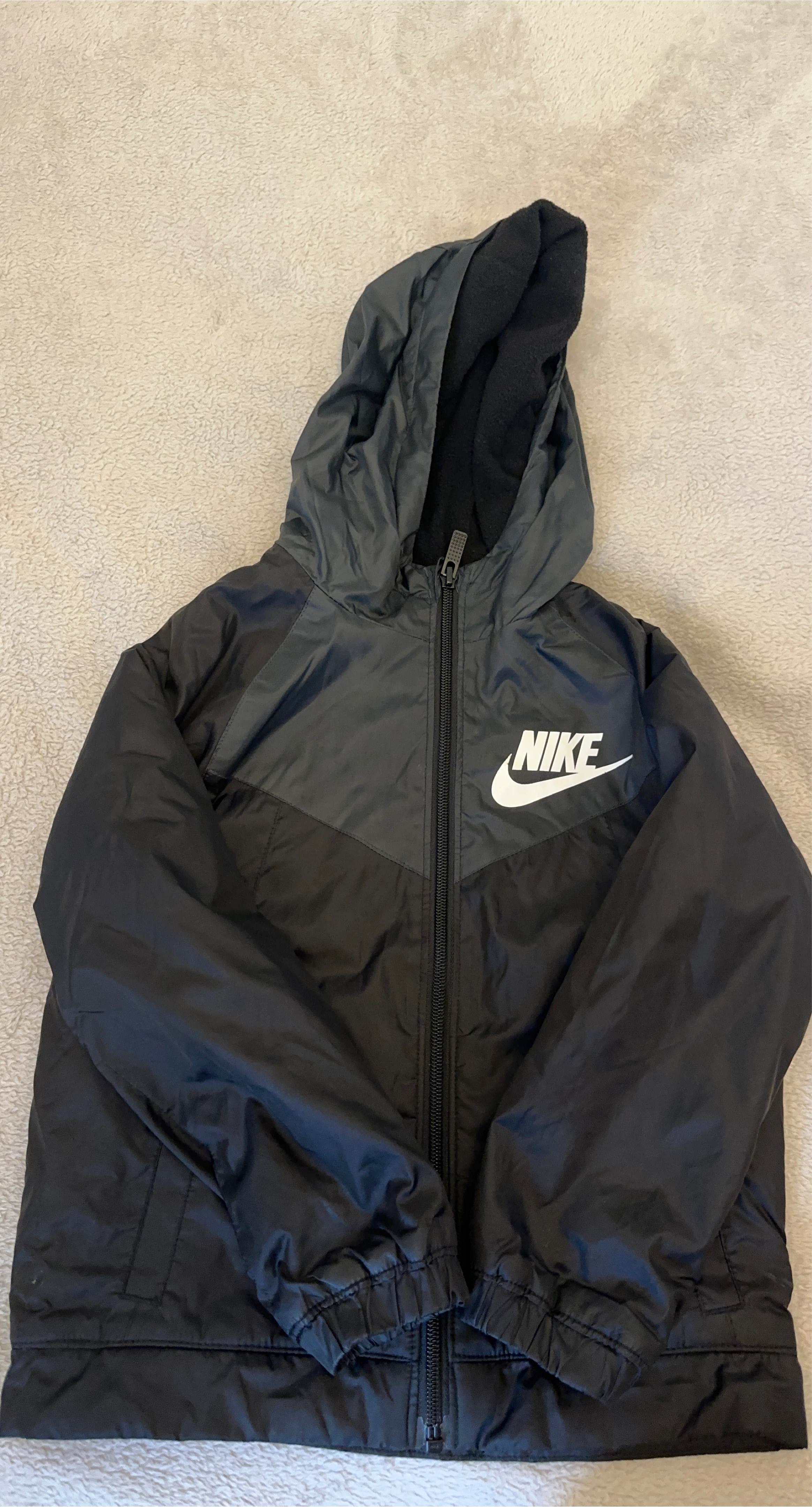 Selling a Nike Windrunner jacket in black, size small. It's in great condition and ready for a new home! Perfect for layering or wearing on its own during milder weather. The jacket features the iconic Nike logo and a comfortable fit. Don't miss out!