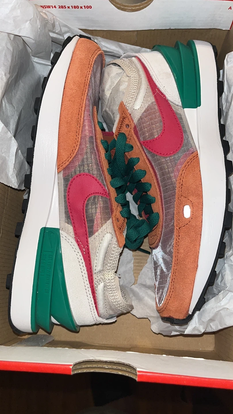 Selling a pair of Nike x Sacai VaporWaffle sneakers in an eye-catching orange and green colorway! These shoes are in great condition and come with the original box. A unique and stylish addition to any sneaker collection!