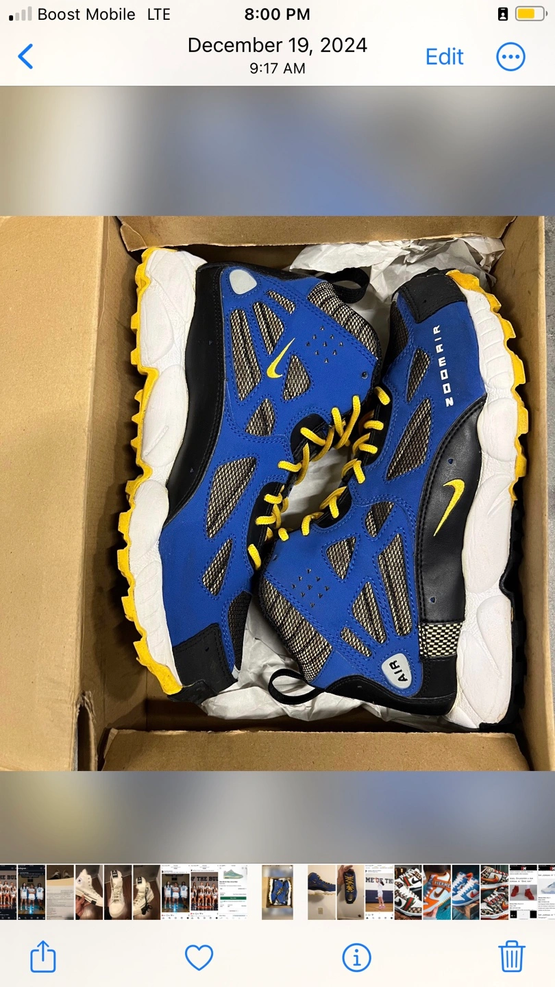Selling a pair of Nike Zoom Air sneakers in blue and black! They're in great condition and come with the original box. The design features a cool, sporty look with yellow accents. Perfect for adding a pop of color to your wardrobe!