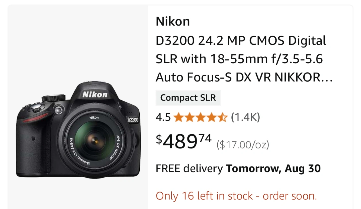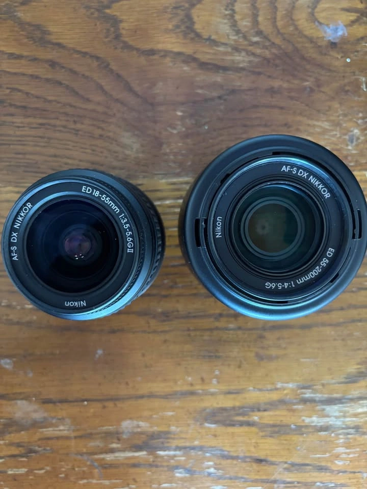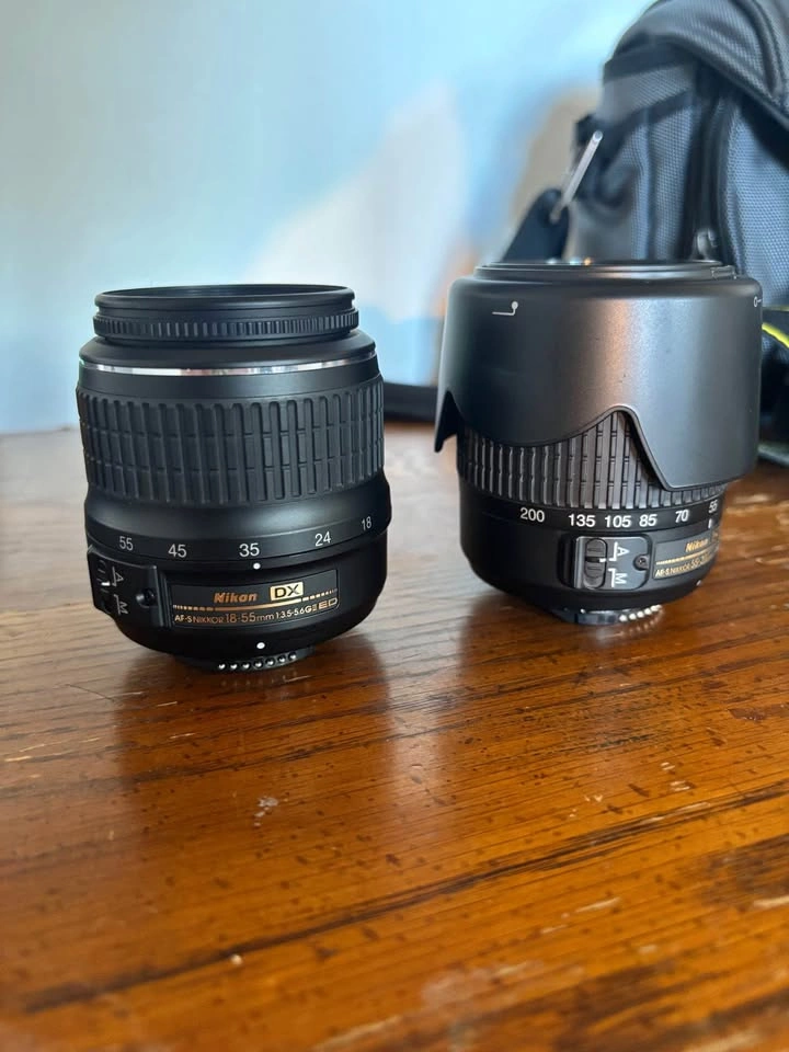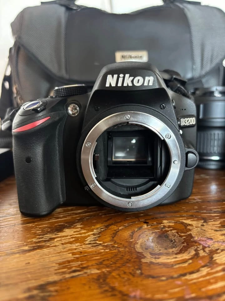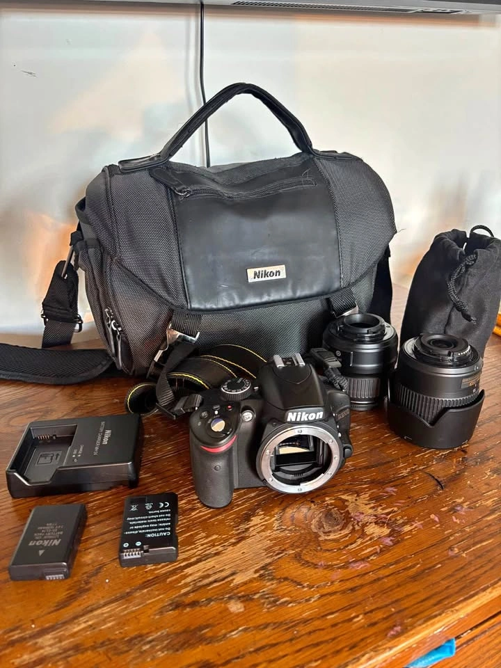 Nikon D3200 24MP DSLR. Comes with 2 kit lenses and lens hood. 18-55mm, 55-200mm. Can be 3 lenses I can throw in a 70-300mm for $20. Mini tripod and remote shutter. 2 batteries with charger. Camera bag included.