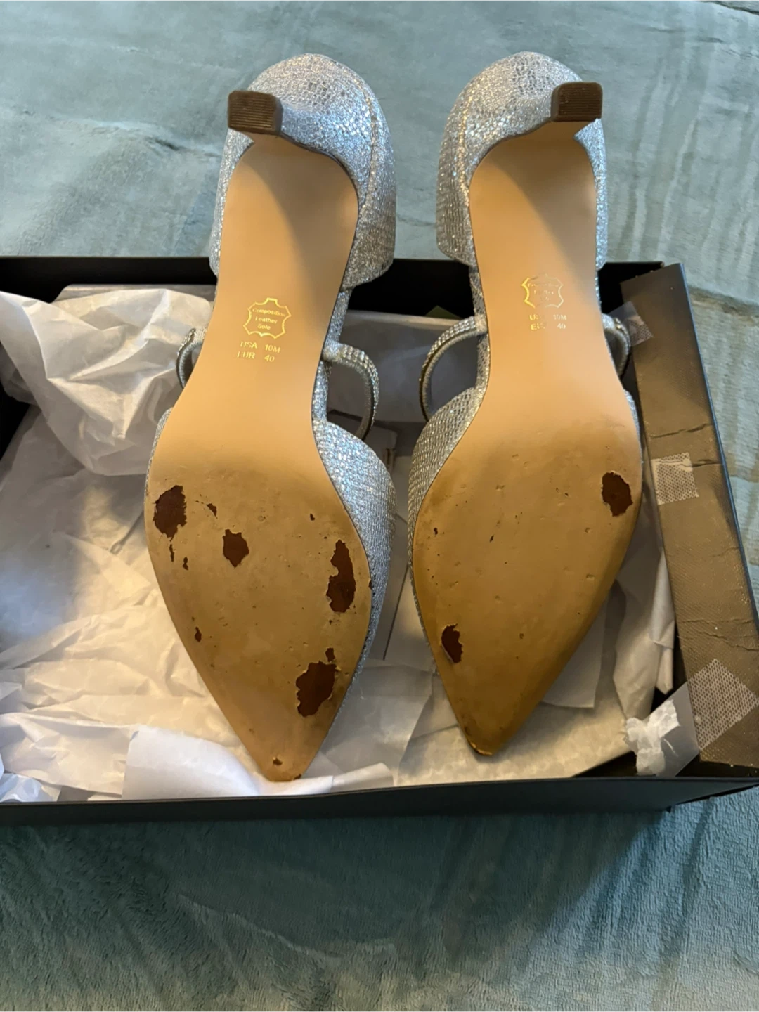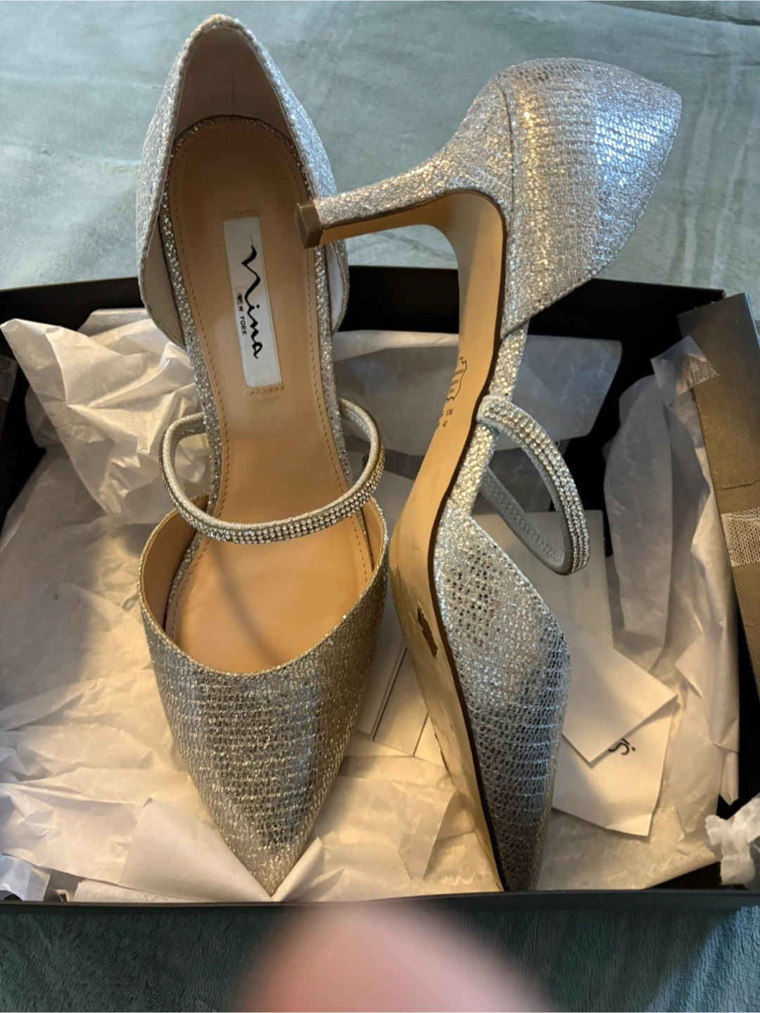 10Selling a pair of Nina silver heels in size 10M. They come with the box. Please note that the soles show some wear.