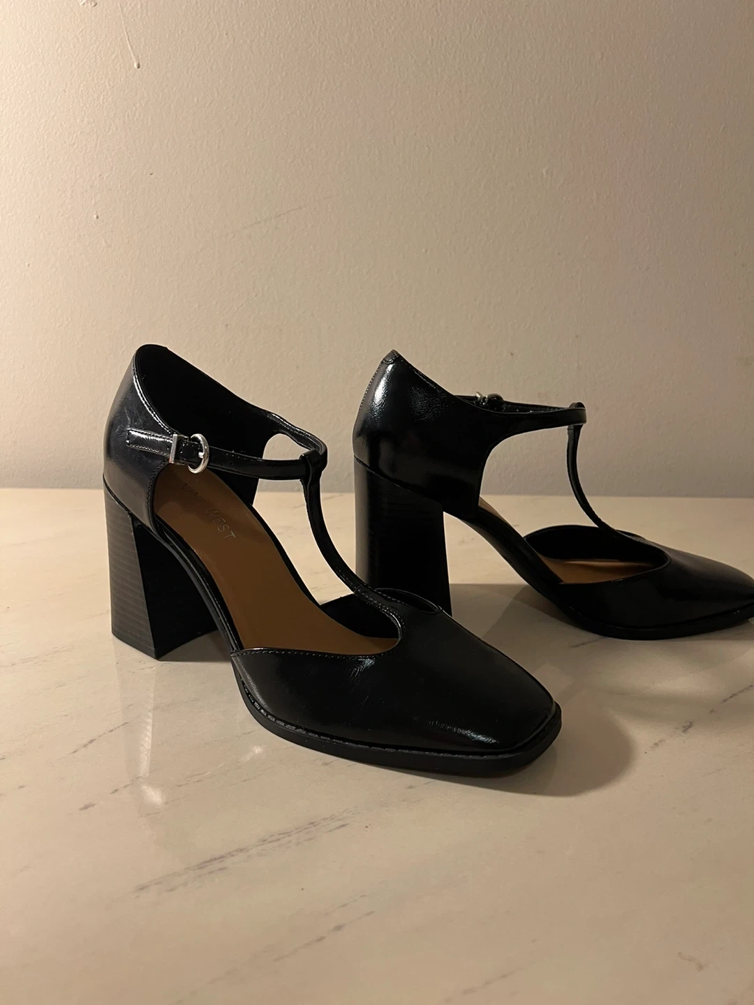 Here are some Nine West black heels! They have a block heel and a strap across the top of the foot. Great for dressing up or down