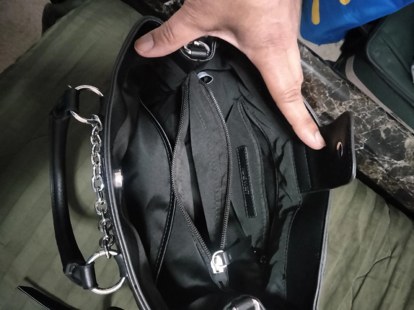 Selling a Nine West black quilted handbag! It features a chain detail on the handle and a spacious interior with multiple compartments. It has a shoulder strap.