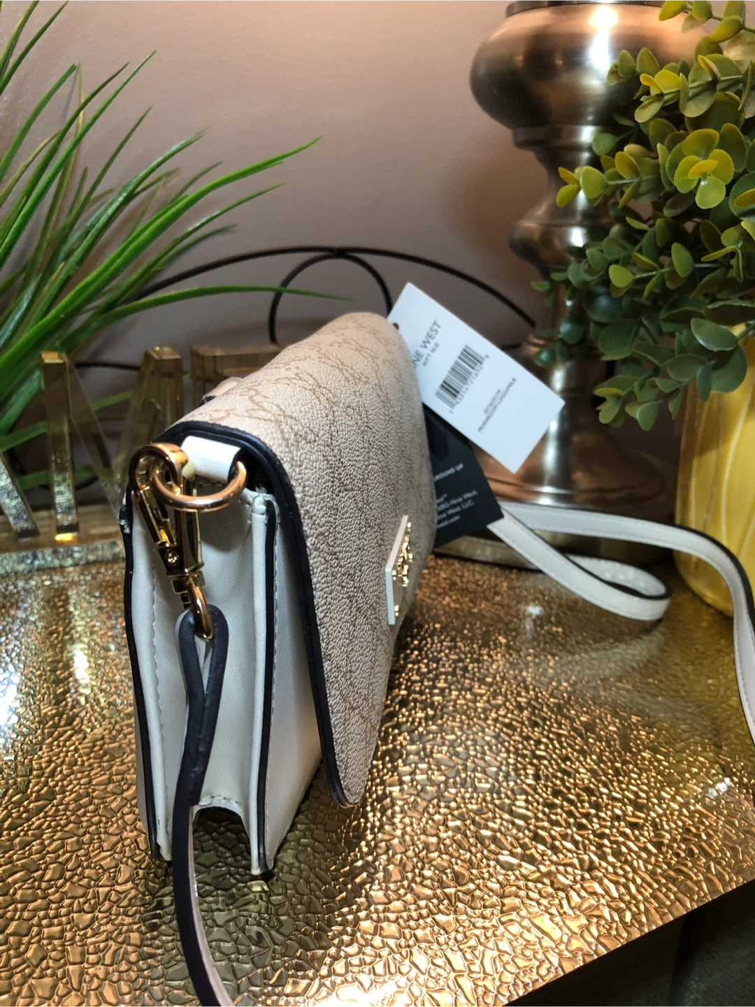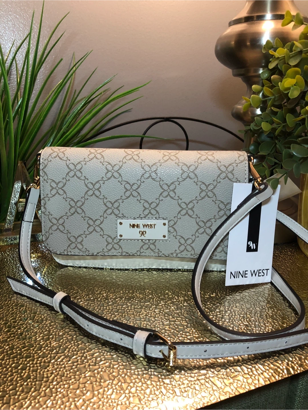 15This is a Nine West crossbody bag in cream and beige. It features an all-over pattern and gold-tone hardware. Perfect for everyday use!