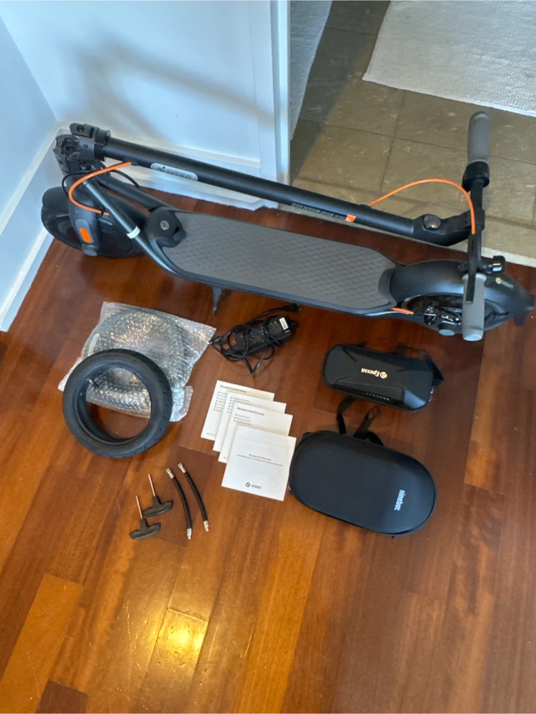 10Selling a Ninebot electric scooter in good condition! It comes with a variety of accessories, including a two spare tires, charger, tools, and carrying cases. Everything you need to keep your scooter running smoothly is included