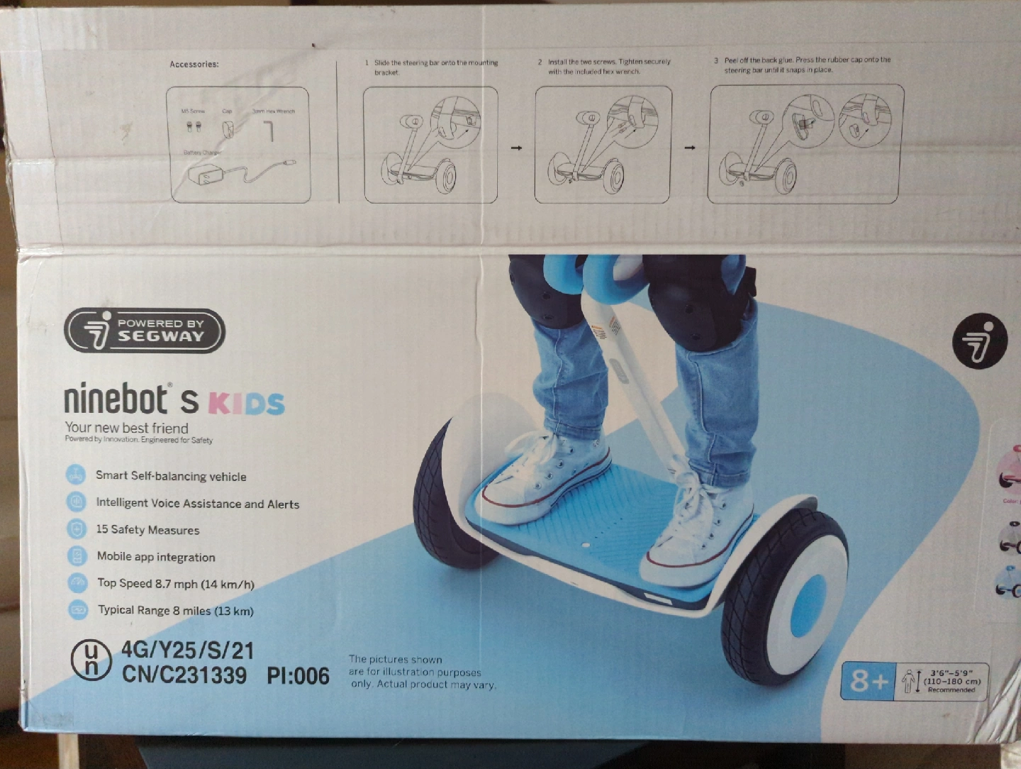 75Selling a Ninebot S Kids, powered by Segway! It's a smart self-balancing vehicle with intelligent voice assistance and alerts. It has 15 safety measures and mobile app integration. It can reach a top speed of 8.7 mph (14 km/h) and has a typical range of 8 miles (13 km). Recommended for ages 8+ and heights 3'6"-5'9" (110-180 cm).